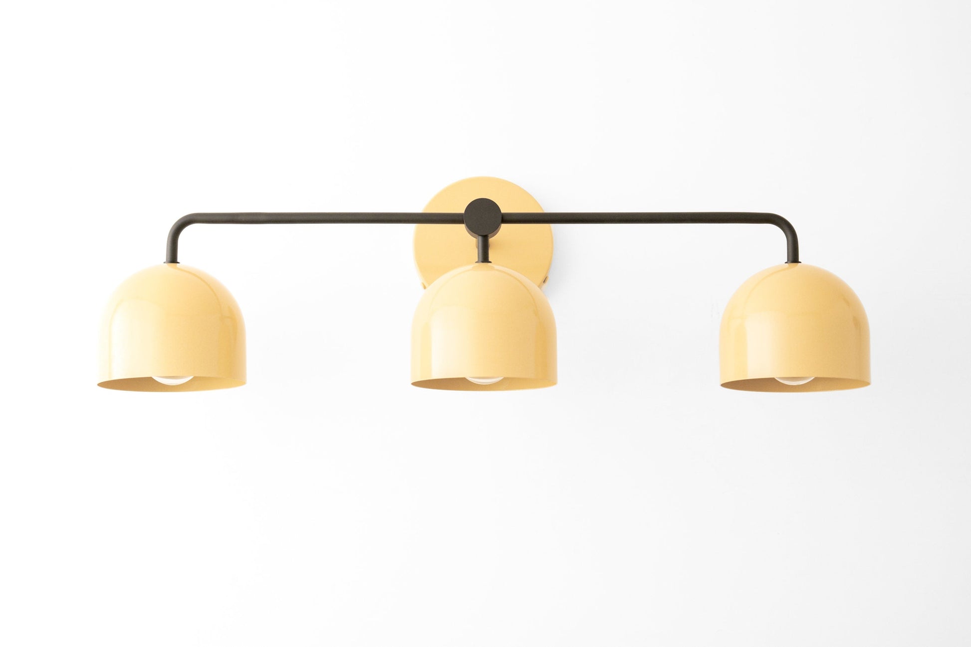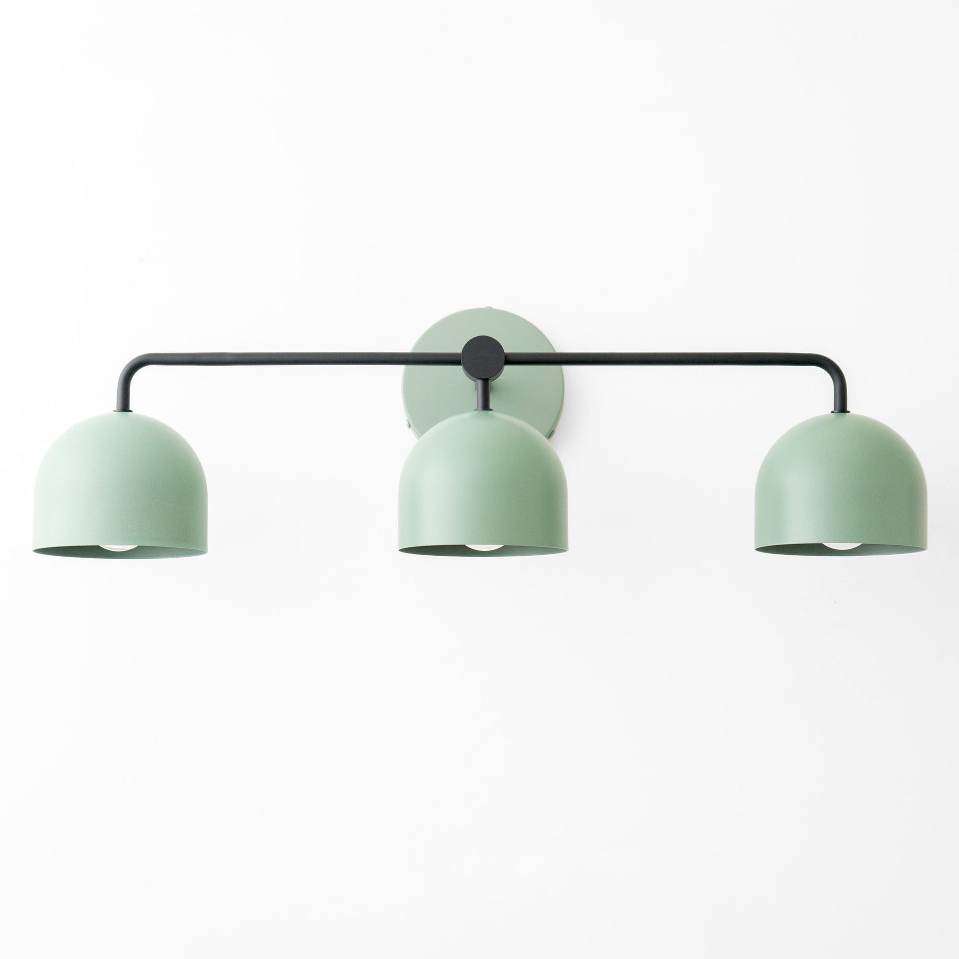 This minimalist inspired 3 bulb vanity light fixture features deep dome shades, black accent arms, and your choice of black, white, or color canopy backplate and shades.