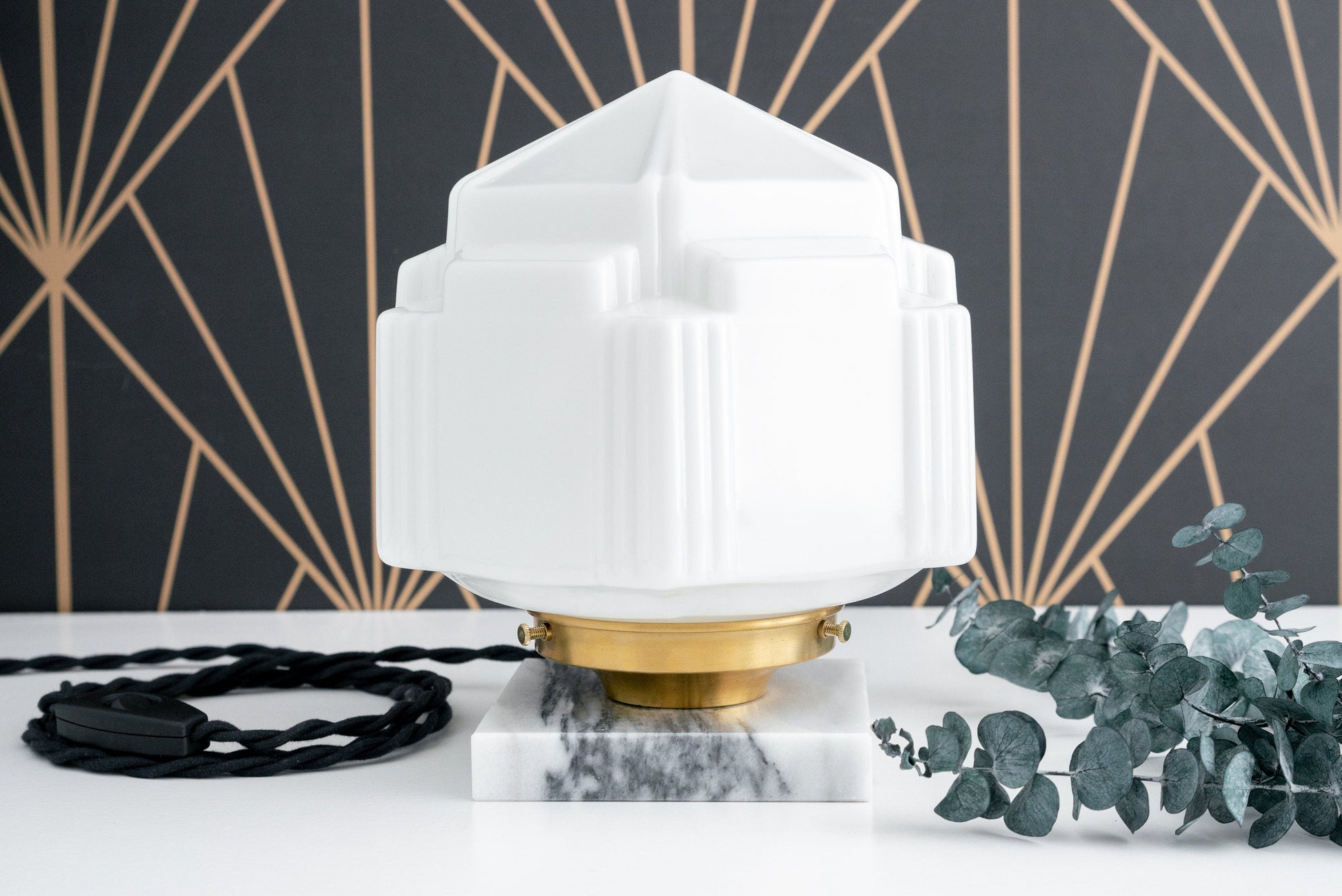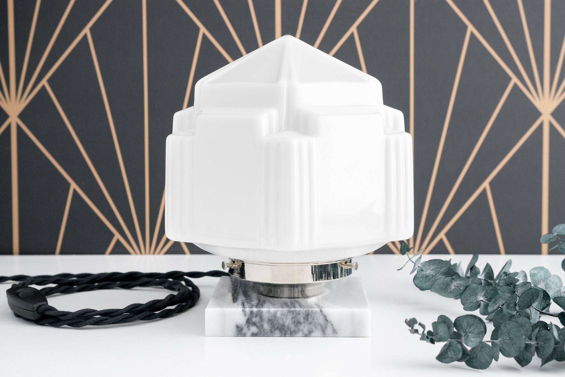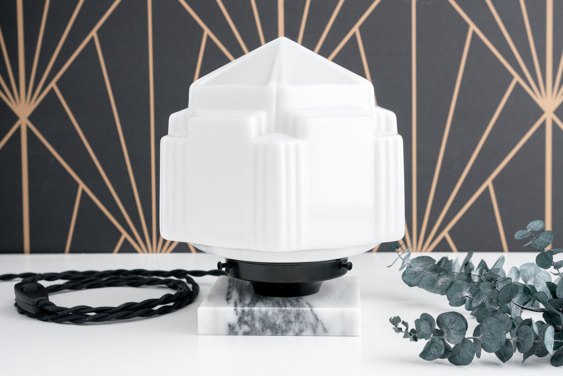 Perfect for leaving a big impact in small spaces, this Art Deco inspired table lamp features a square solid marble base and a classic skyscraper globe. The milk glass globe is hand blown in an American foundry using the original 1930s glass mold.