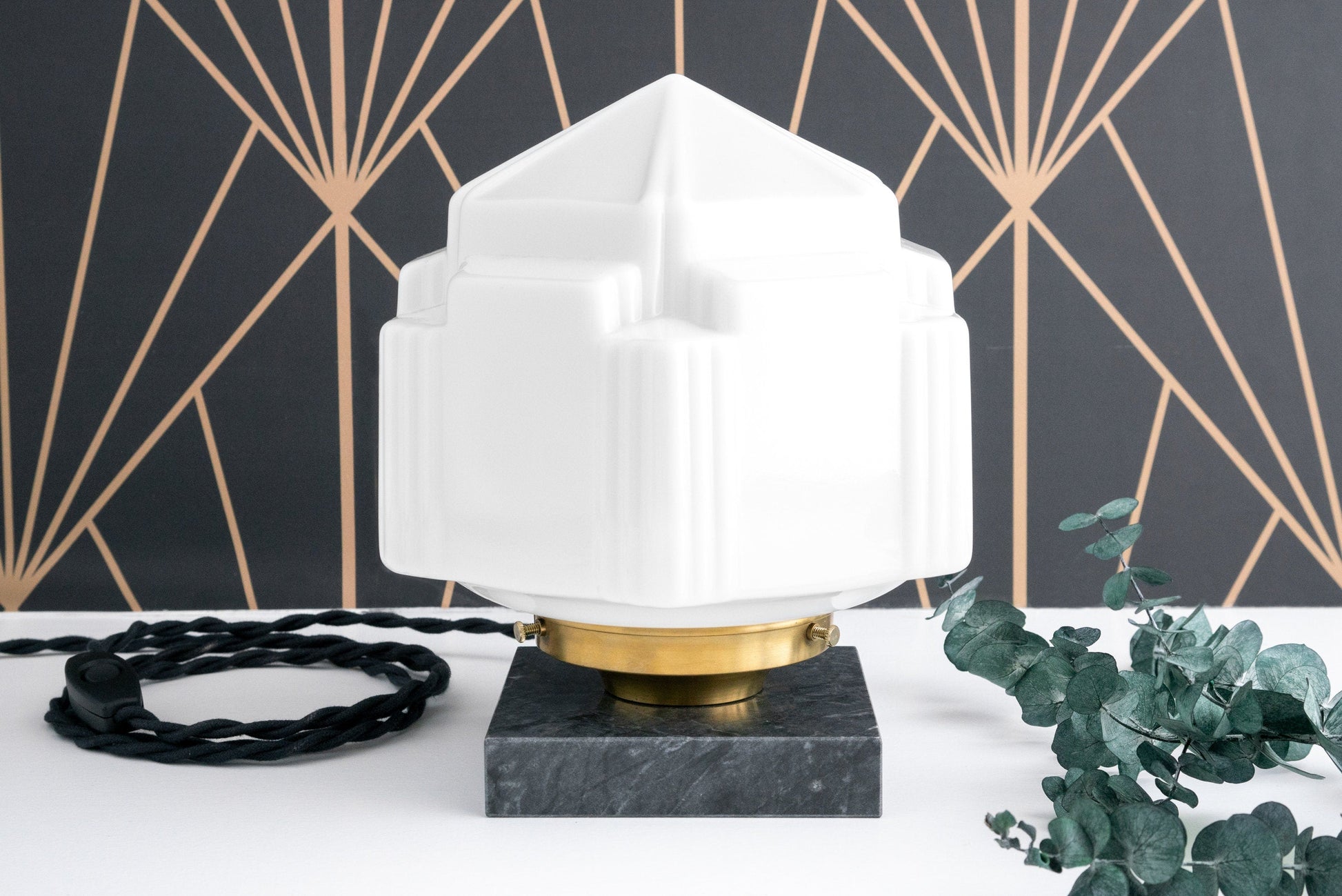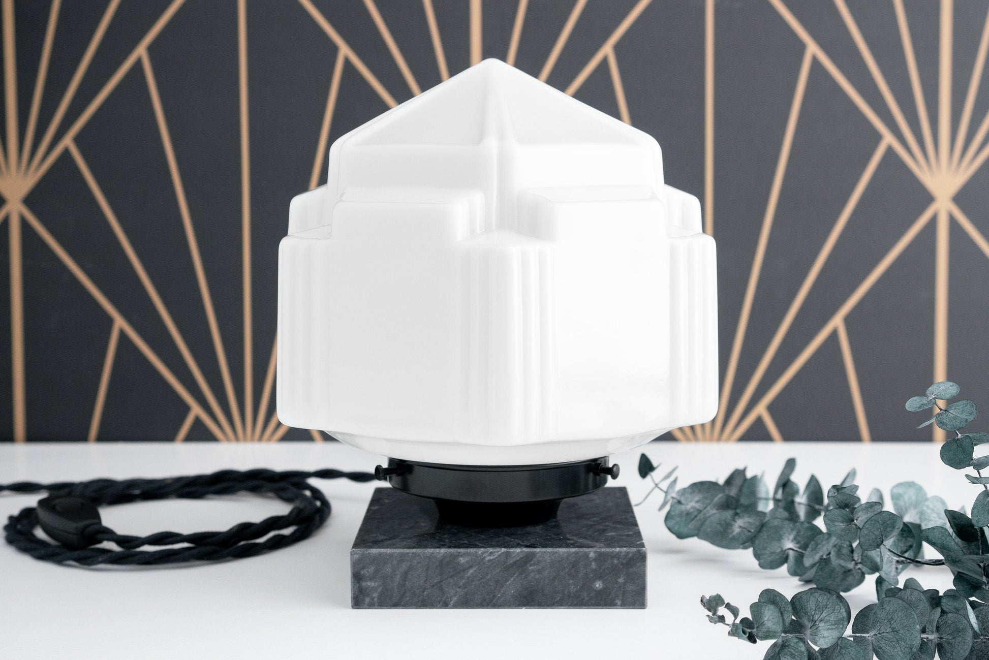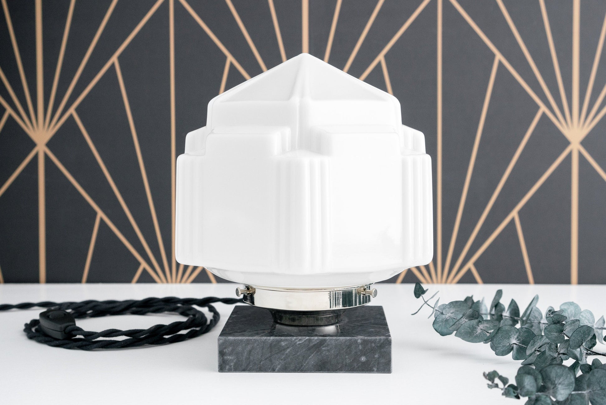 Perfect for leaving a big impact in small spaces, this Art Deco inspired table lamp features a square solid marble base and a classic skyscraper globe. The milk glass globe is hand blown in an American foundry using the original 1930s glass mold.
