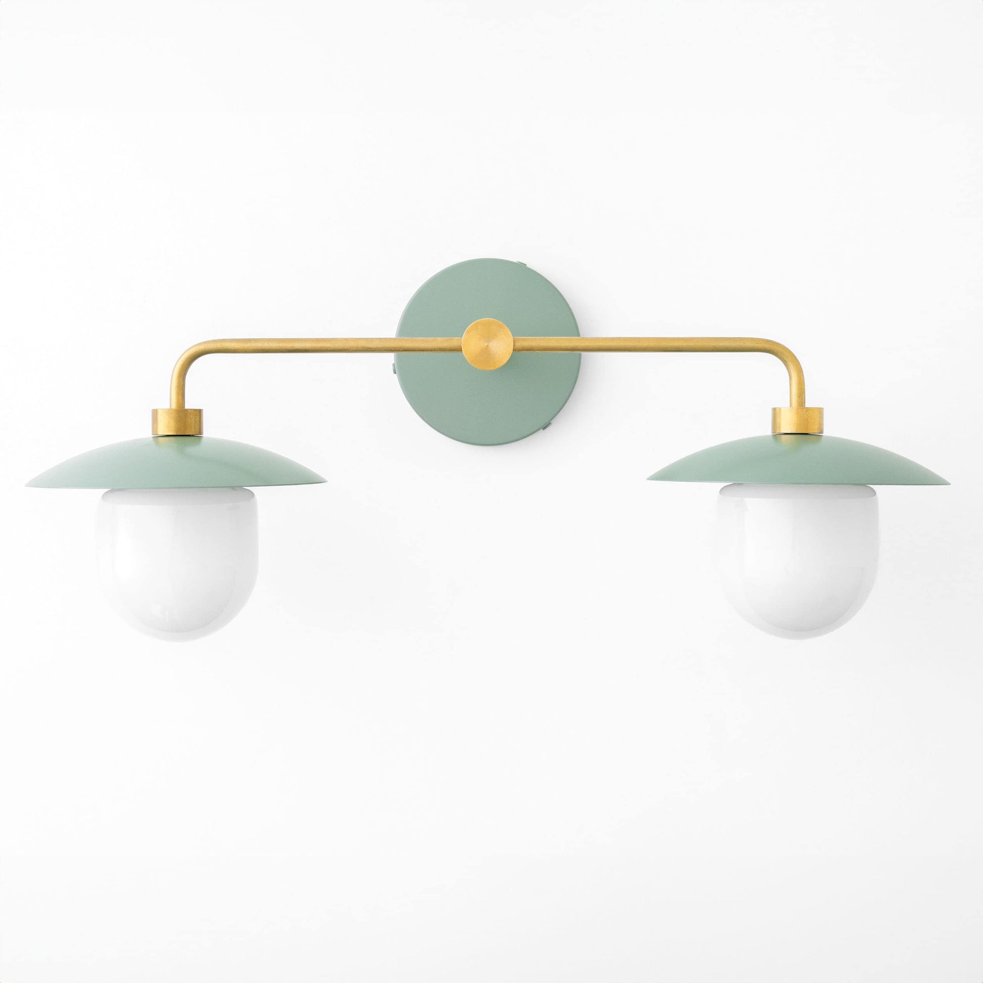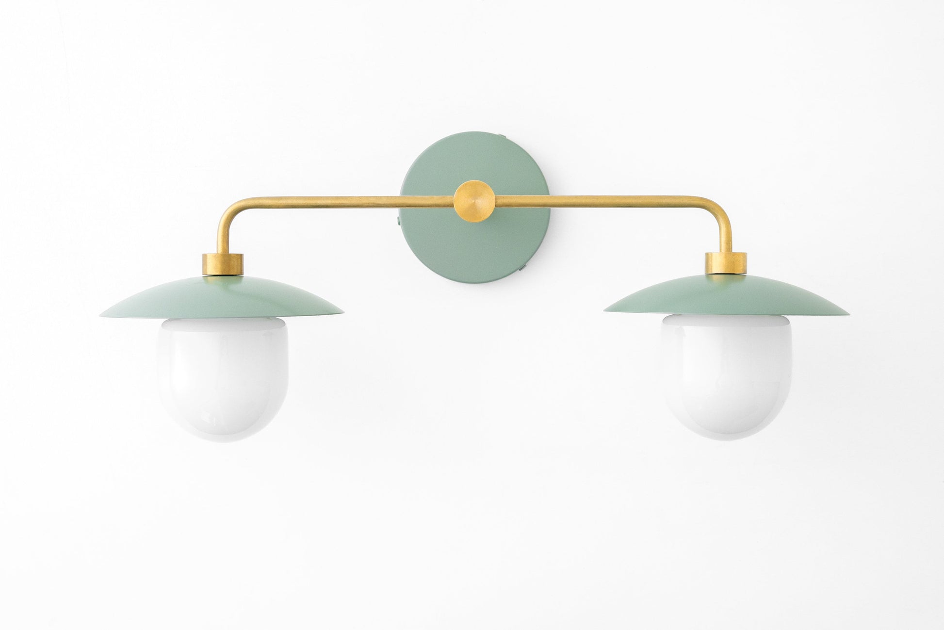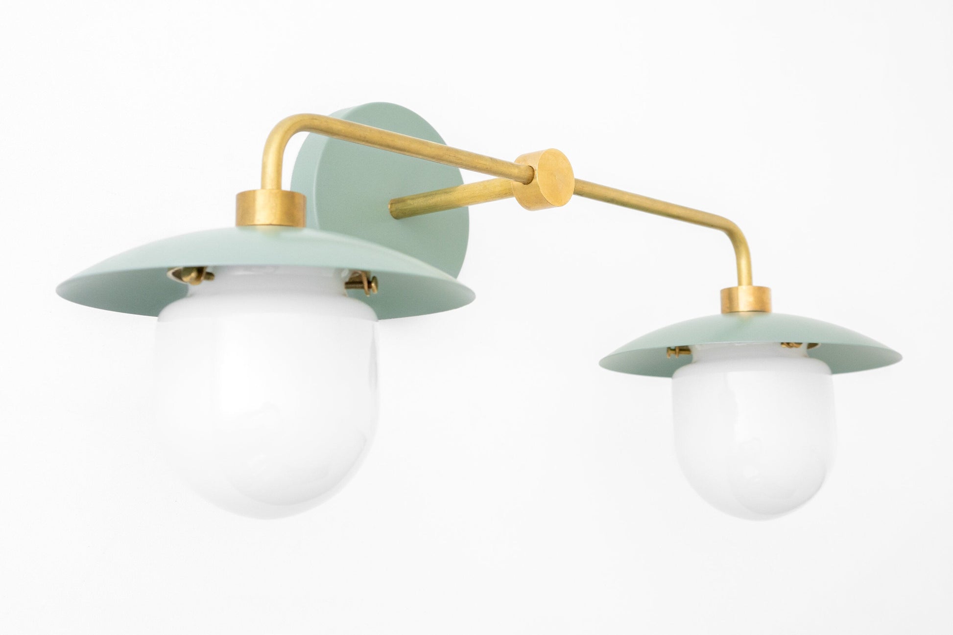 This Scandinavian inspired vanity light fixture features white opal glass bullet shaded globes.