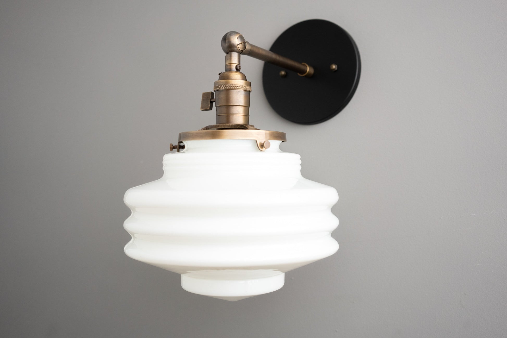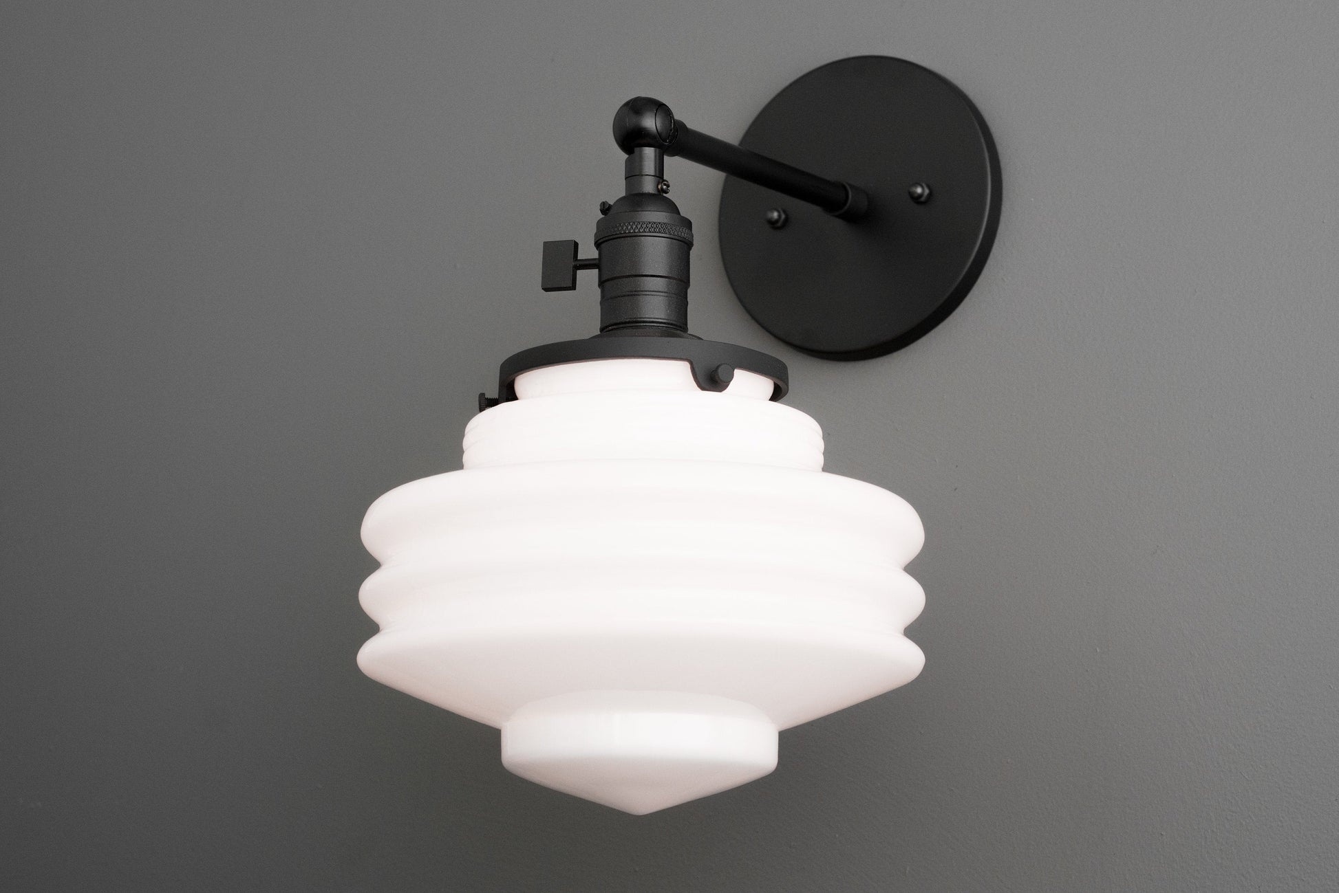 Mixing the utilitarian look of industrial lighting and the decadence of Art Deco this sconce is a unique lighting choice. The traditional opal glass ribbed globe is hand forged in an American foundry.