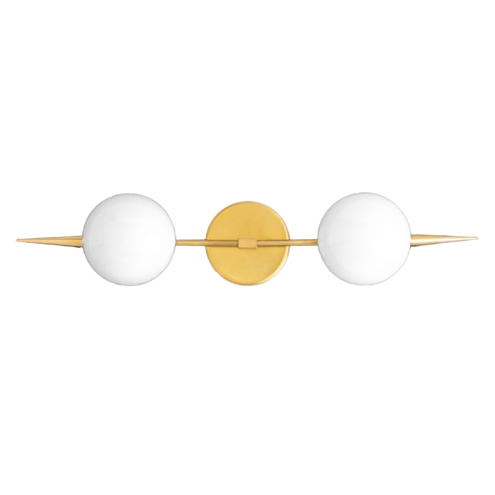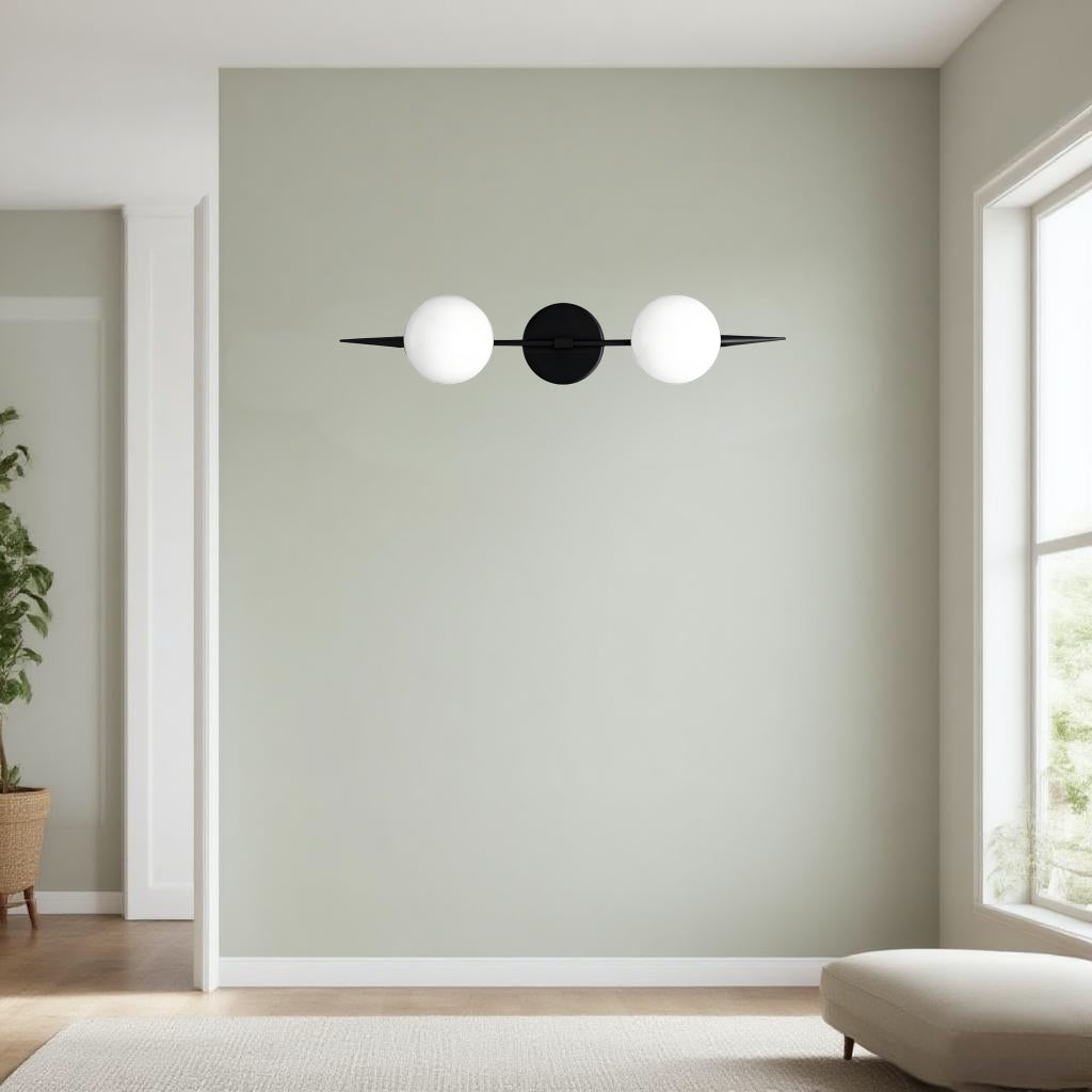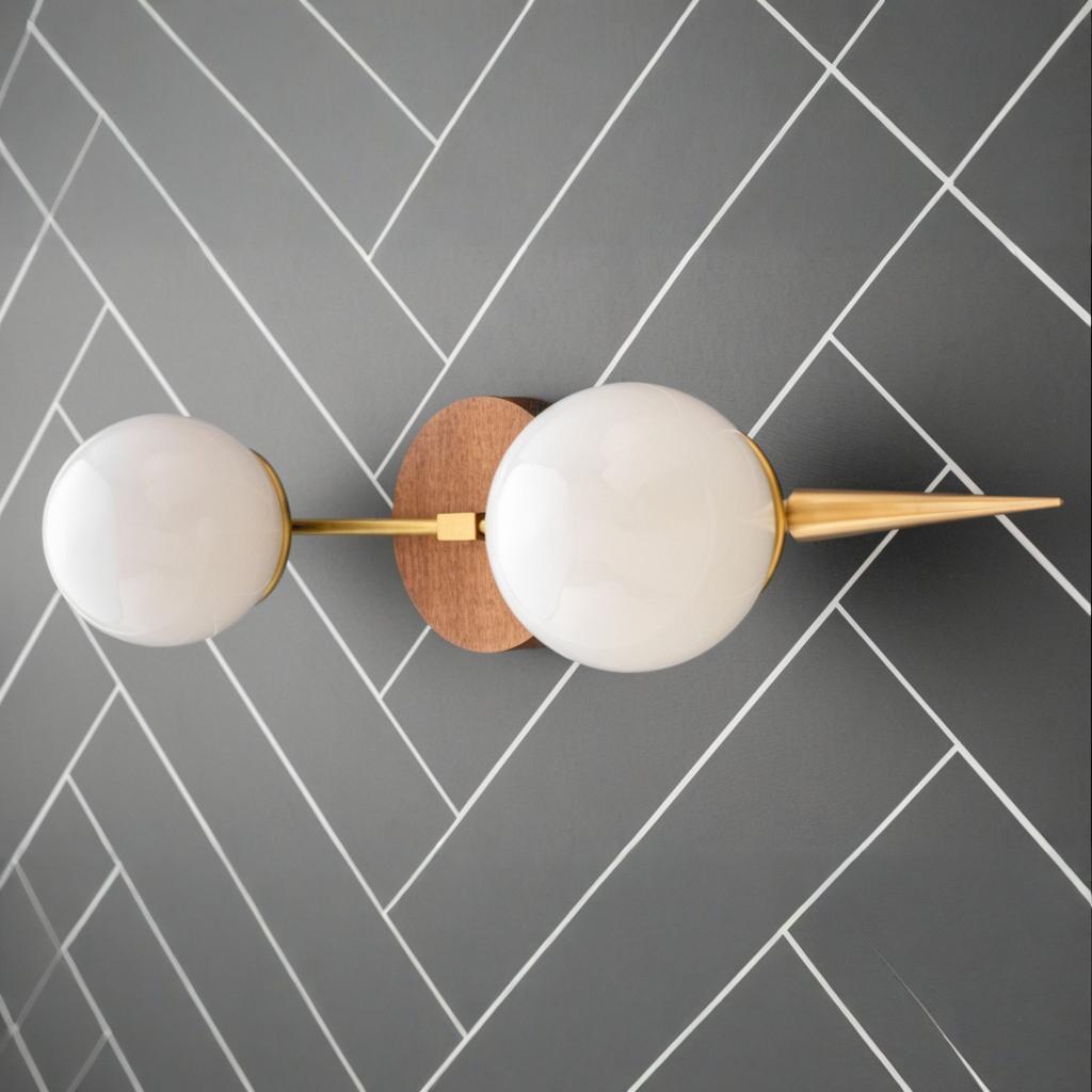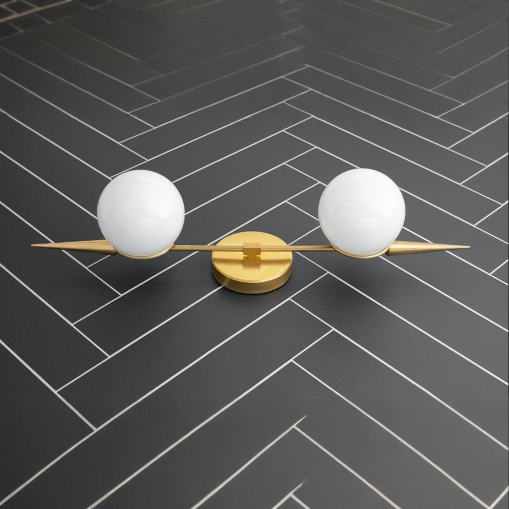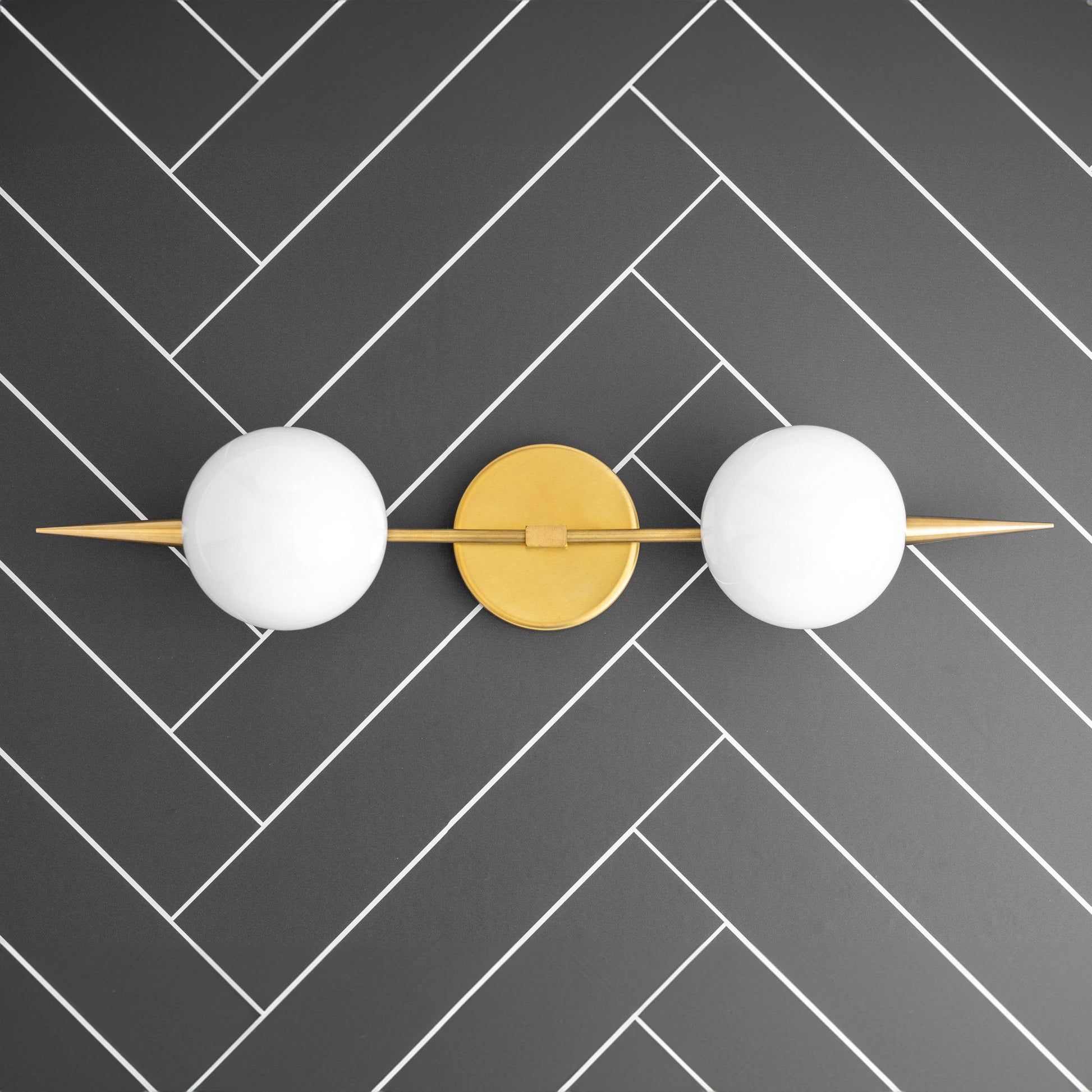 This Scandinavian inspired low profile vanity light fixture 5inch glass globes and decorative solid brass.
