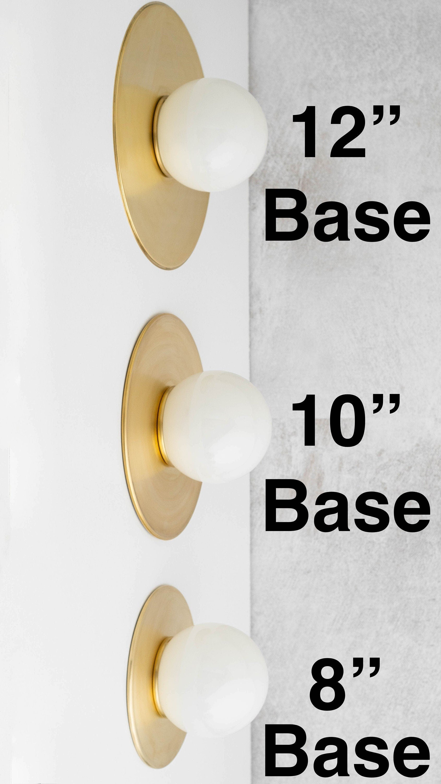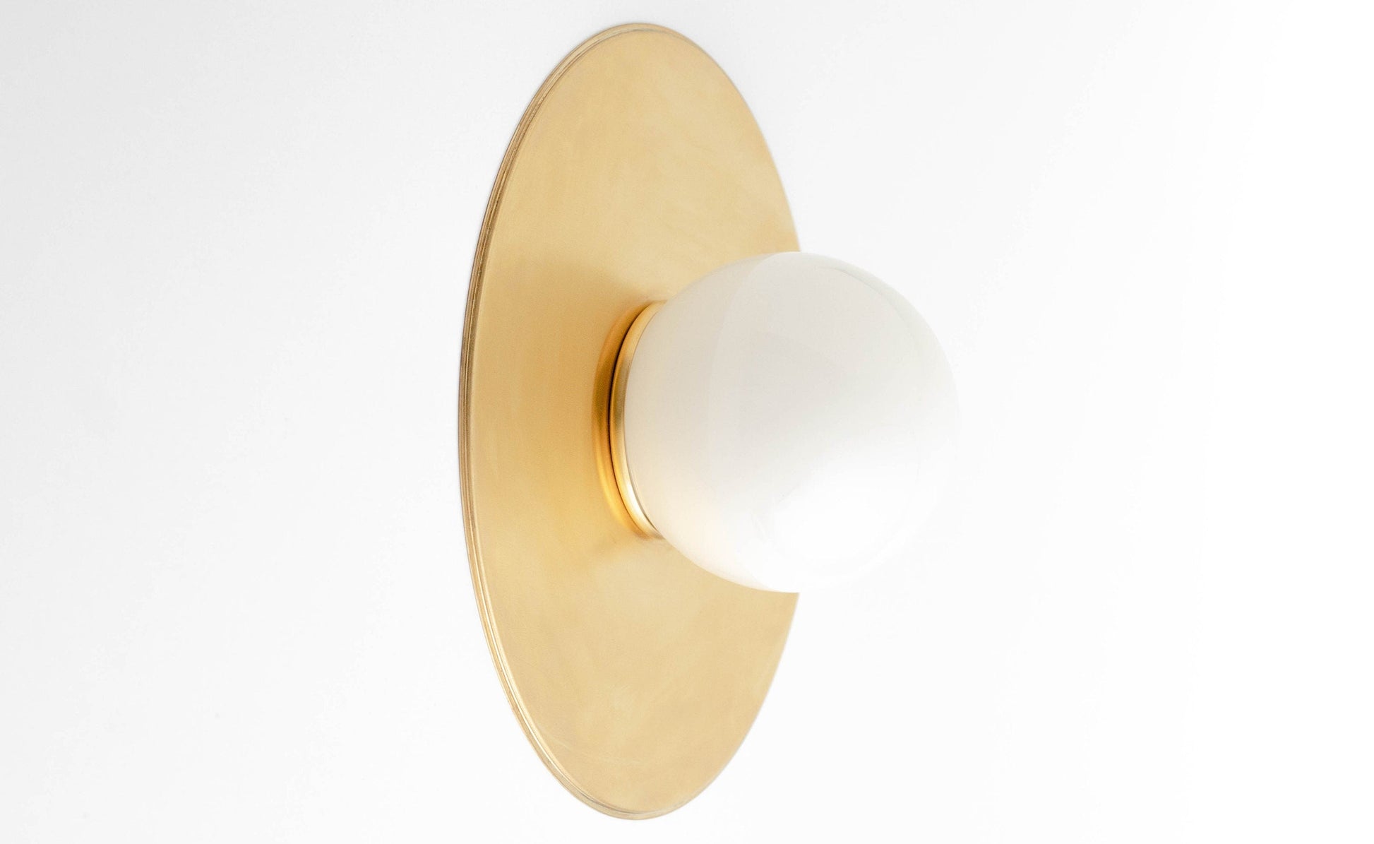 This low profile solid brass fixture sits almost flush against the wall or ceiling and is available in different sizes and finishes. We use a five inch globe to take up as little space as possible. This fixture looks amazing in the daytime and illuminates your house in the evening. It is a great addition to any modern space.