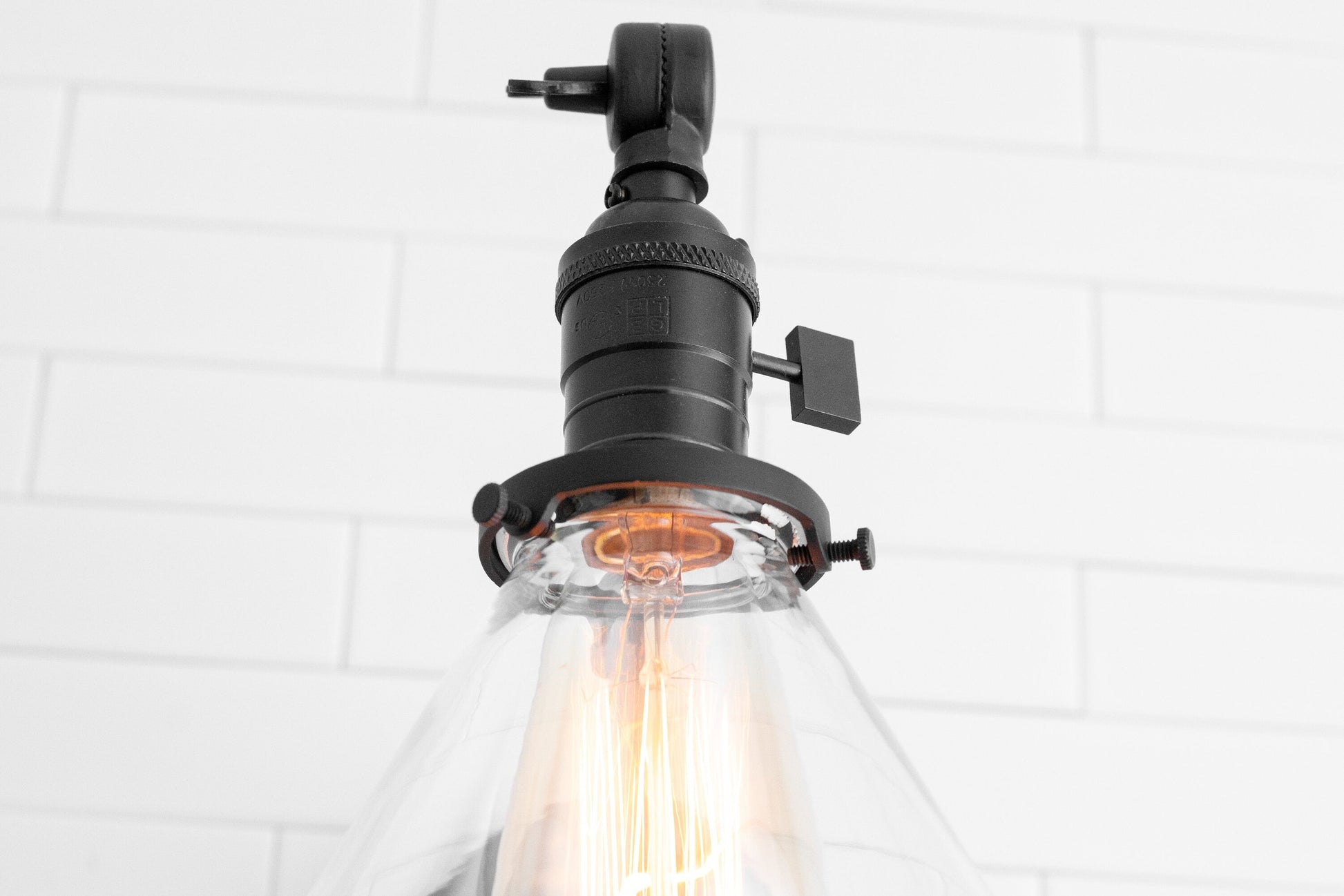 This industrial farmhouse wall sconce features a 7inch hand blown clear glass cone shade. The light fixture can be turned on/off using the key switch located on the socket and the vertical position and shade tilt are adjustable.