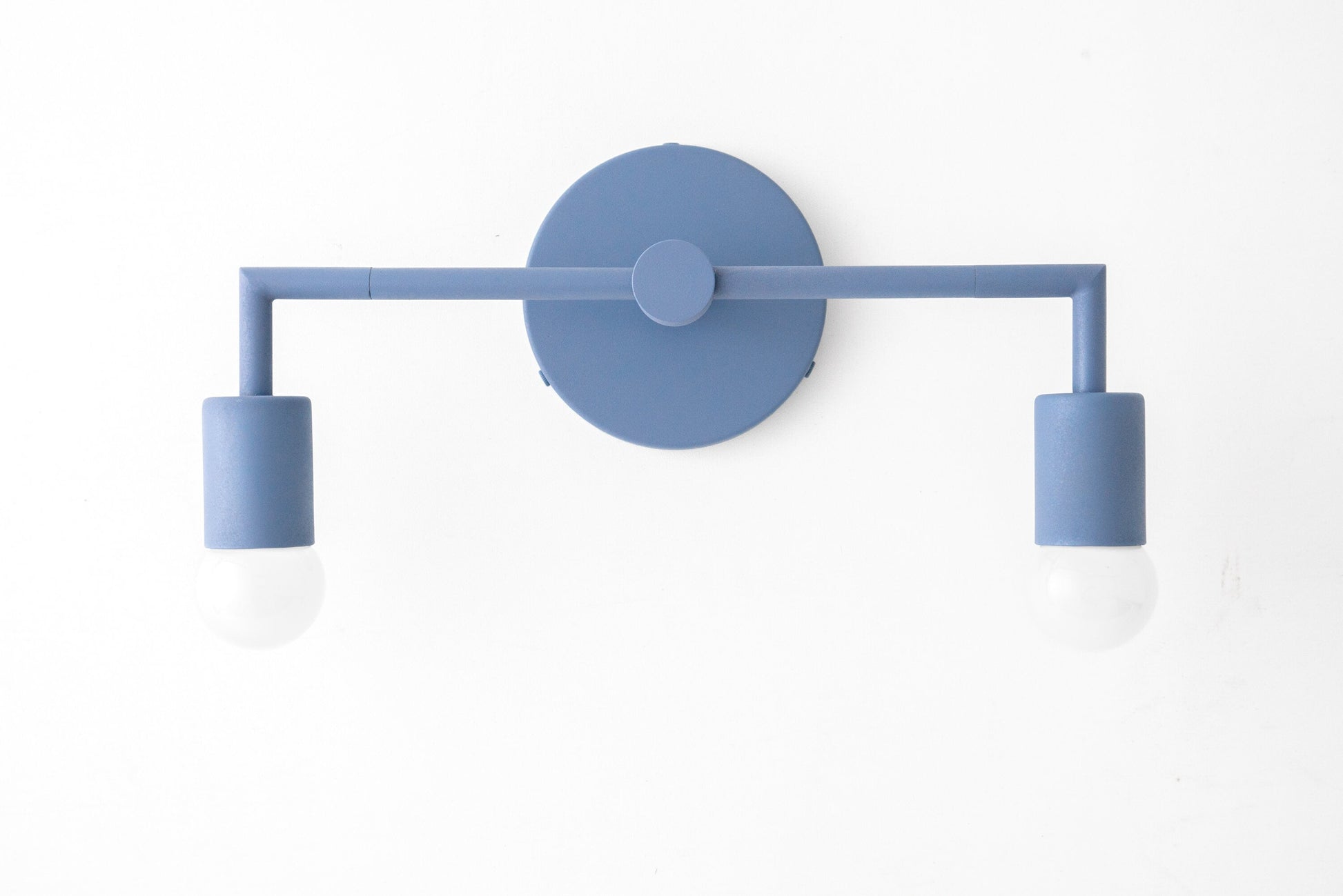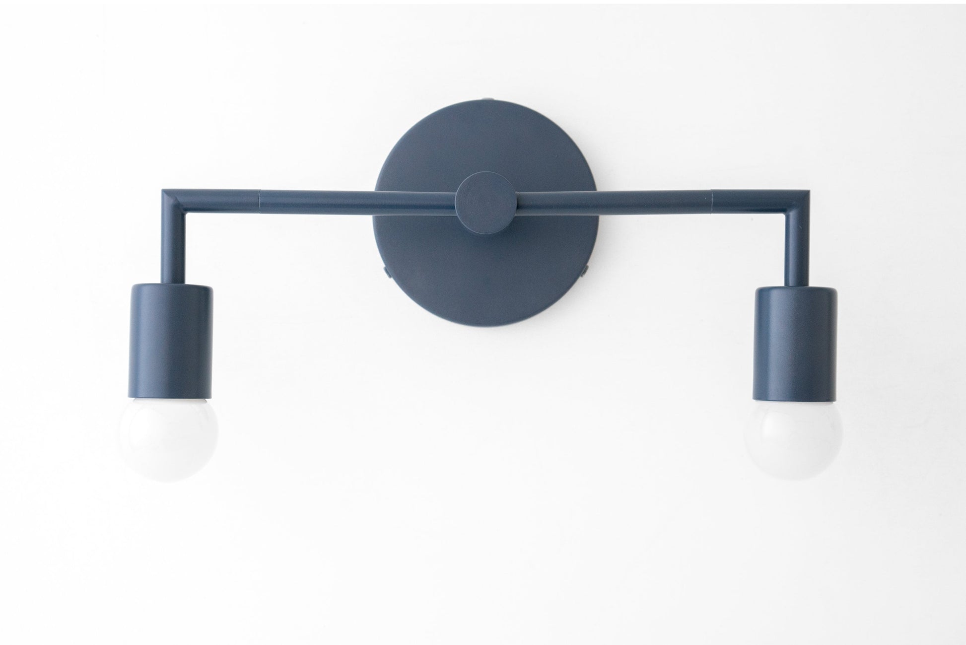 This colorful vanity light fixture features a minimalist inspired design with sharp right angles.
