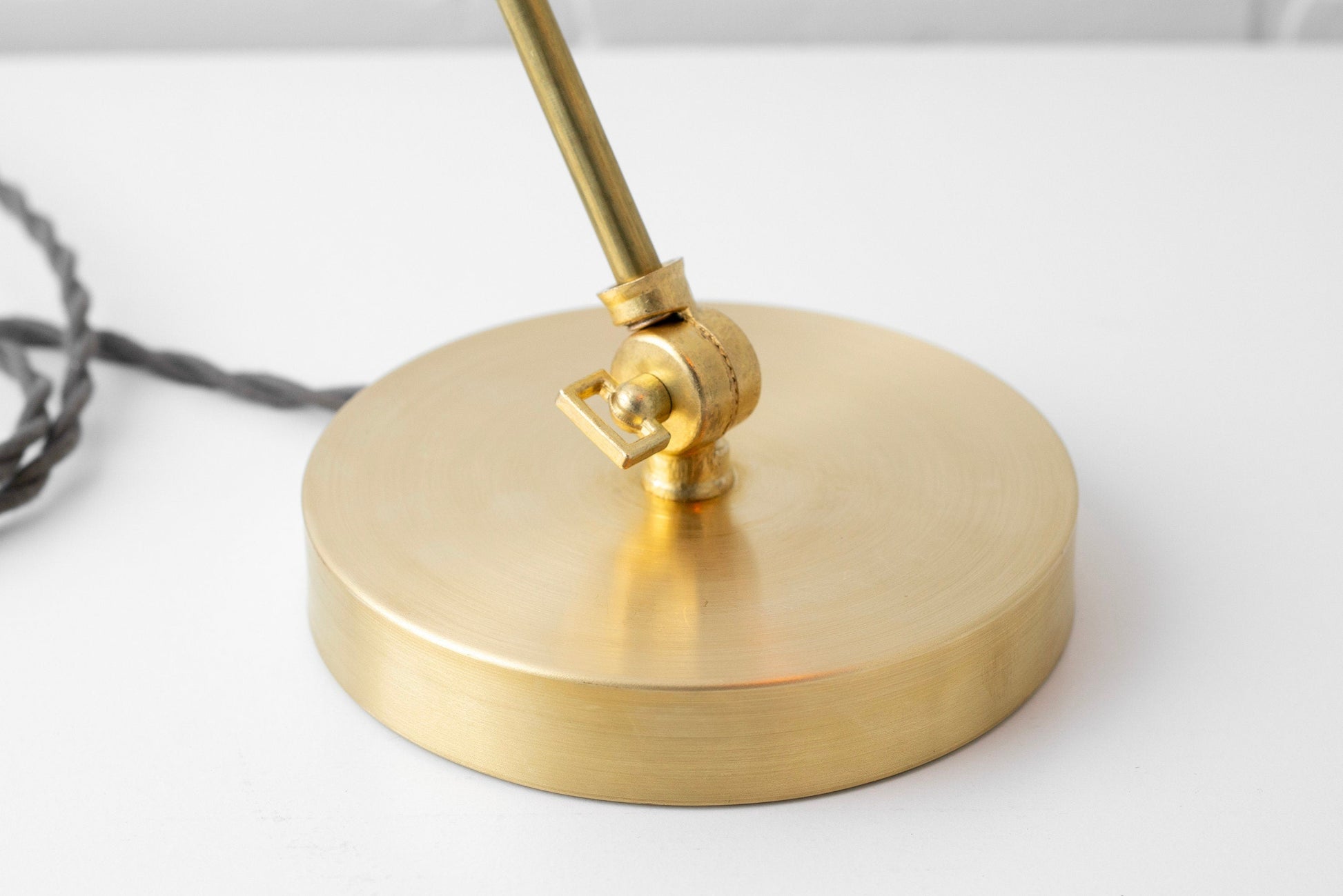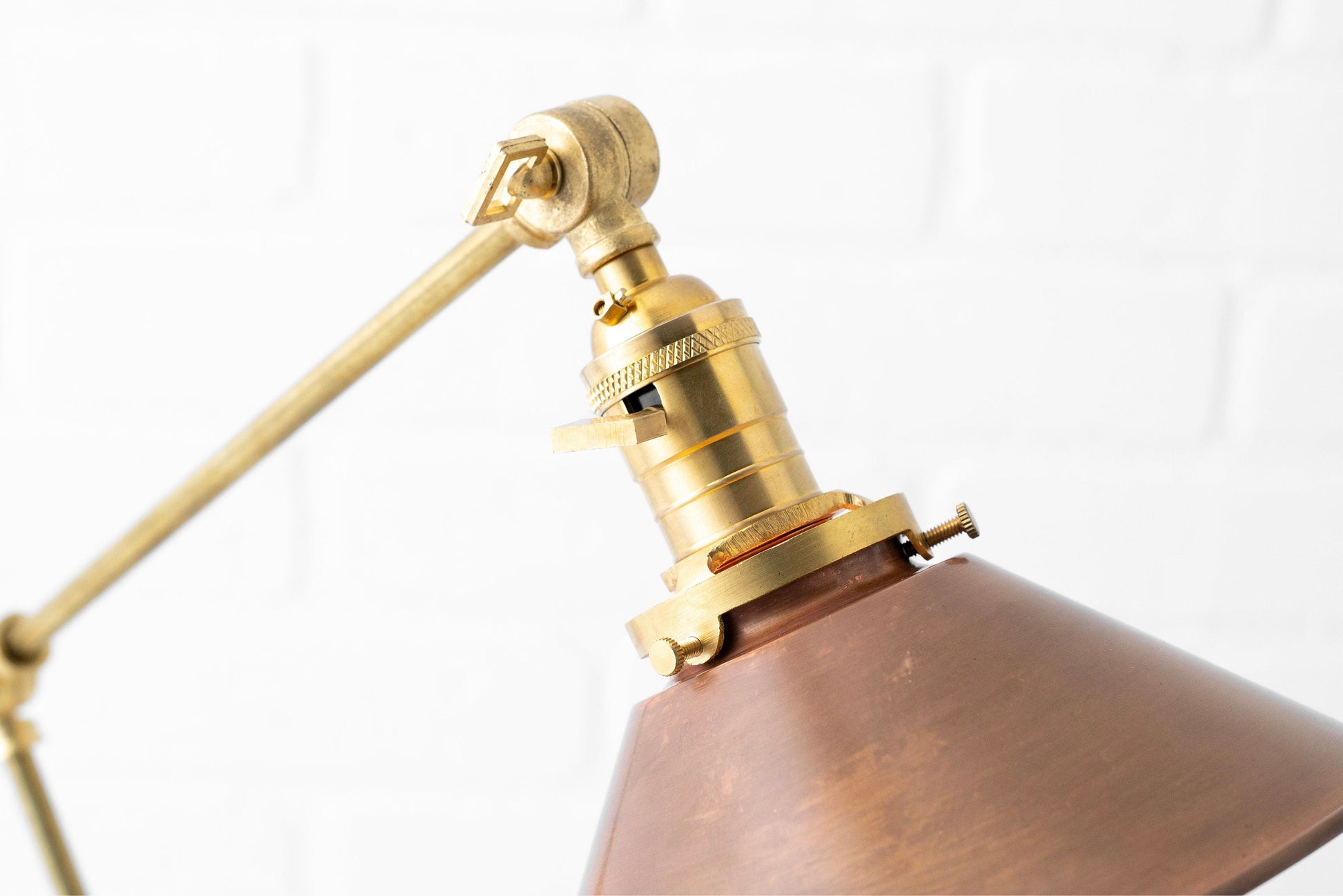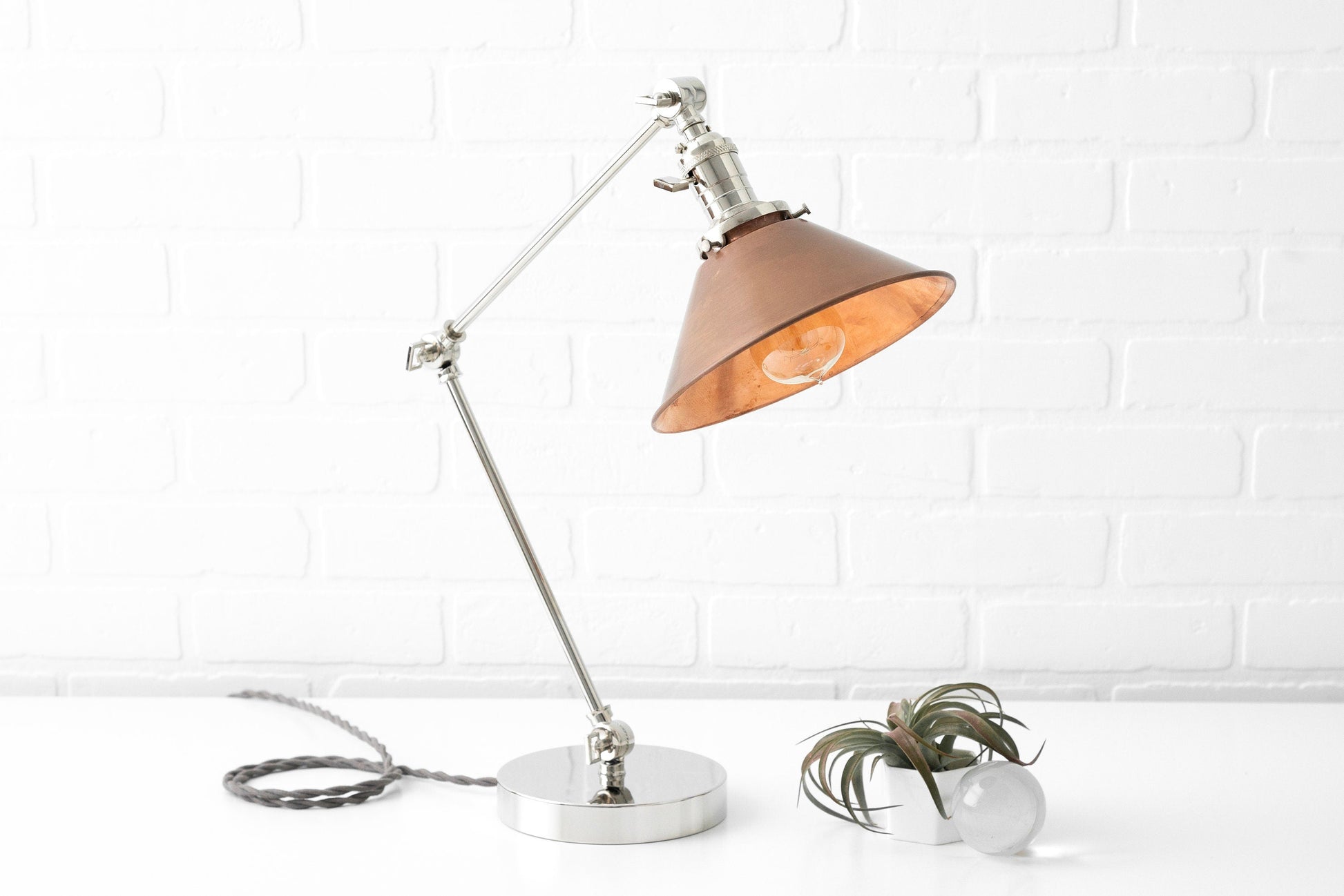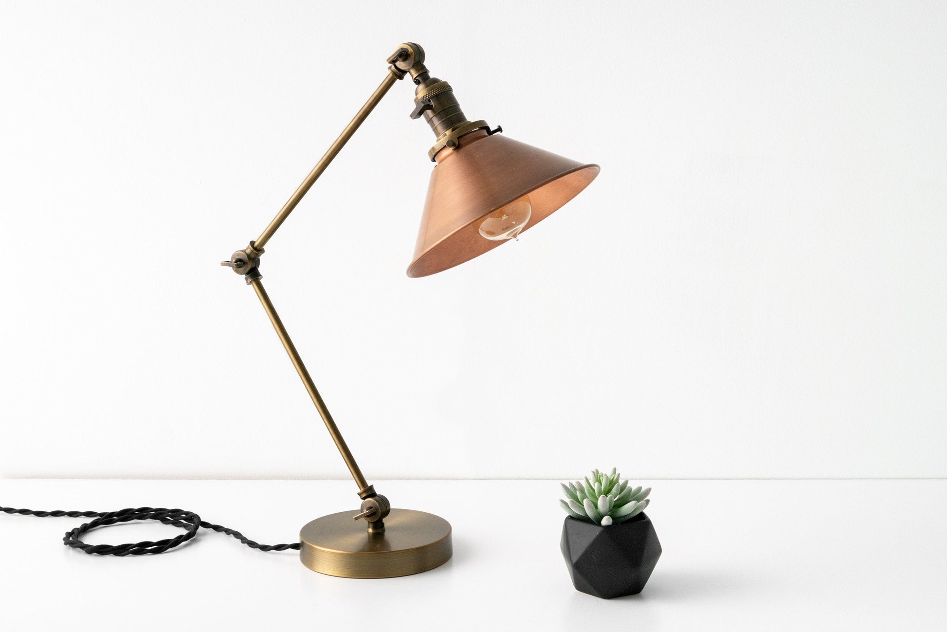 The aged copper shade reflects the light from the Edison bulb in soft amber tones. This lamp is good for use as a directional desk light for reading or for mood lighting in any room. The lamp is fully adjustable at the articulation points. The copper shade is hand aged in our shop giving each shade a slightly unique look.