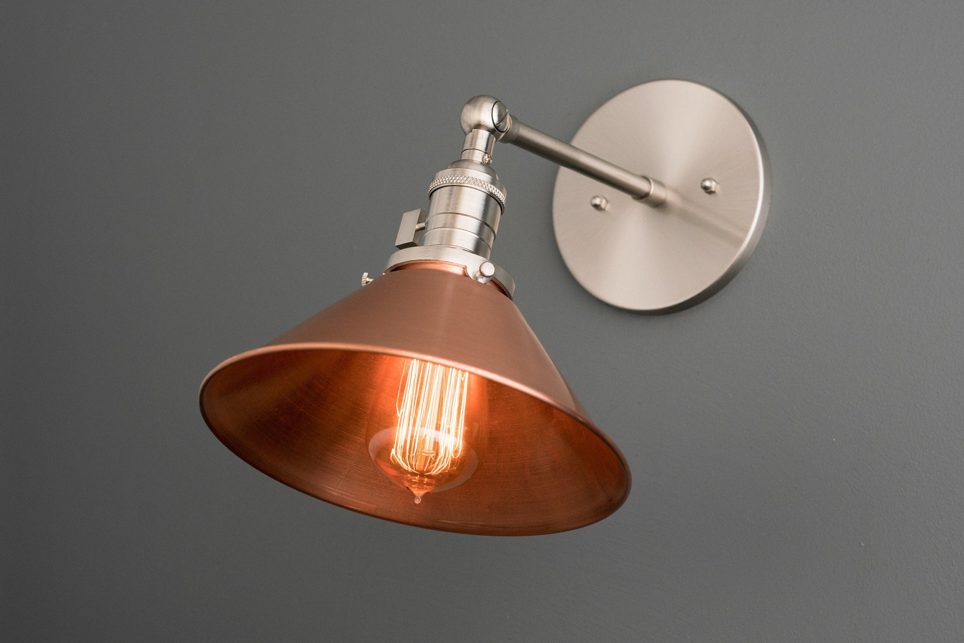 This industrial wall sconce features a hand aged solid copper shade. Each shade is individually aged giving it a unique look that will vary slightly for each shade.
