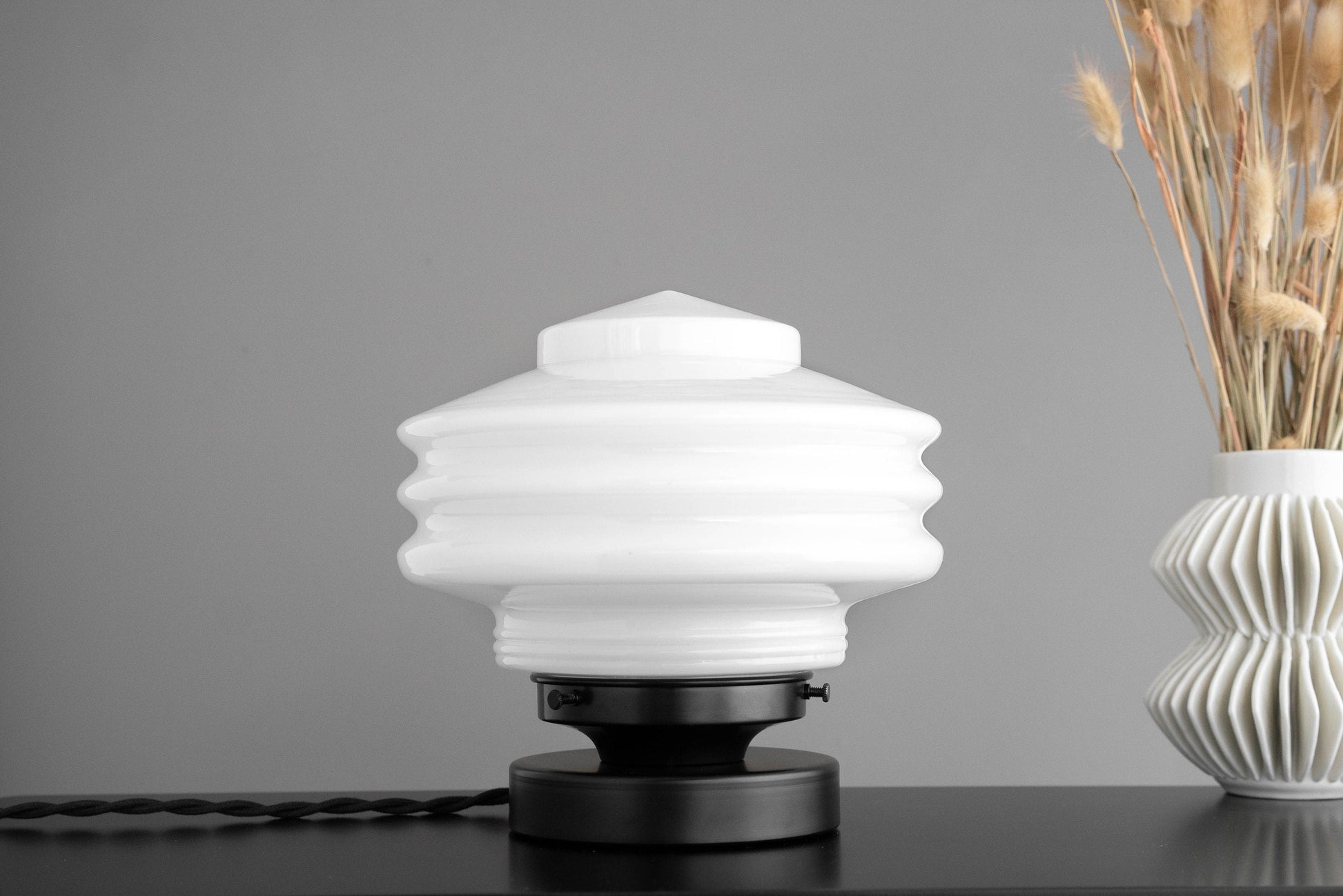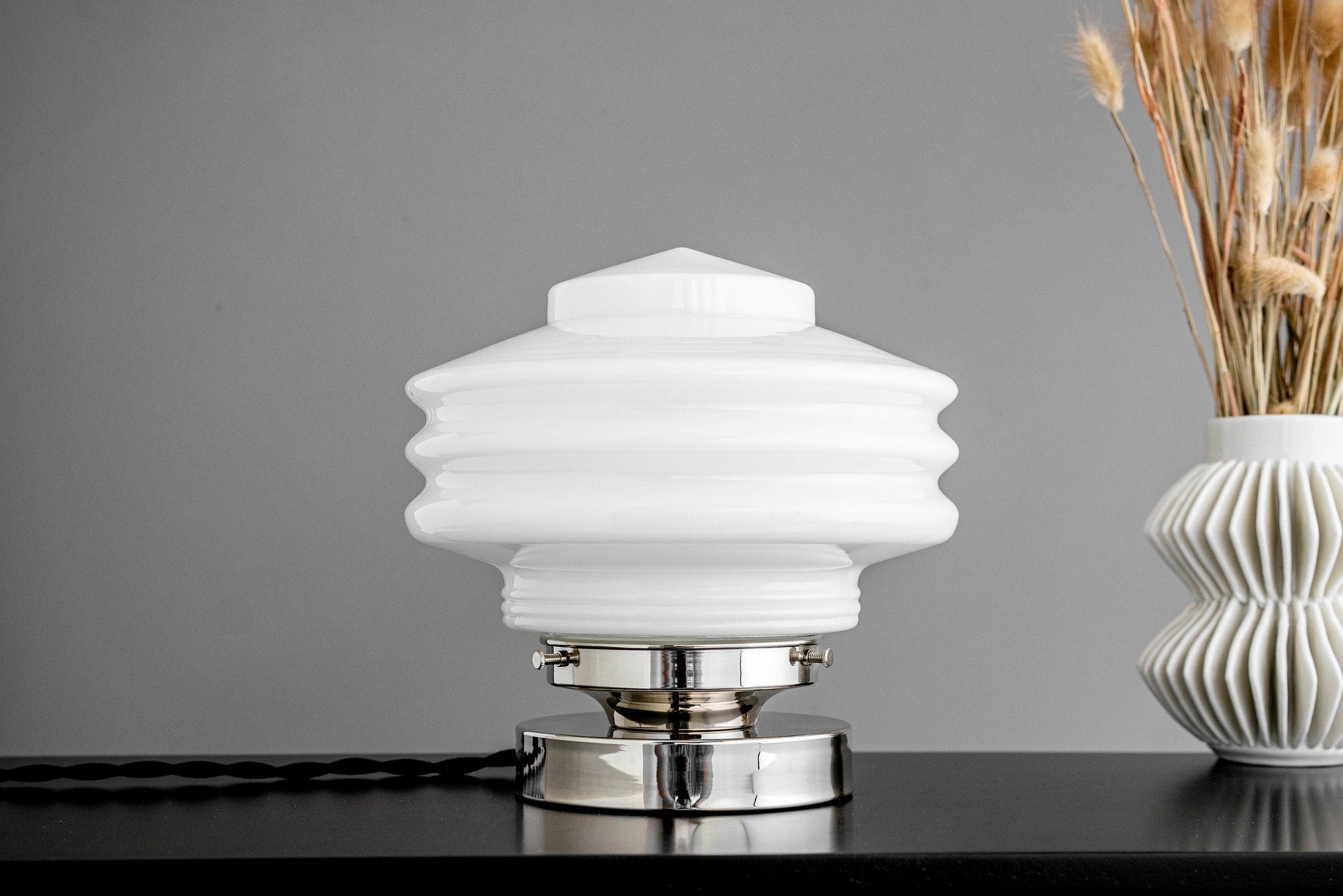 Light up your desk, hallway, or end table with this Art Deco inspired table lamp. It has a large deco style globe. The base is available in several finishes and variations.