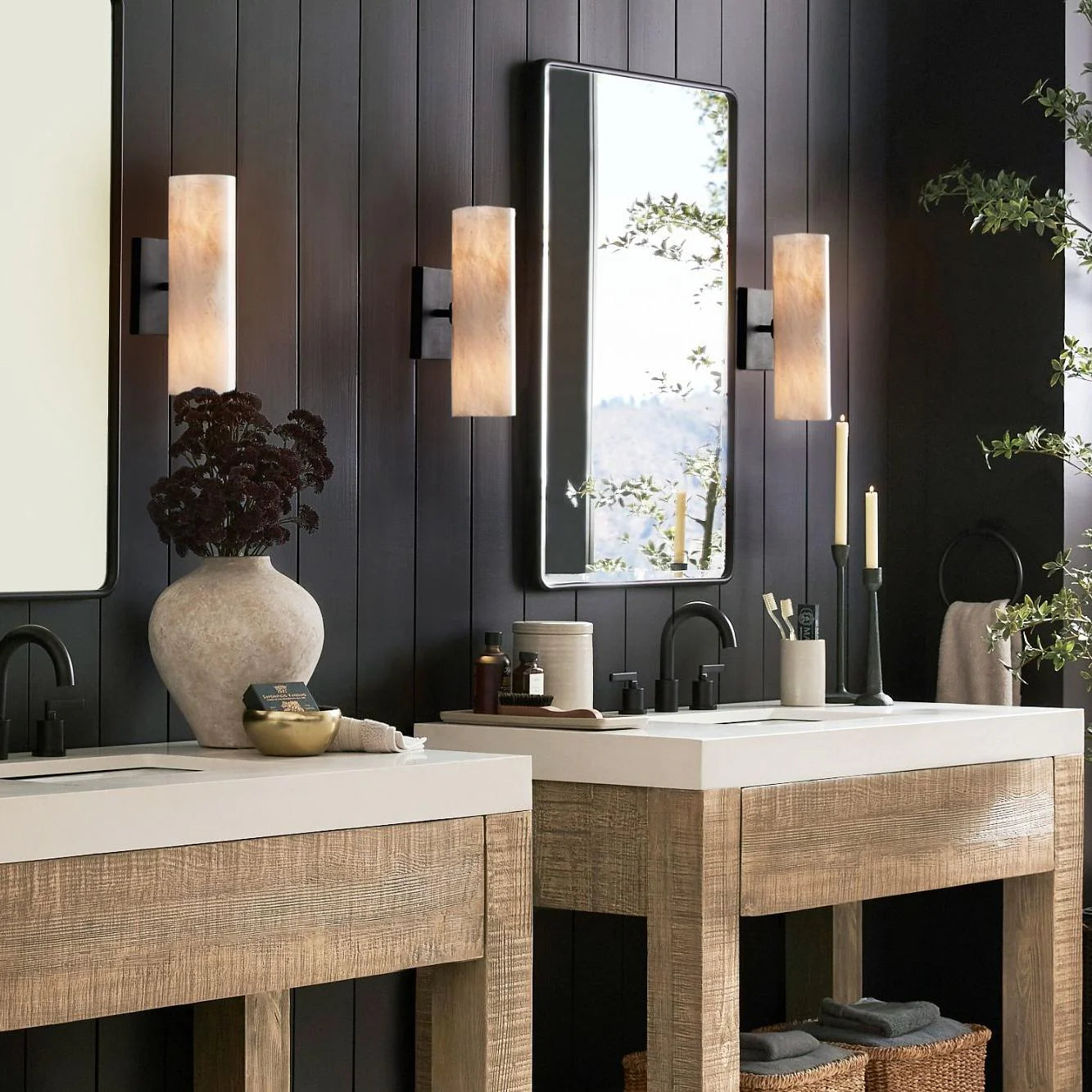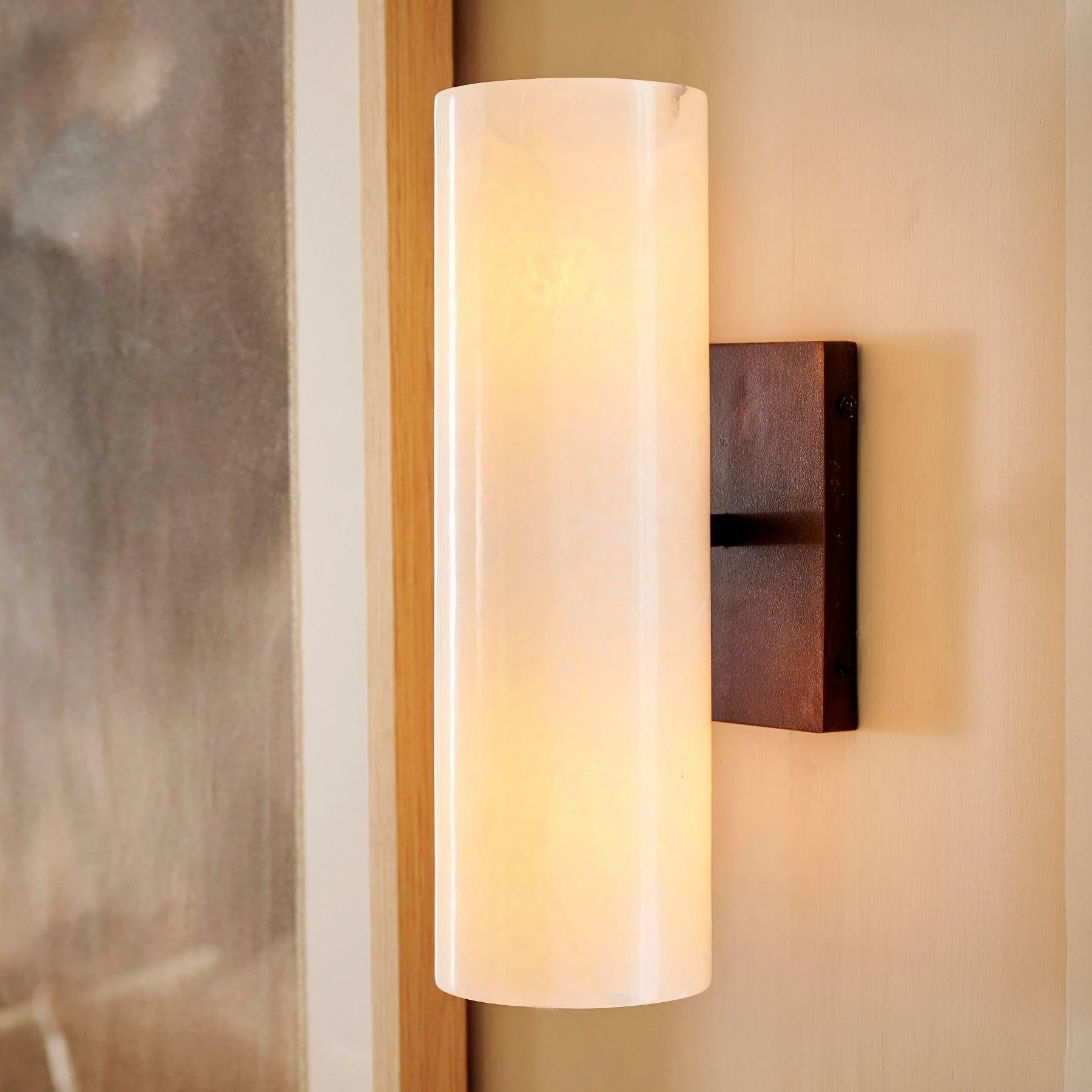 Its cylindrical alabaster shade reveals beautiful, organic veining that glows softly when lit—bringing warmth and subtle luxury to any room.Ideal for hallways, bedrooms, and bathroom vanities.