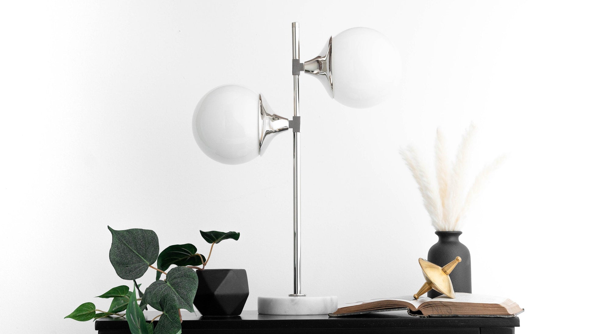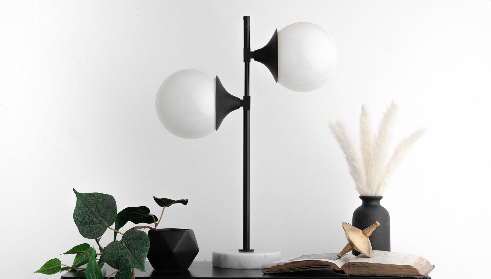 Inspired by mid-century designs with an organic flair, this globe table lamp pairs 5 inch opal globes with trumpet bell holders and finishes of with marble base. This table lamp would be great for any modern space that needs some extra light in the evening and an elegant showpiece in the daylight.