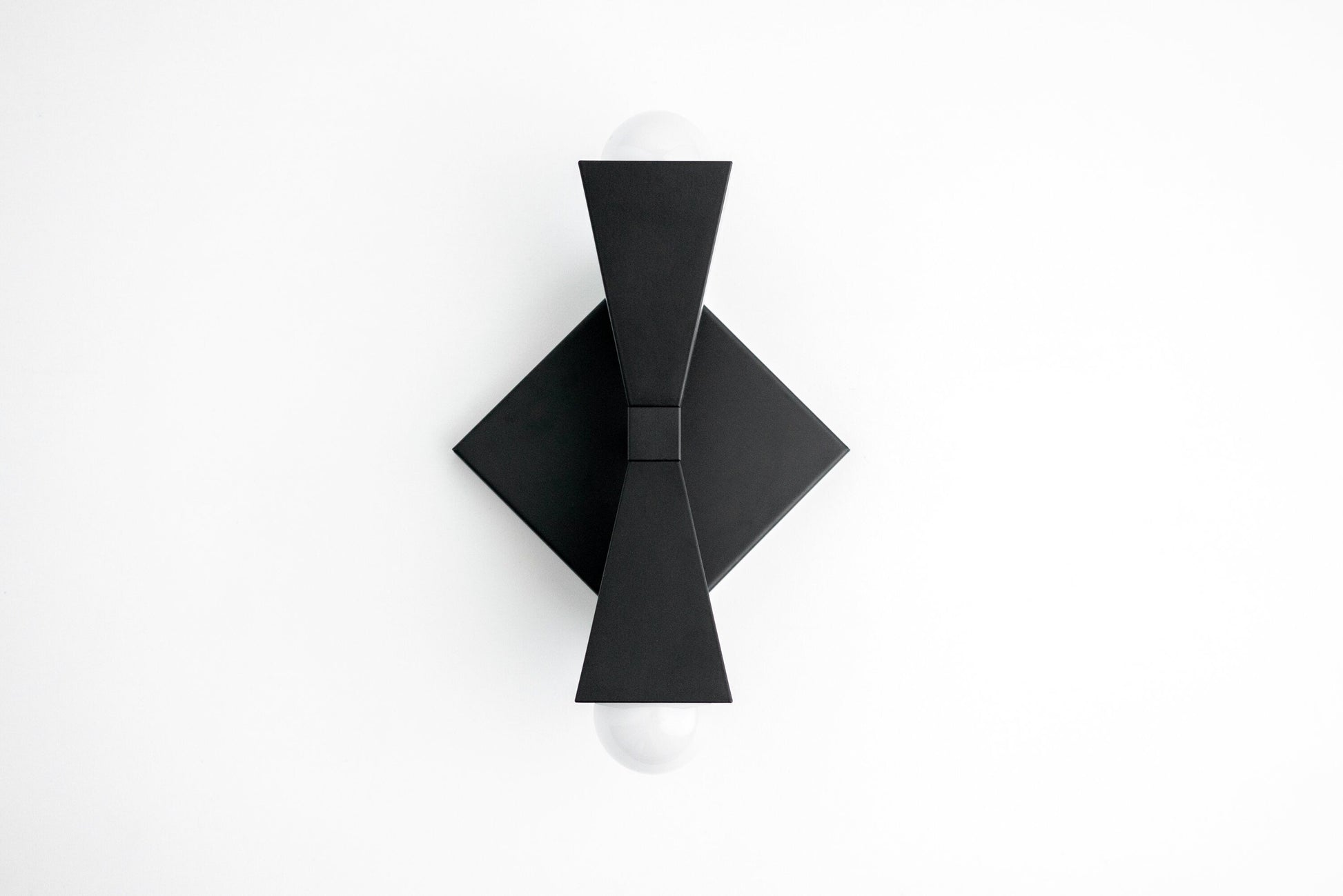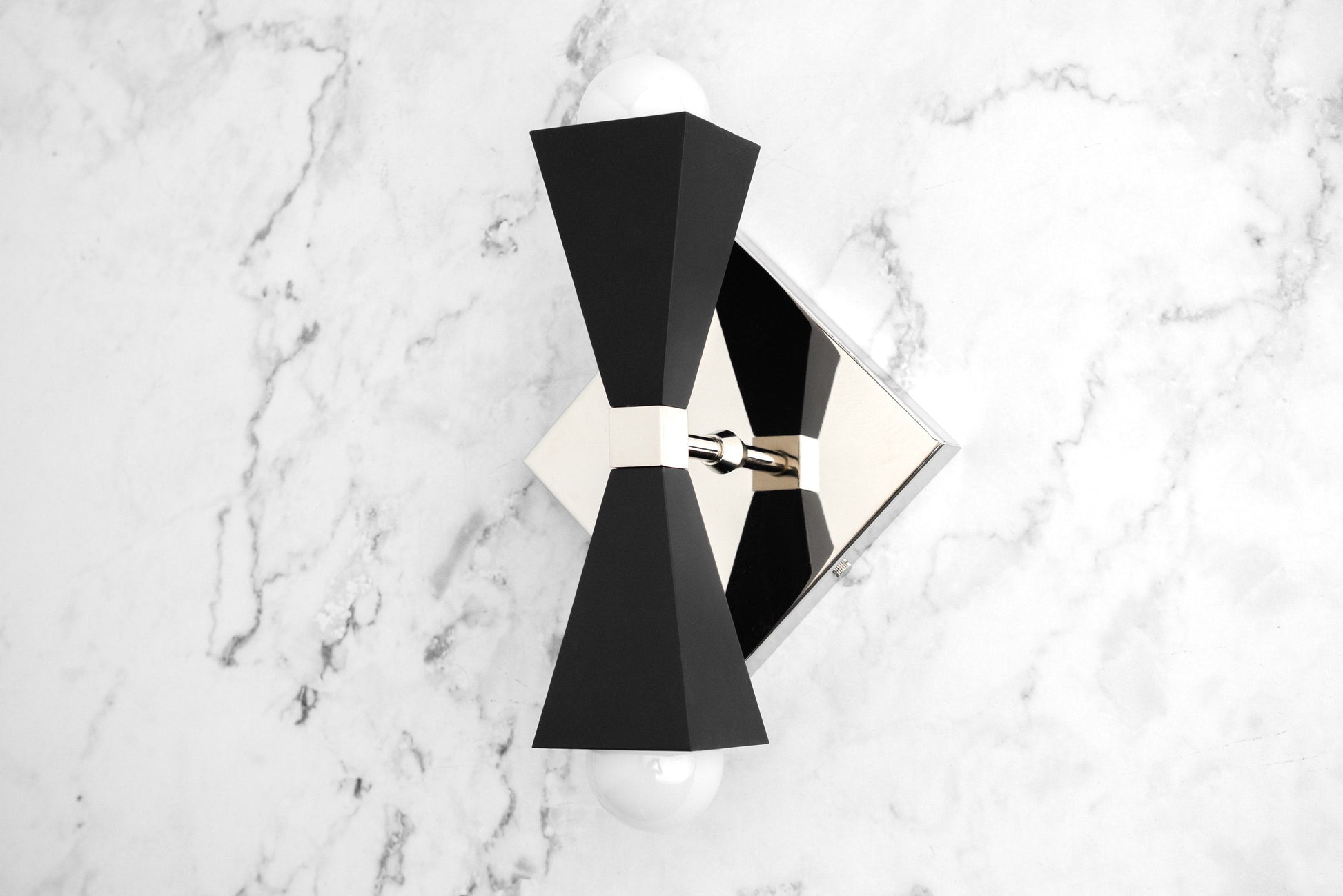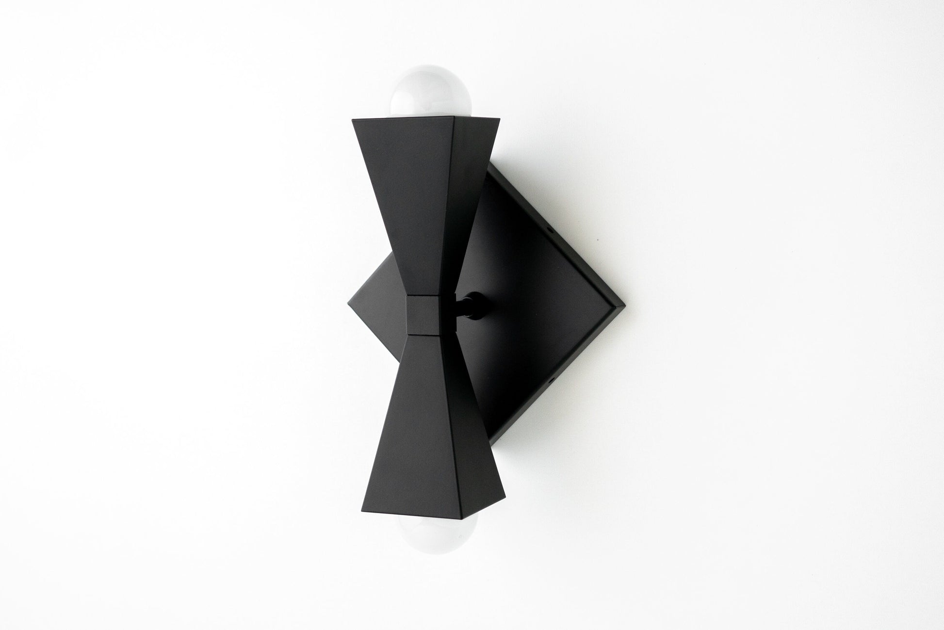This modern deco 2 bulb sconce features 2 geometric cones and a diamond canopy.