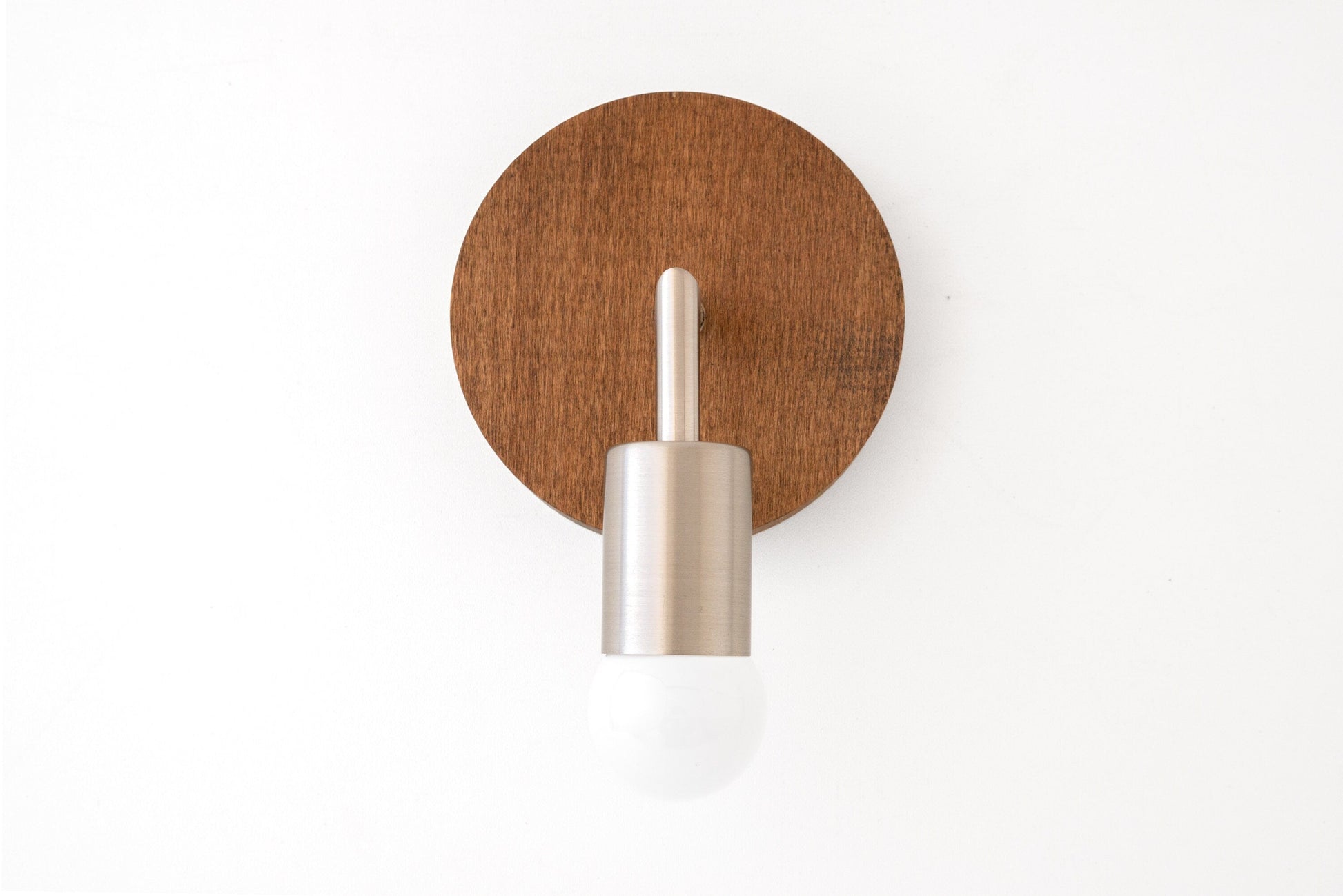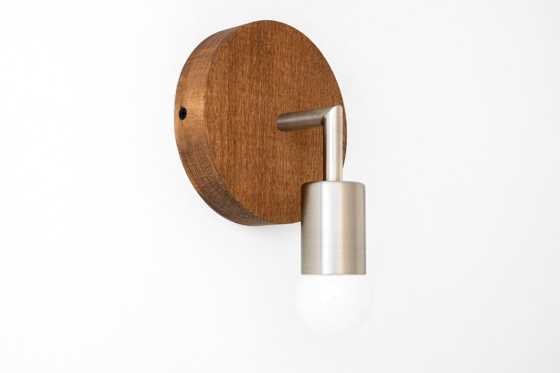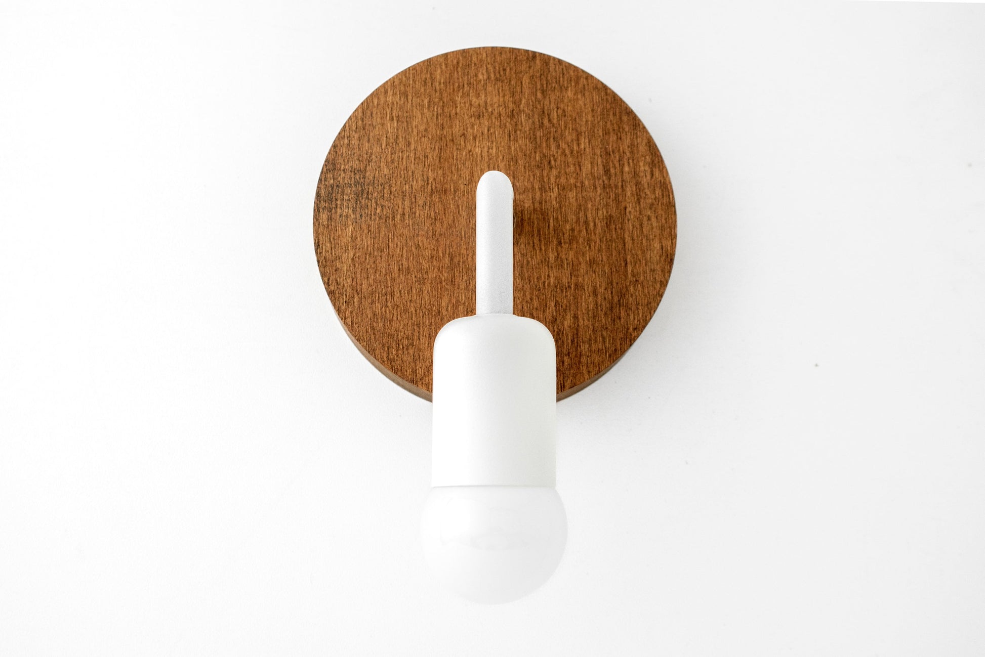 This minimalist wall light fixture features an oak stained beechwood canopy backplate.