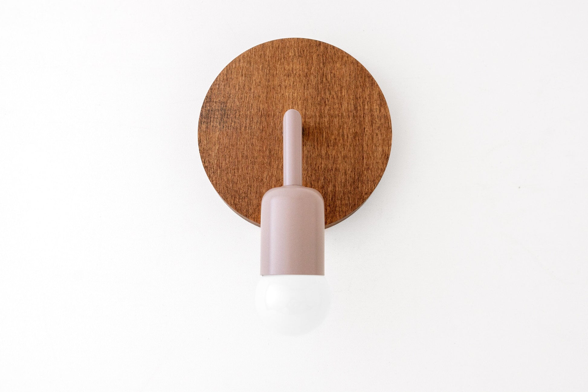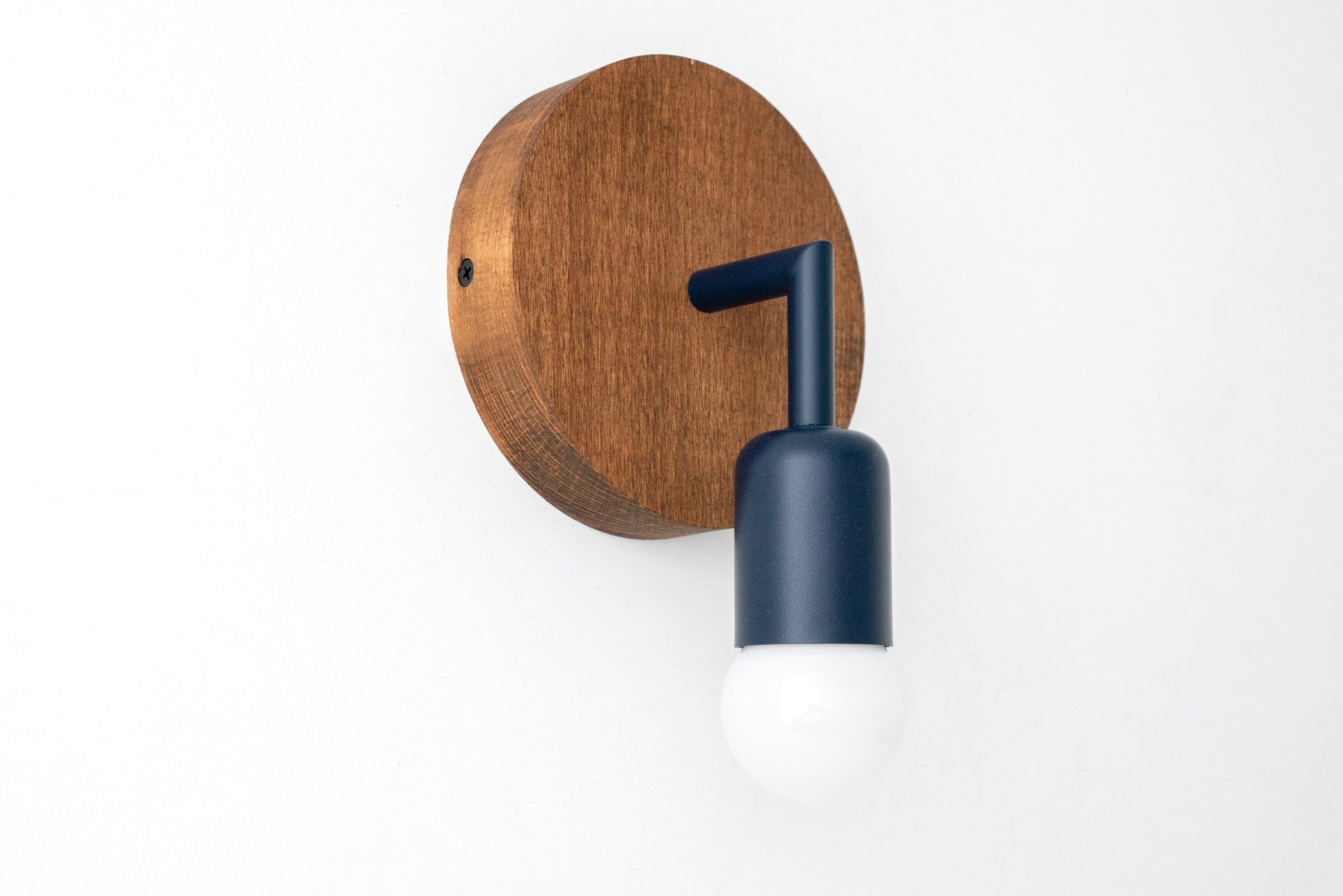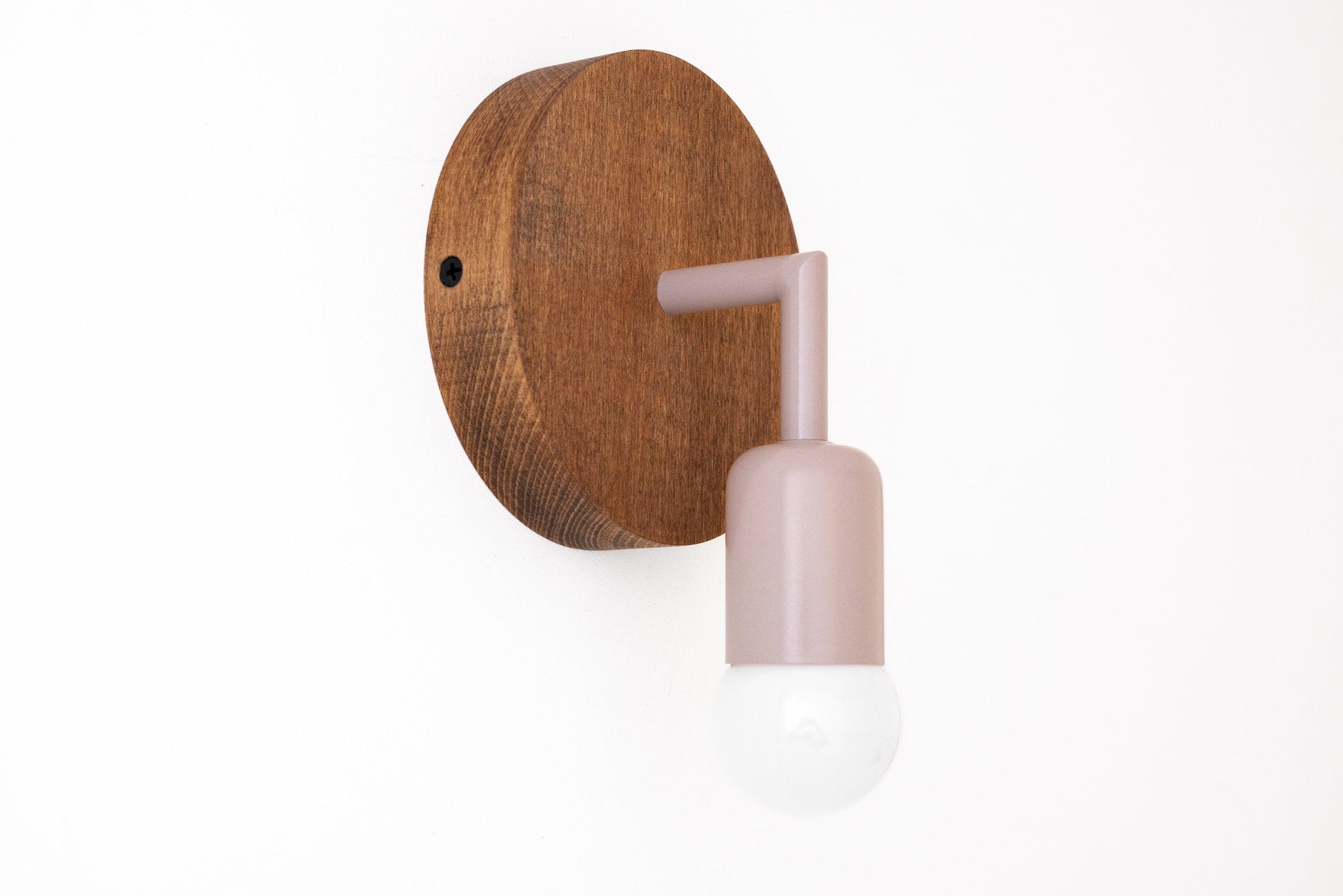 This minimalist wall light fixture features an oak stained beechwood canopy backplate.