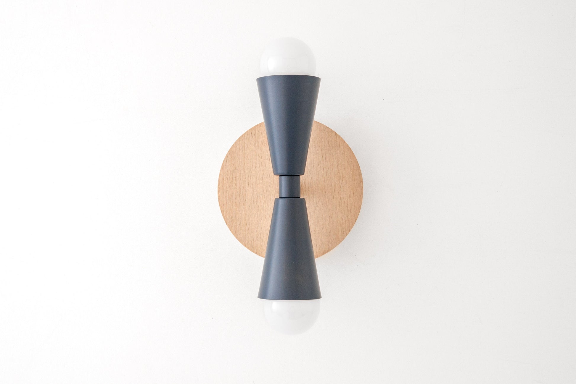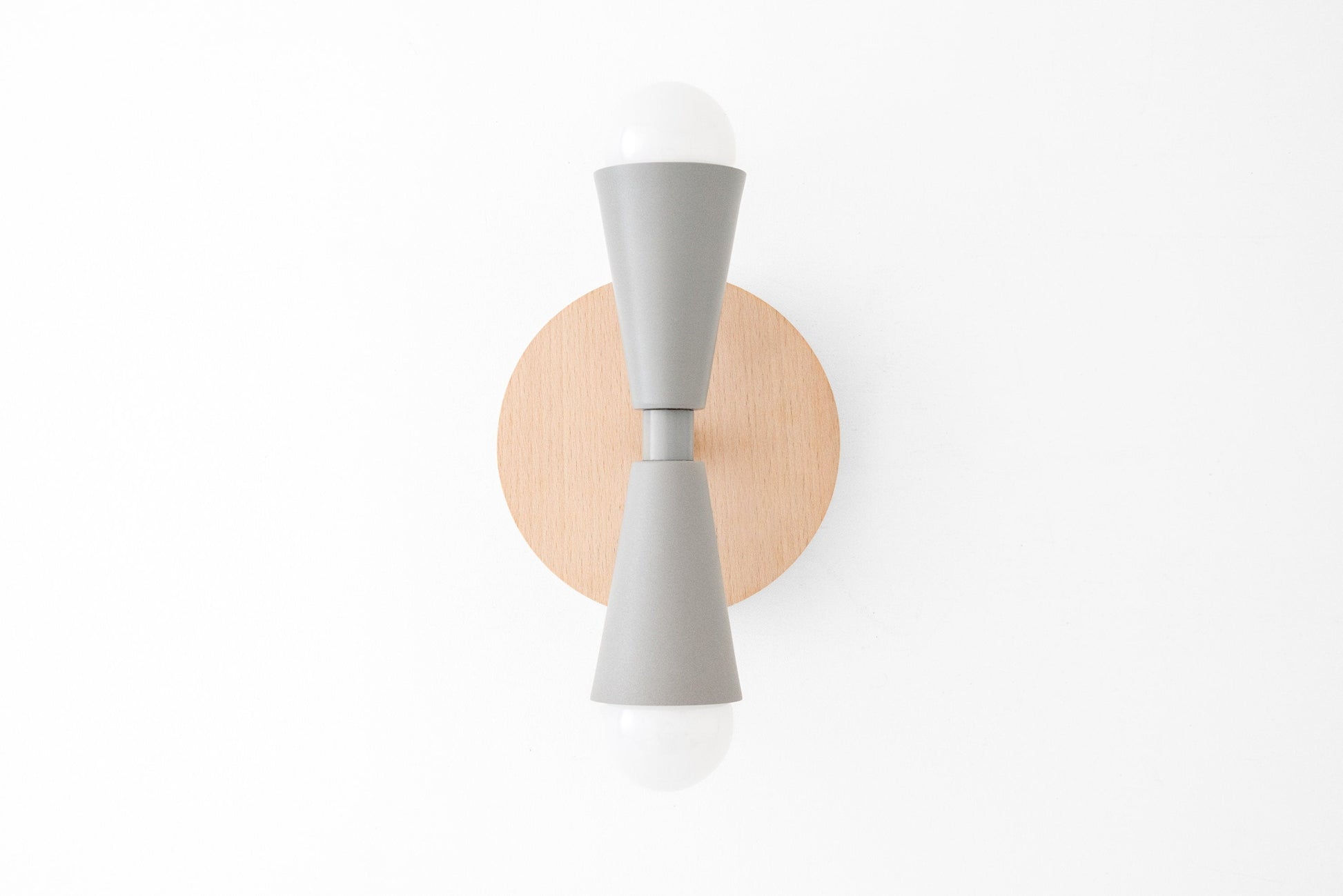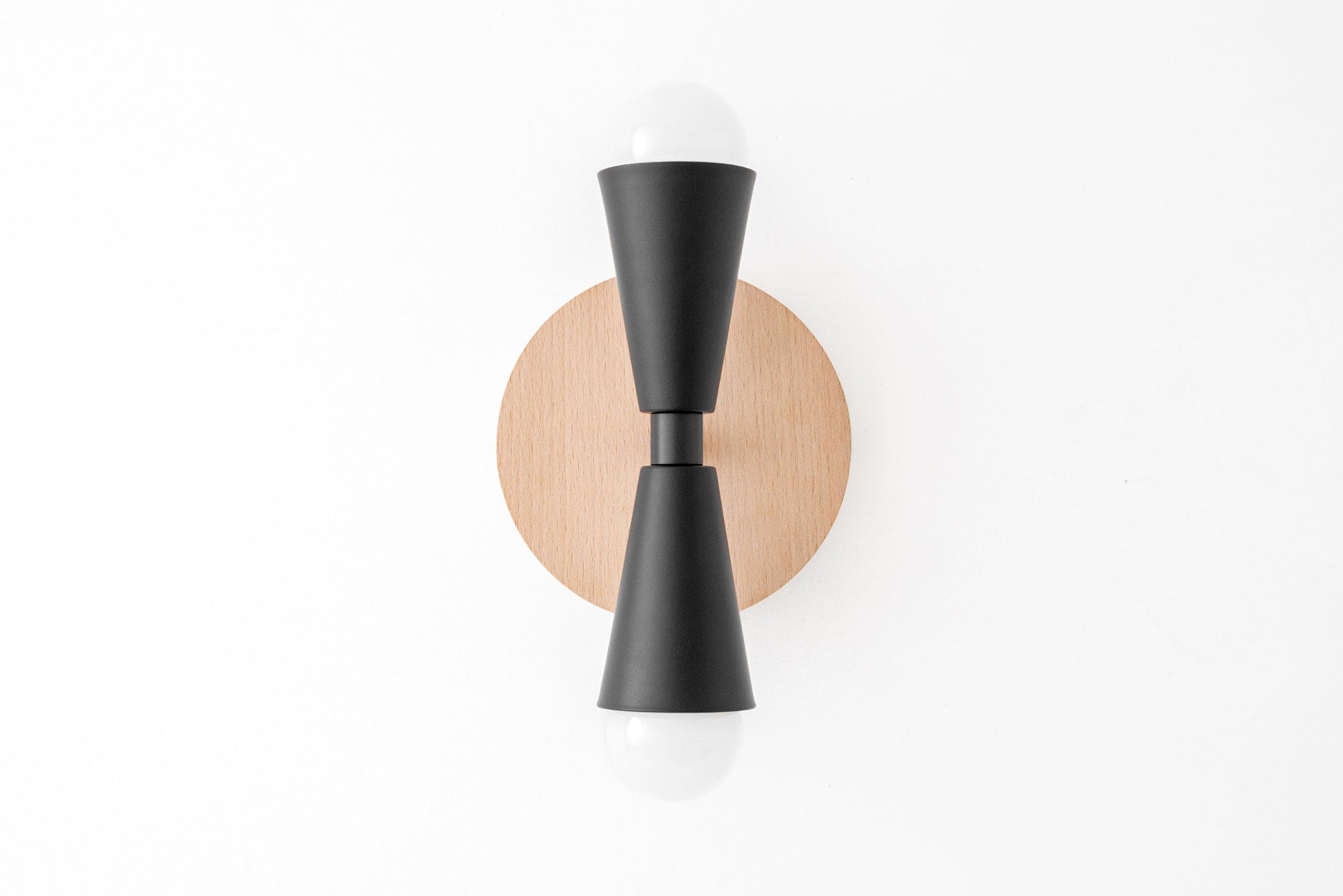 This minimalist wall sconce features a natural light beechwood canopy backplate.