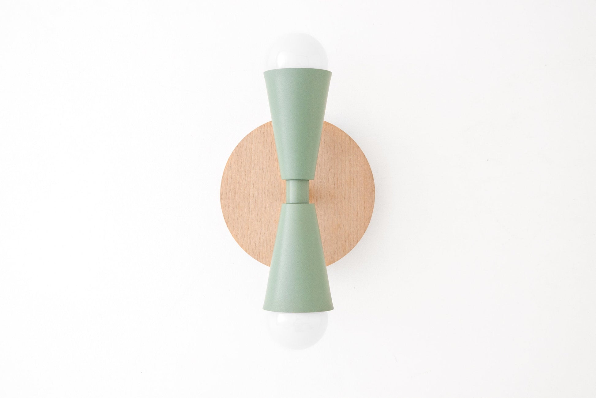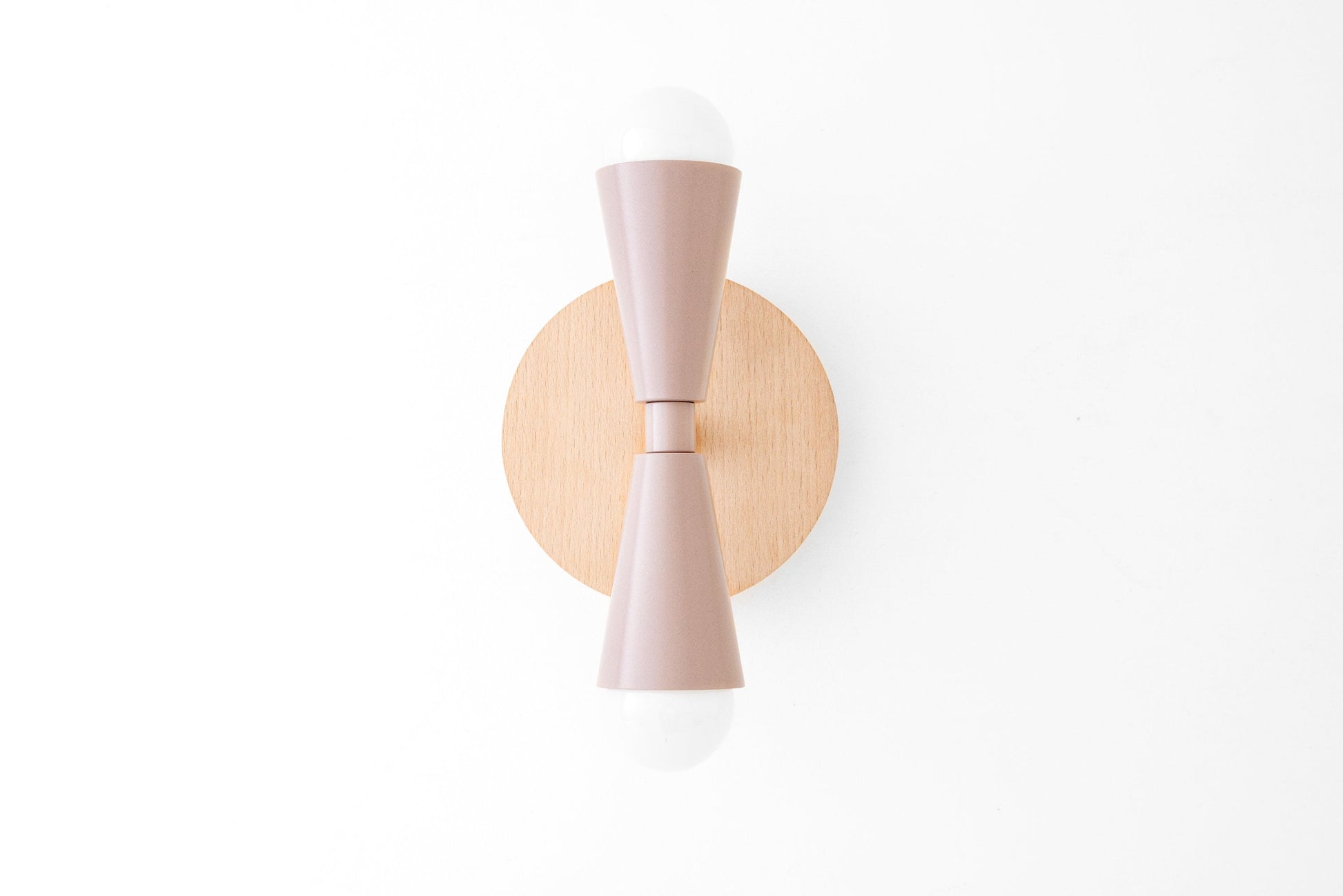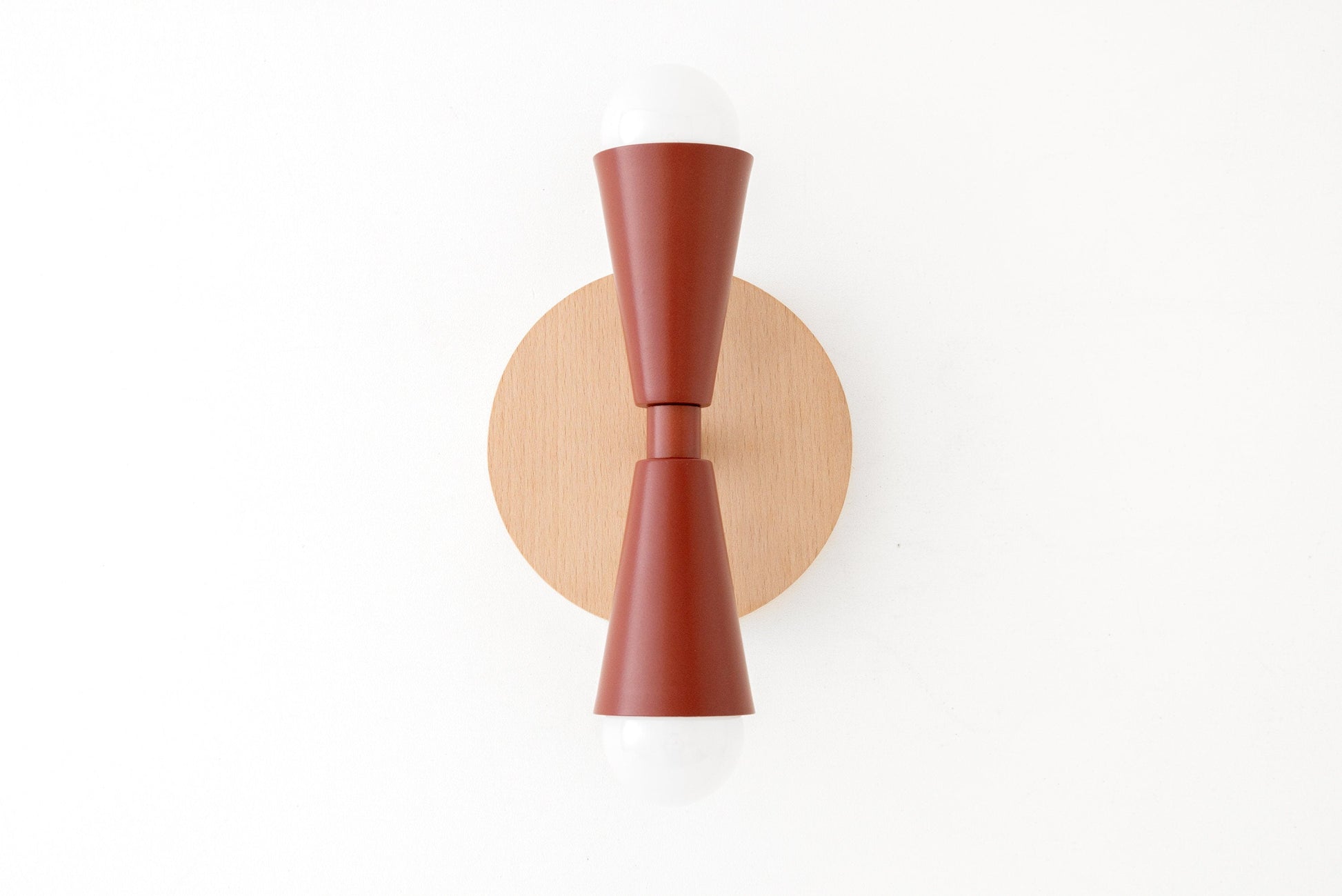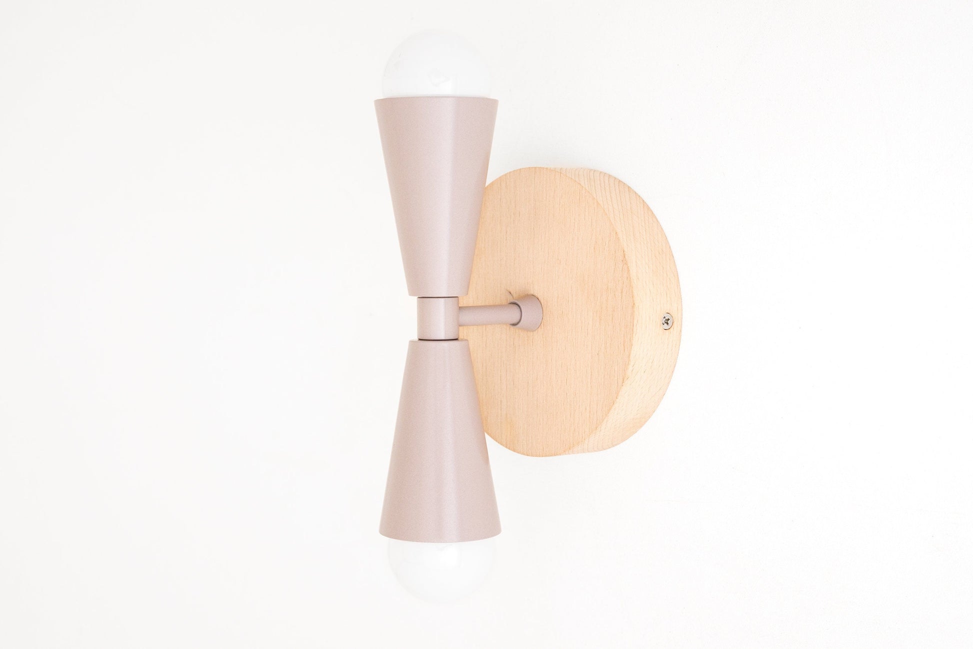 This minimalist wall sconce features a natural light beechwood canopy backplate.