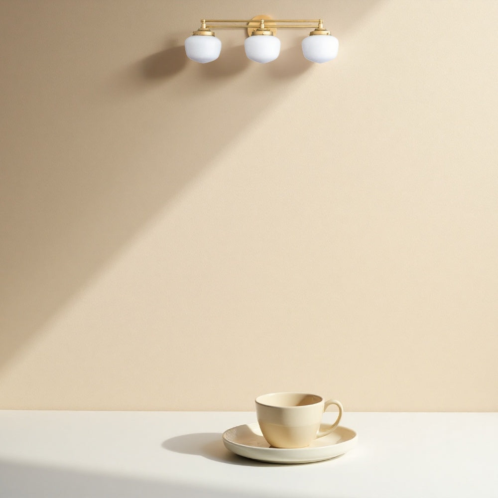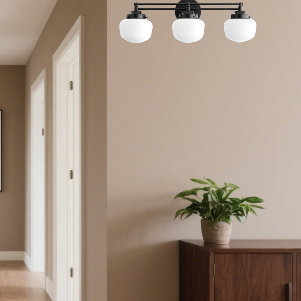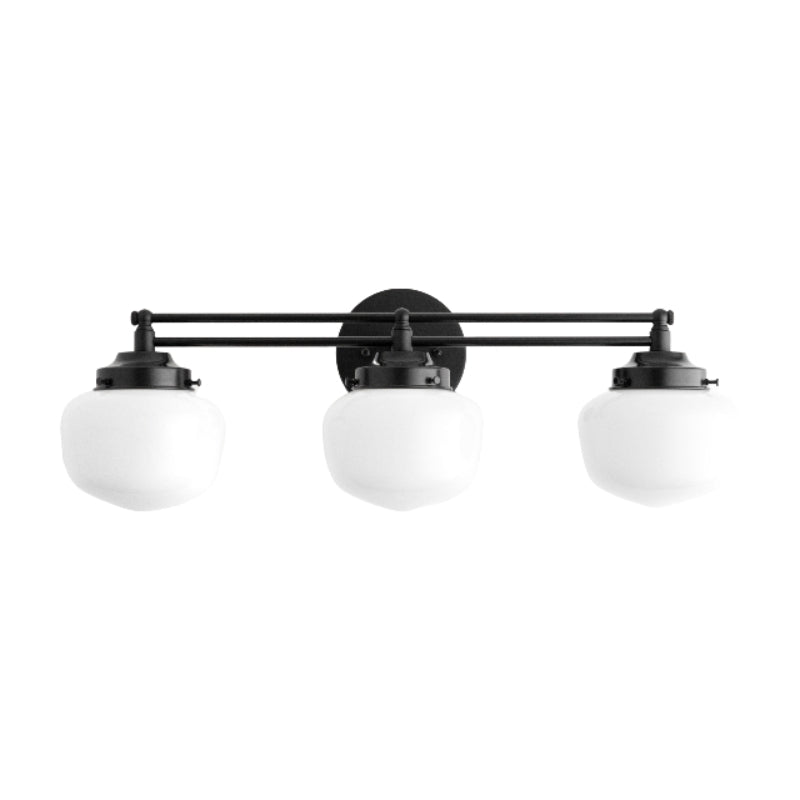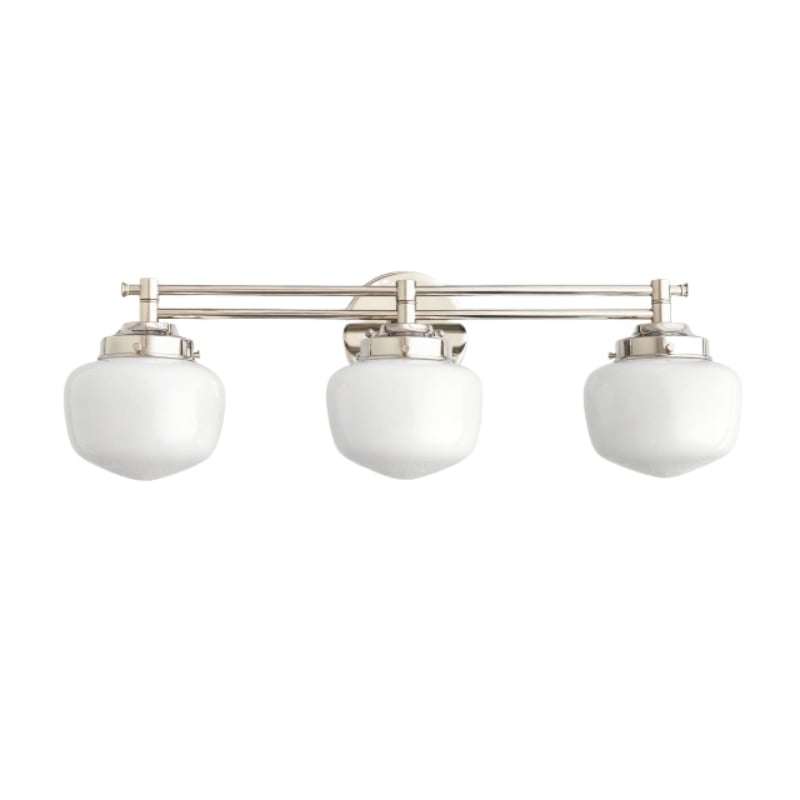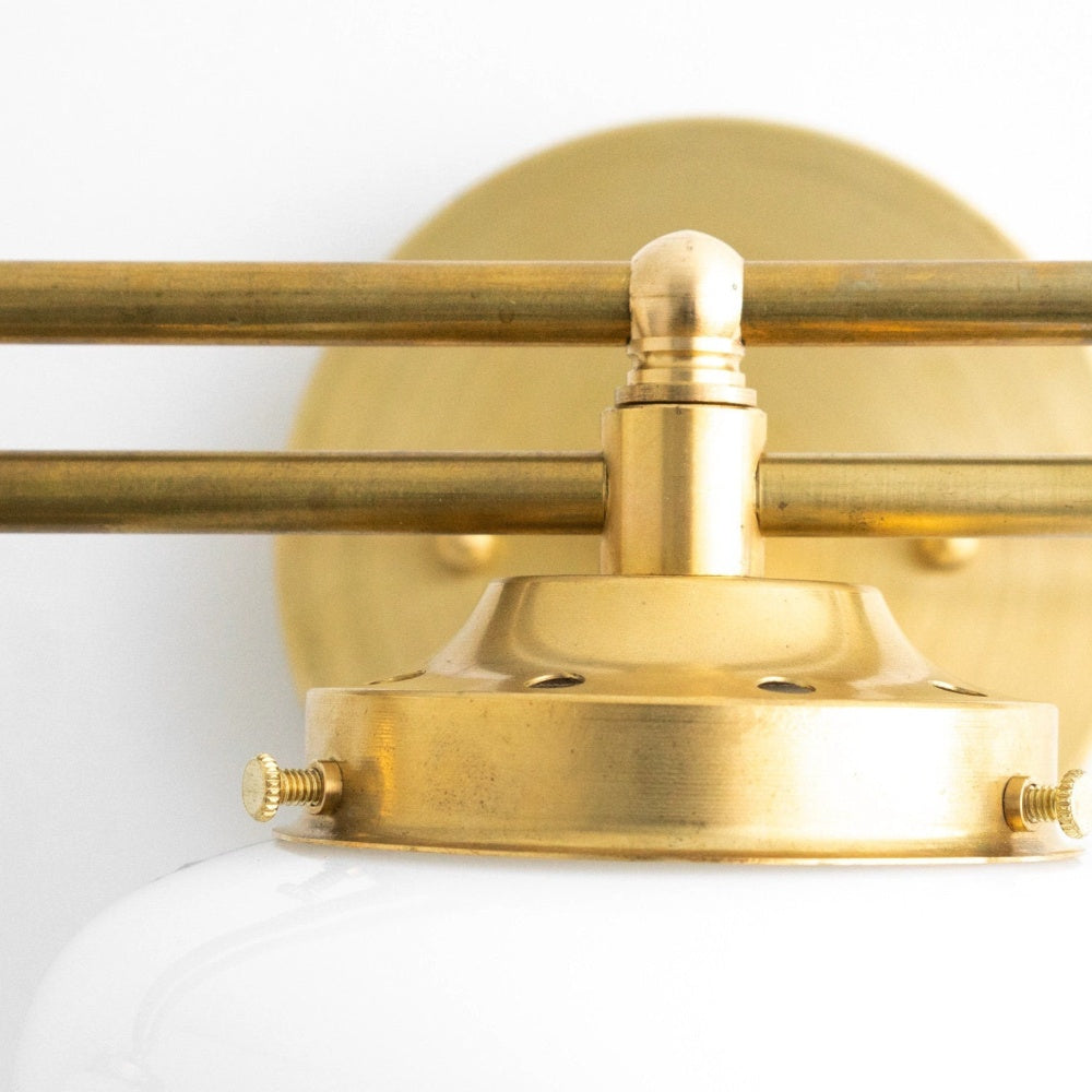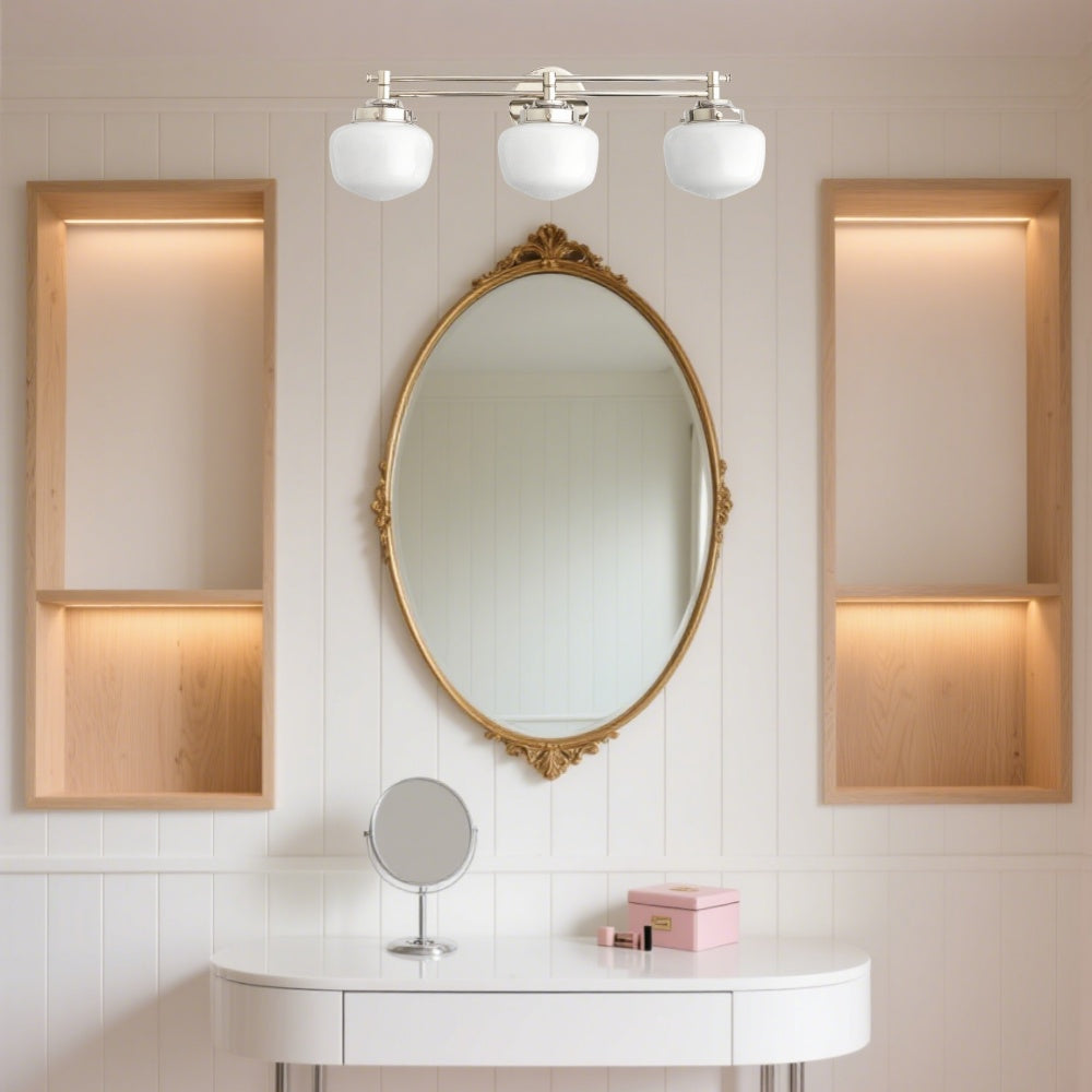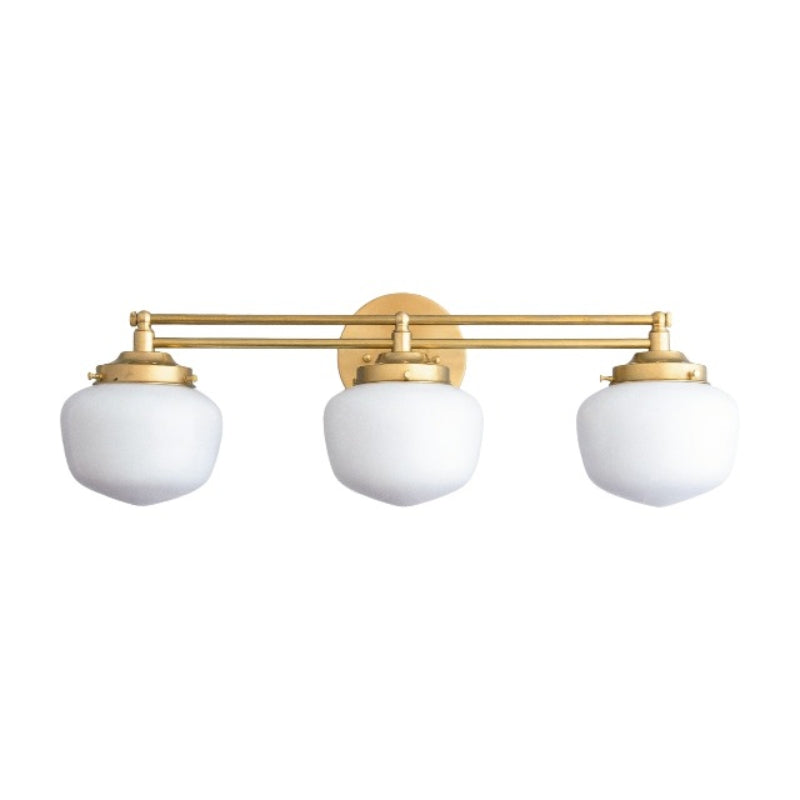 This Art Deco style 3 bulb vanity light fixture features white glass schoolhouse style globes and a decorative double bar design.