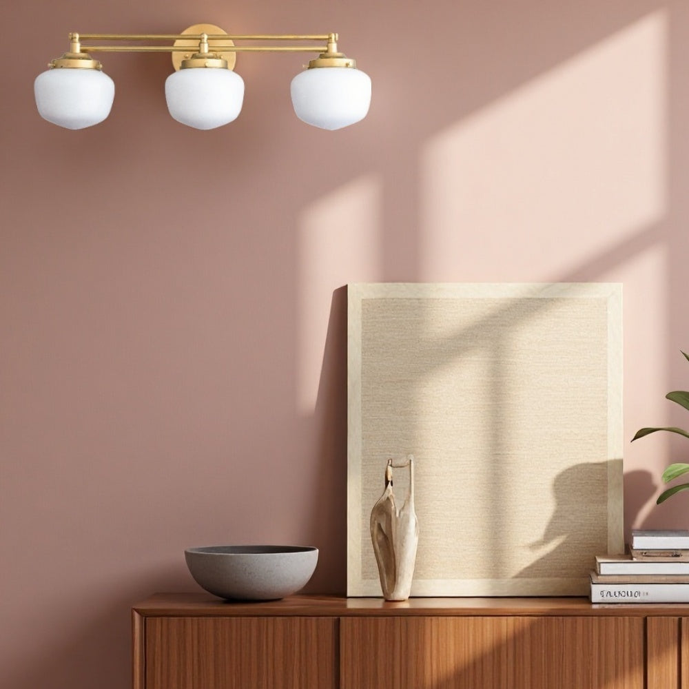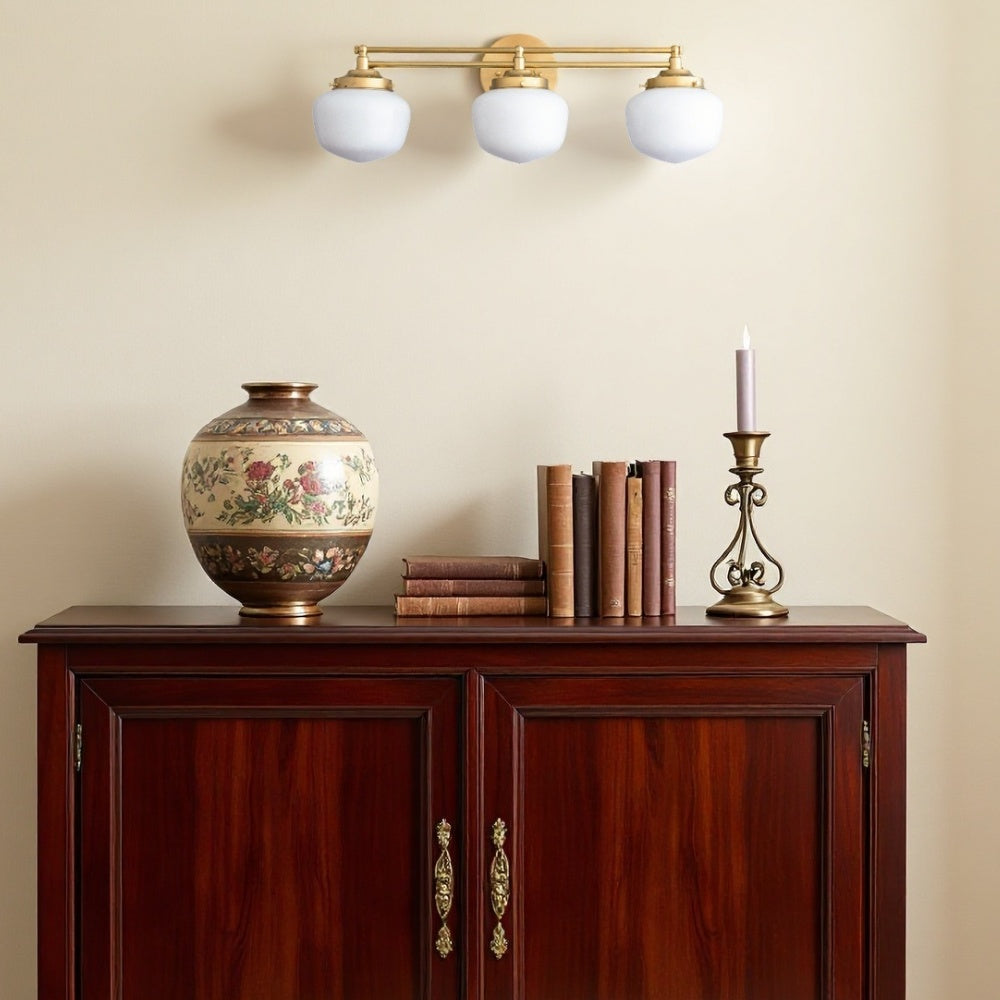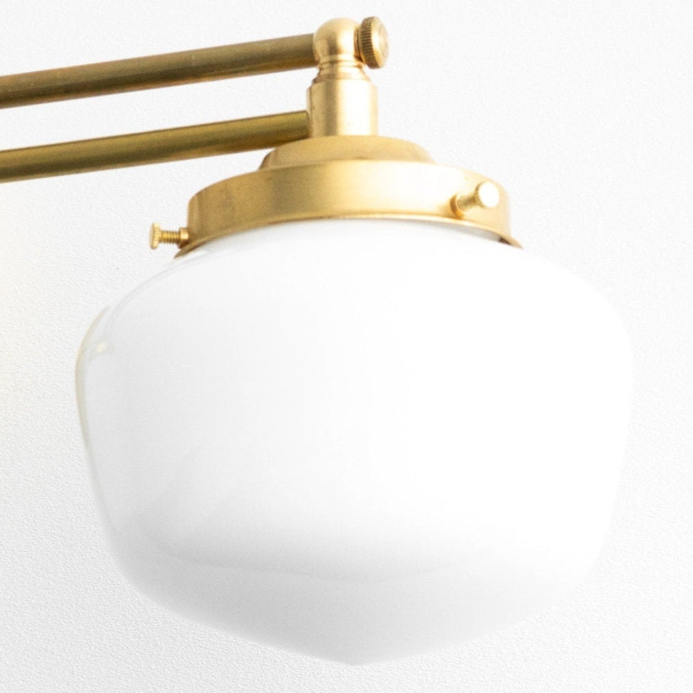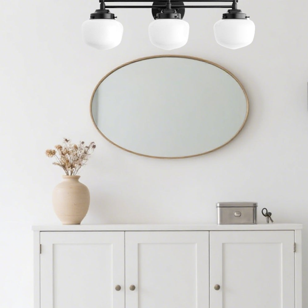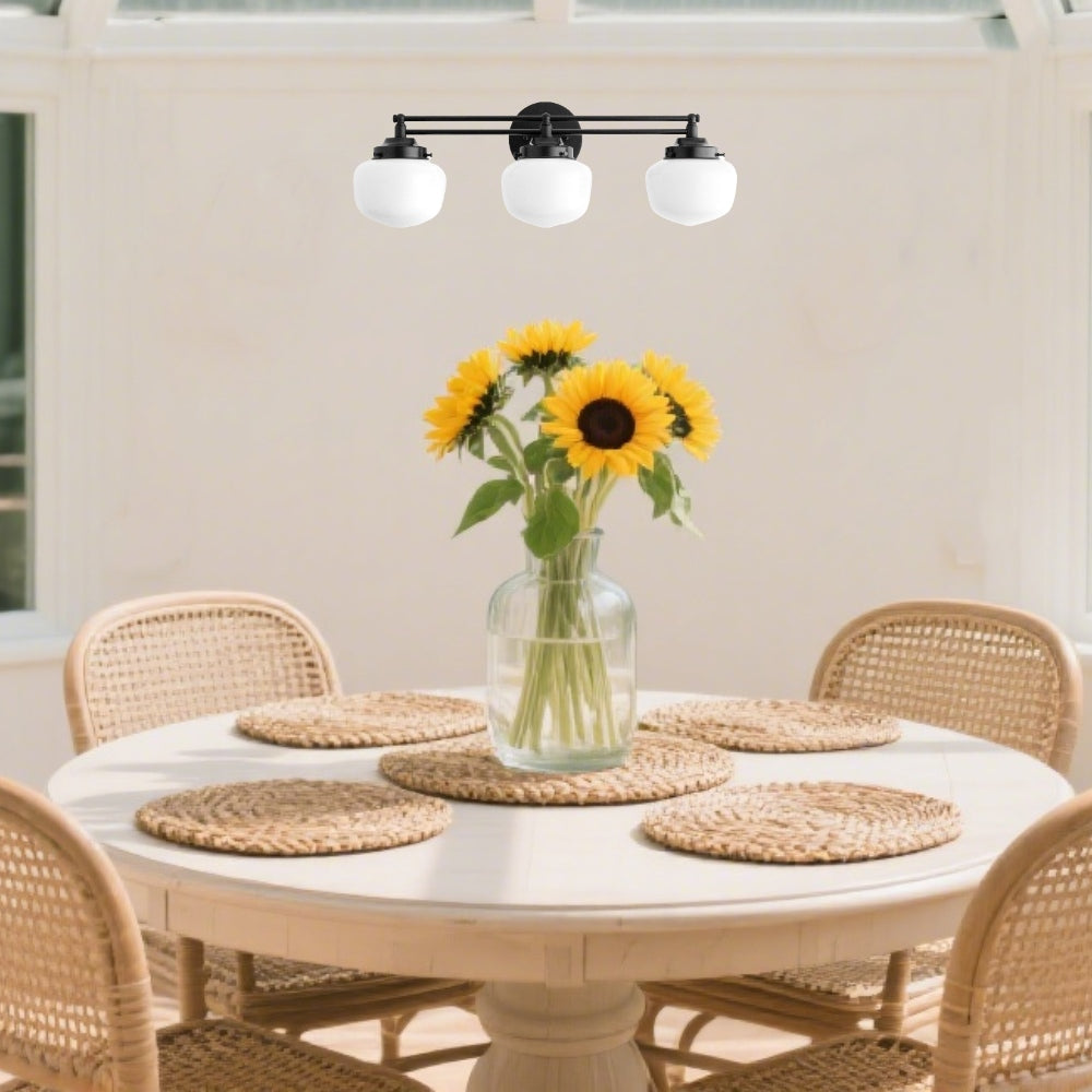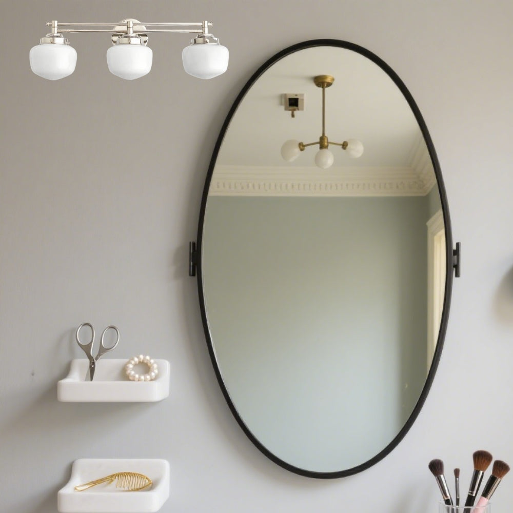 This Art Deco style 3 bulb vanity light fixture features white glass schoolhouse style globes and a decorative double bar design.