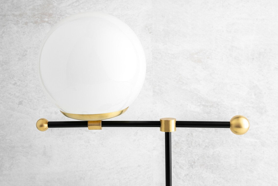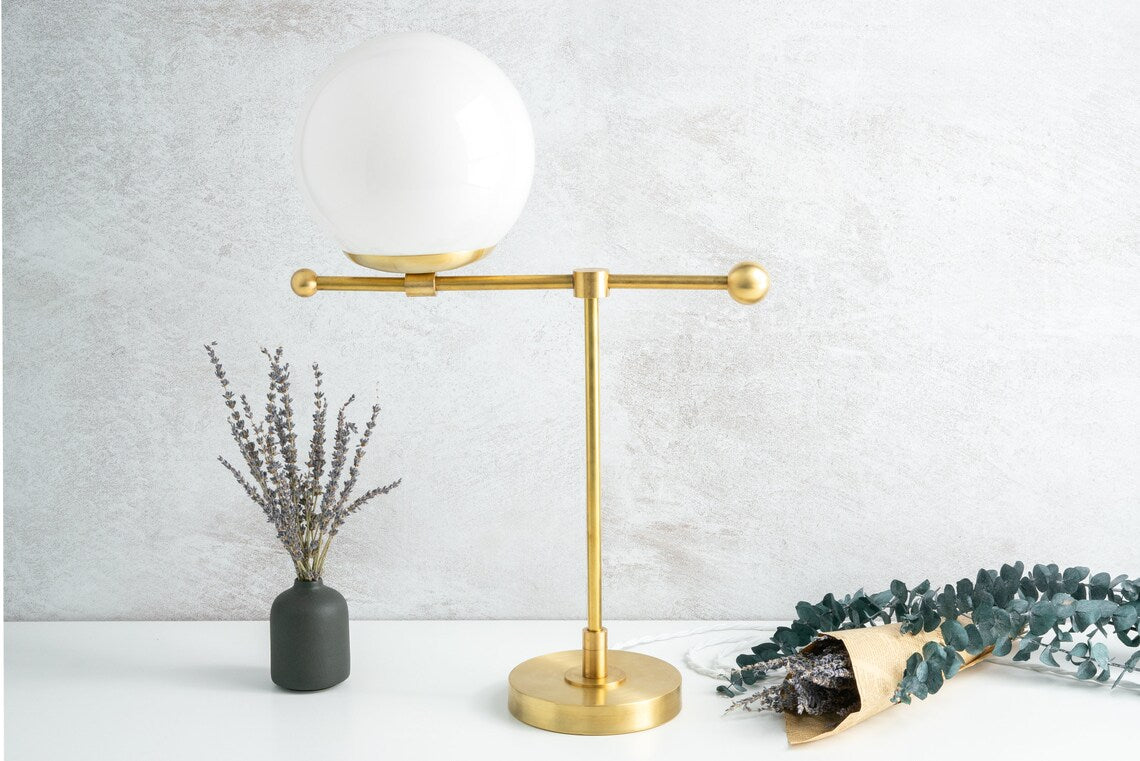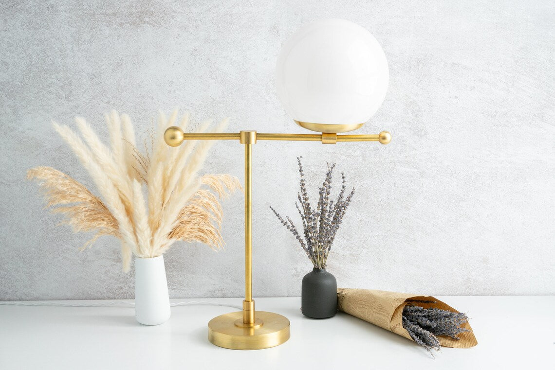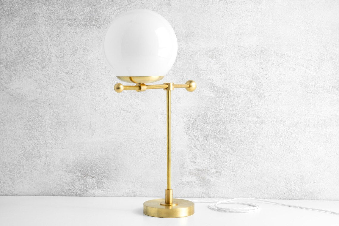 This mid century modern table lamp features an 8inch white gloss finish opal glass globe. The lamp swivels at the base allowing the globe to be positioned to the right, left, or centered. The light can be locked into place using the provided hex key.