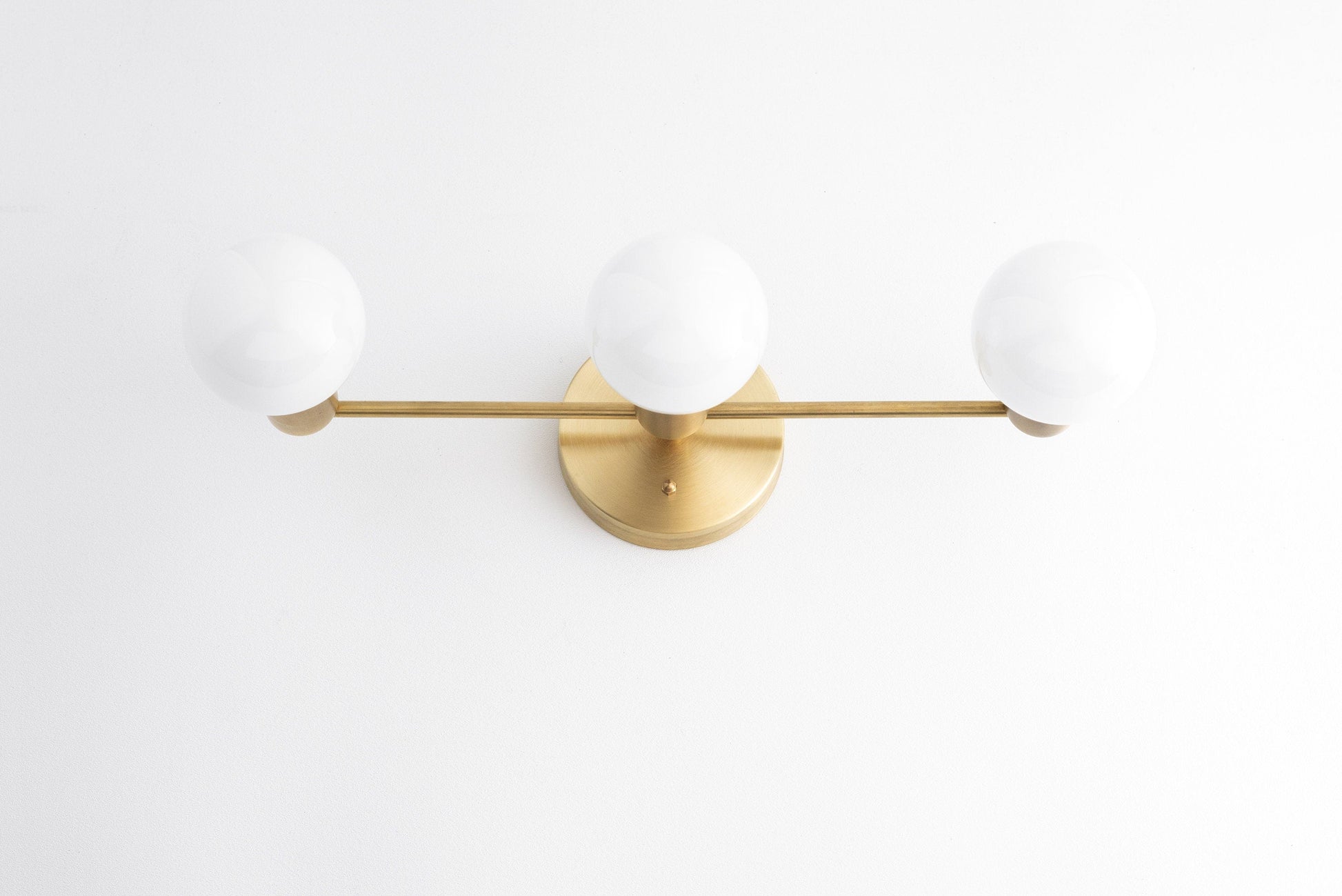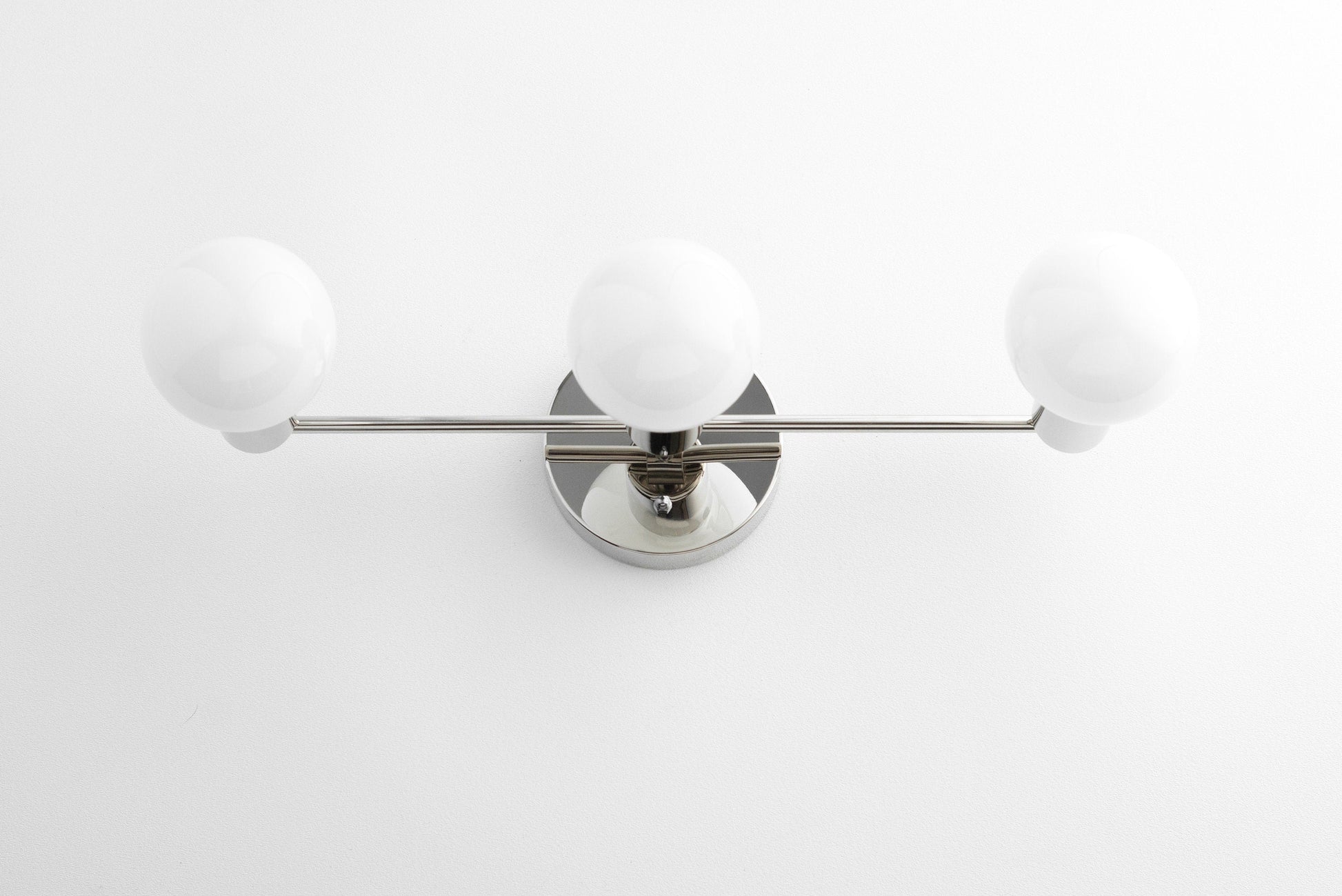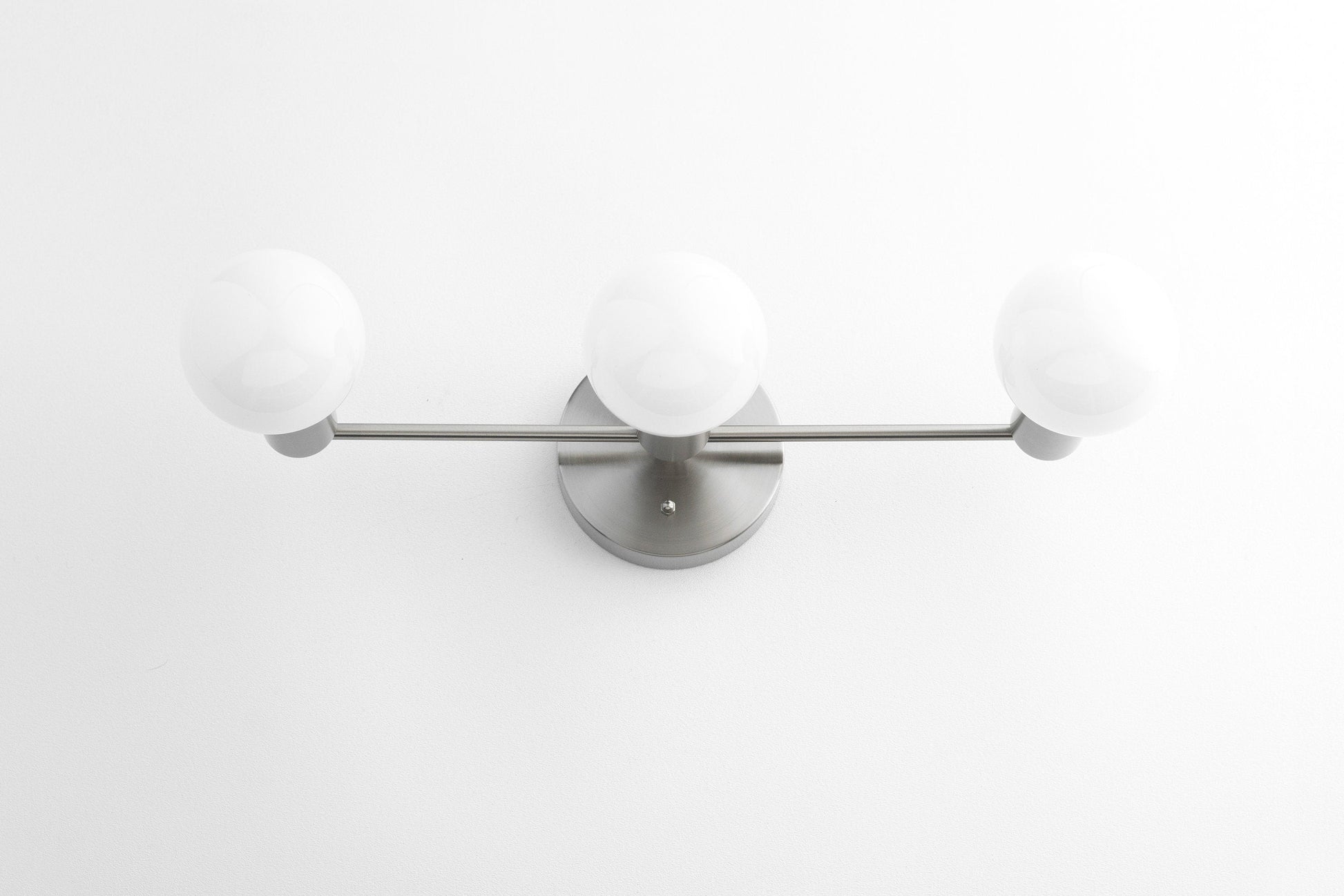 This midcentury modern 3 bulb vanity light fixture features large exposed bulbs. The light's simplistic design and clean lines makes it a perfect addition to large or small spaces.