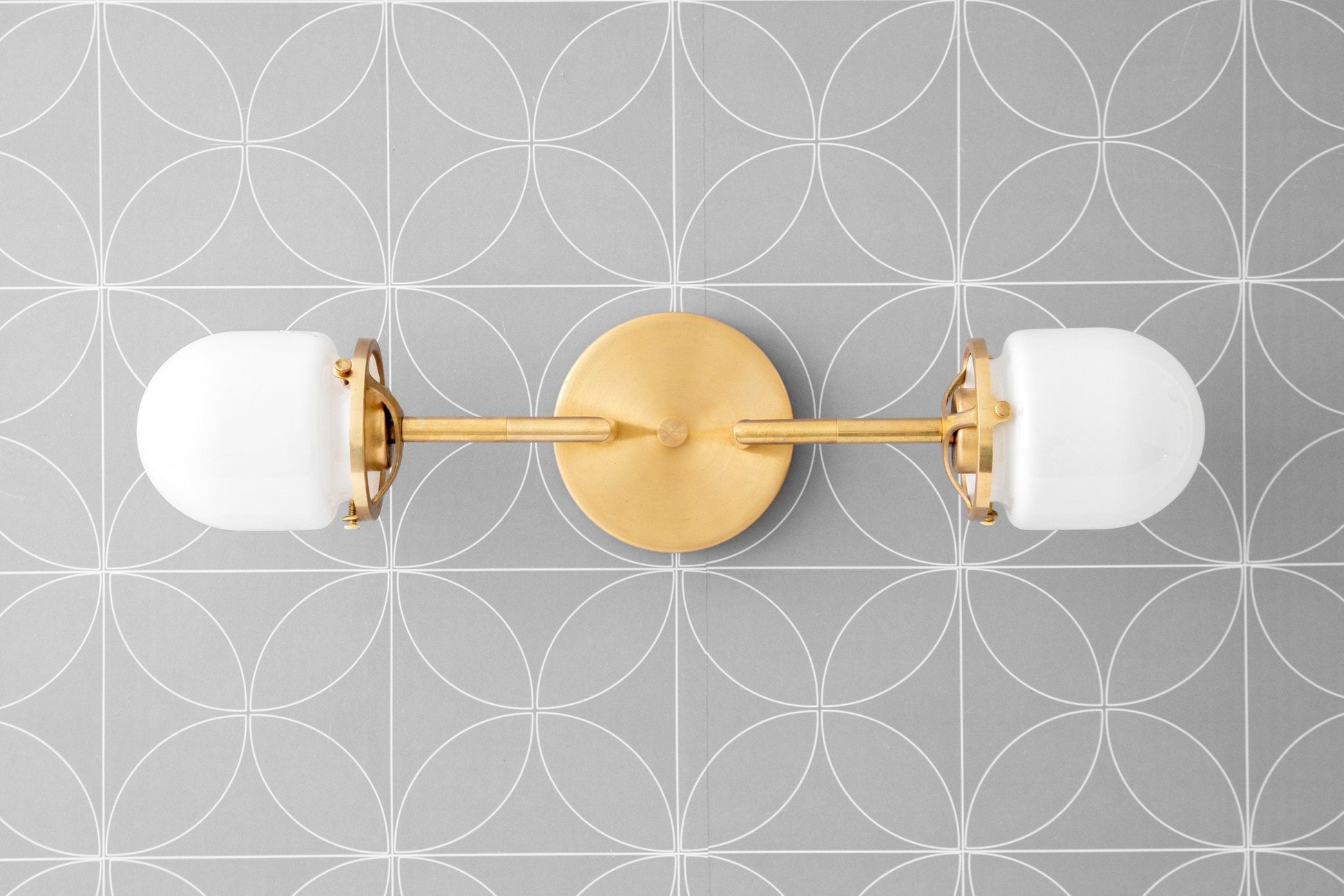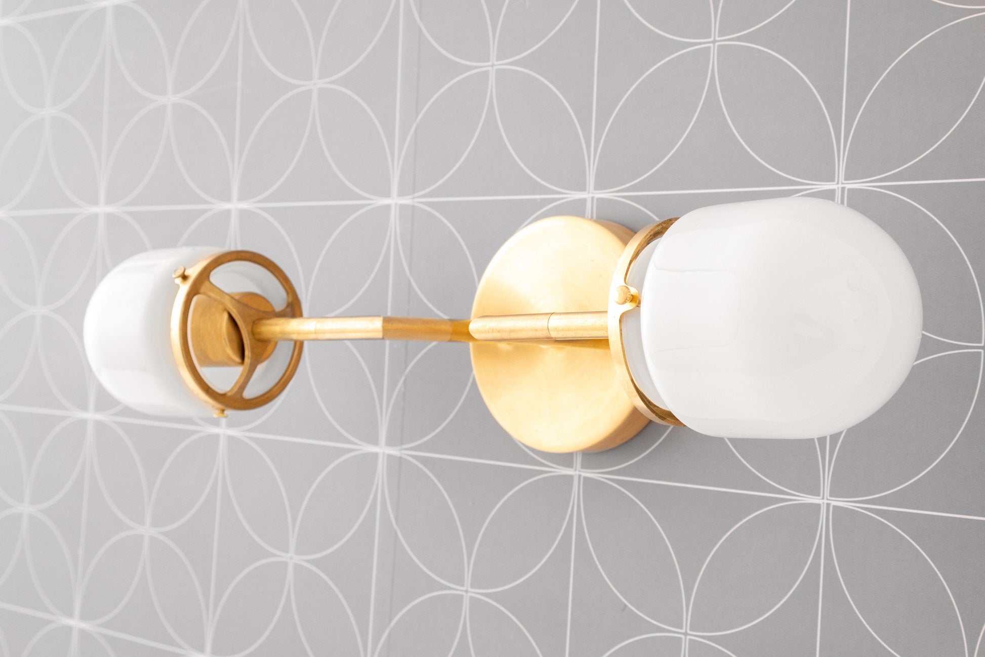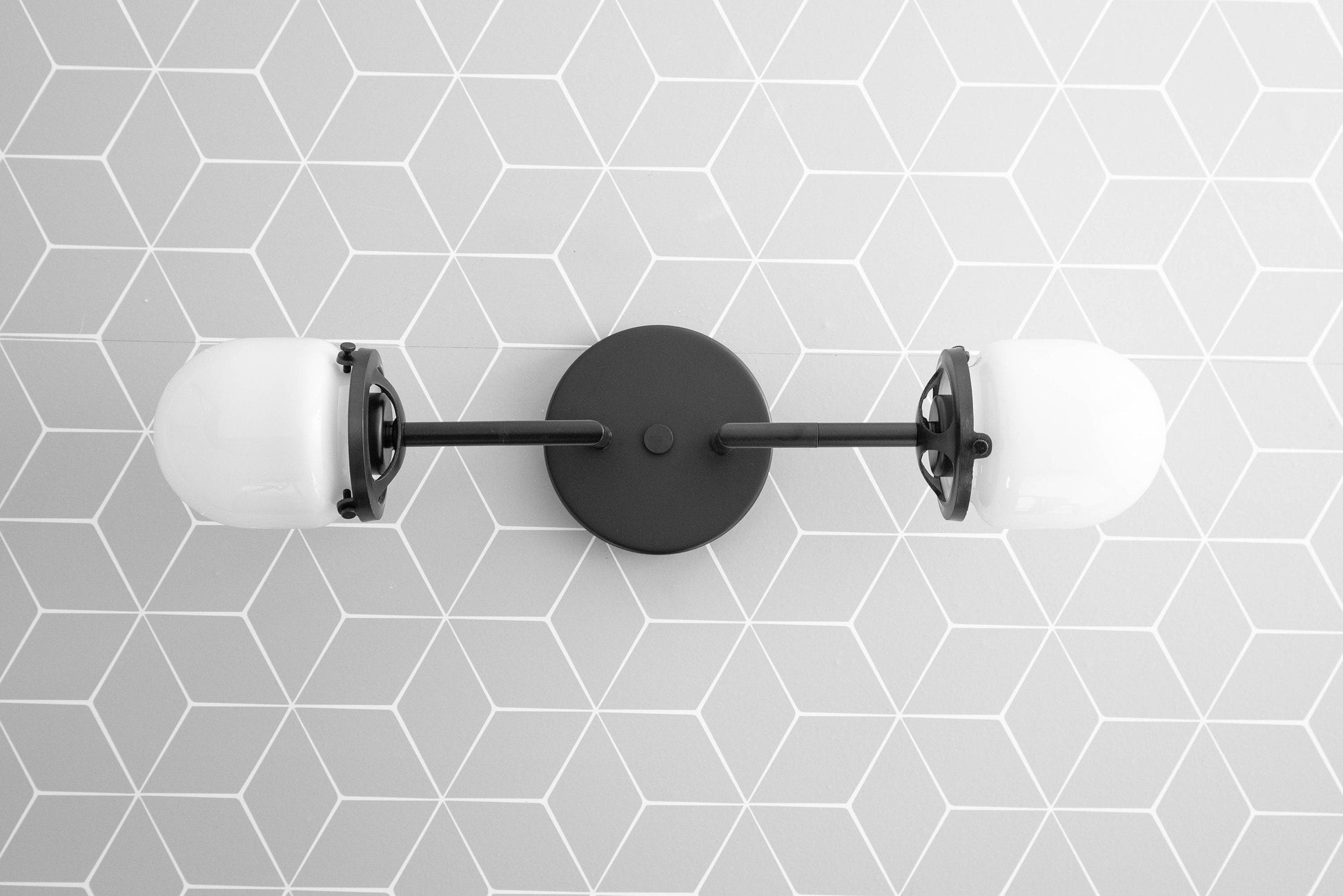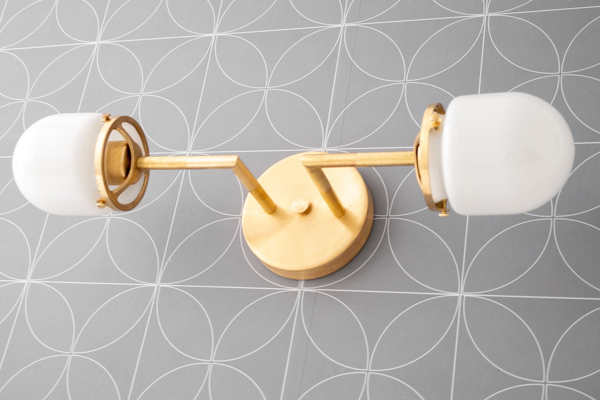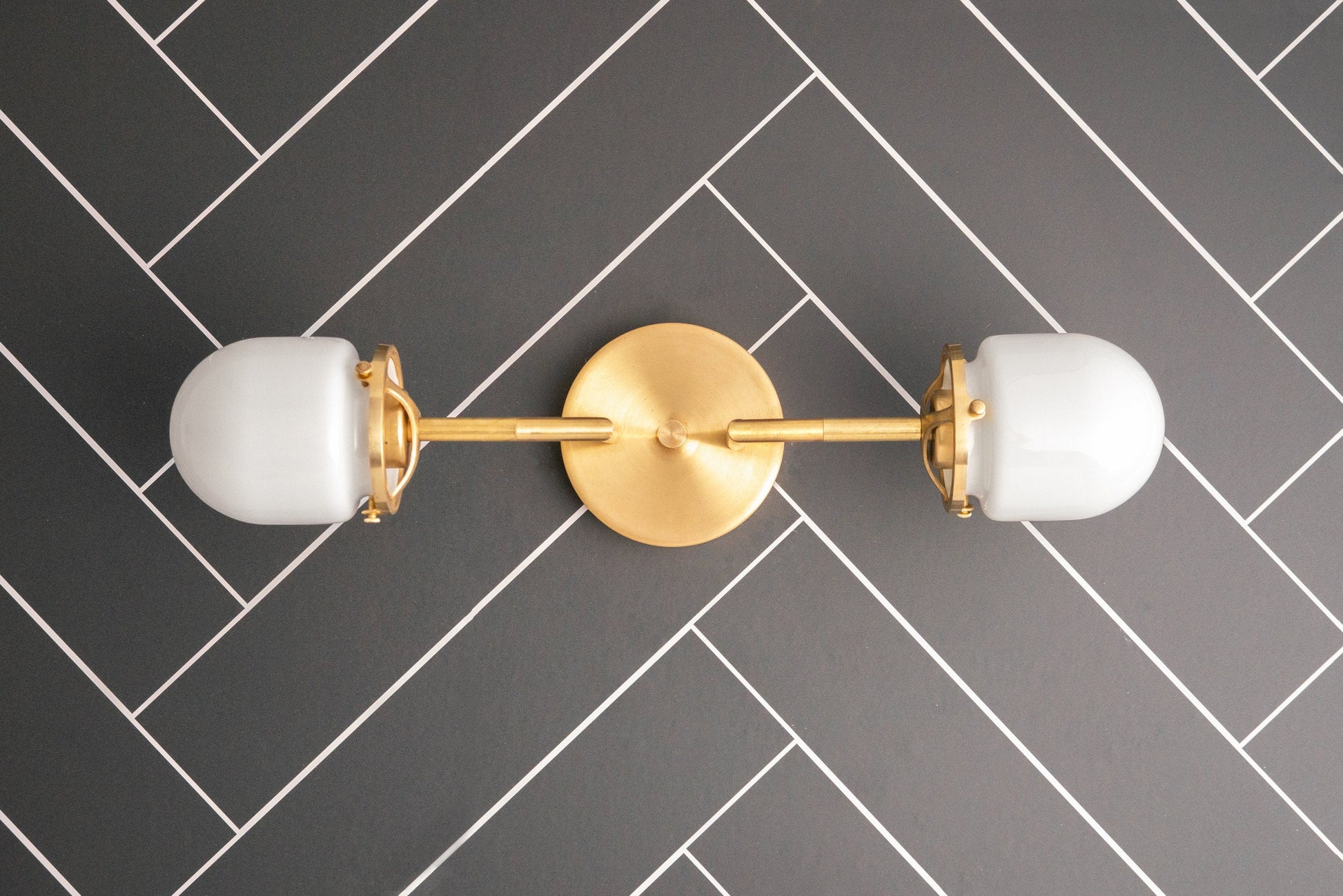 This Scandinavian inspired minimalist vanity light features sharp 90º arms and white glass bullet globes.