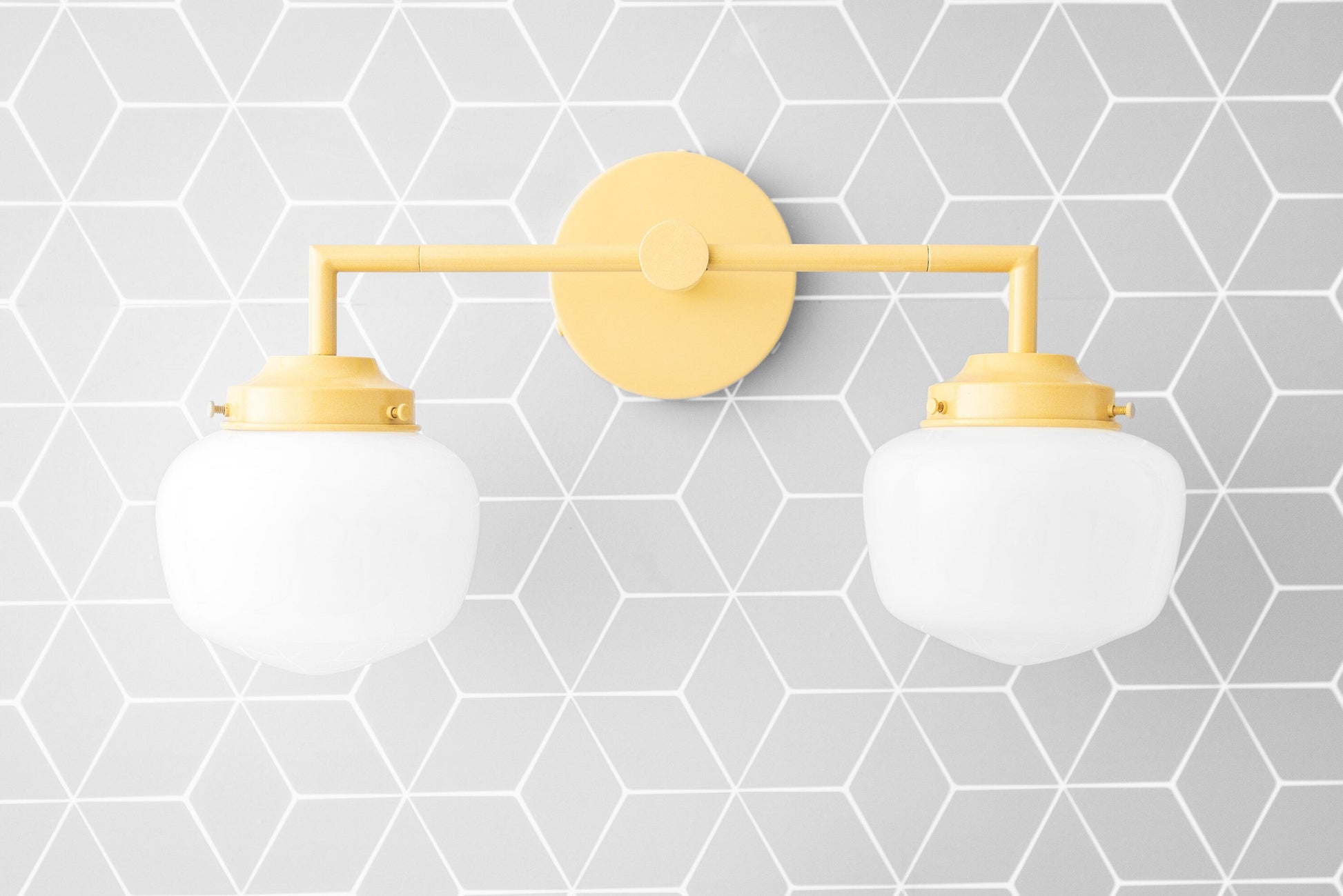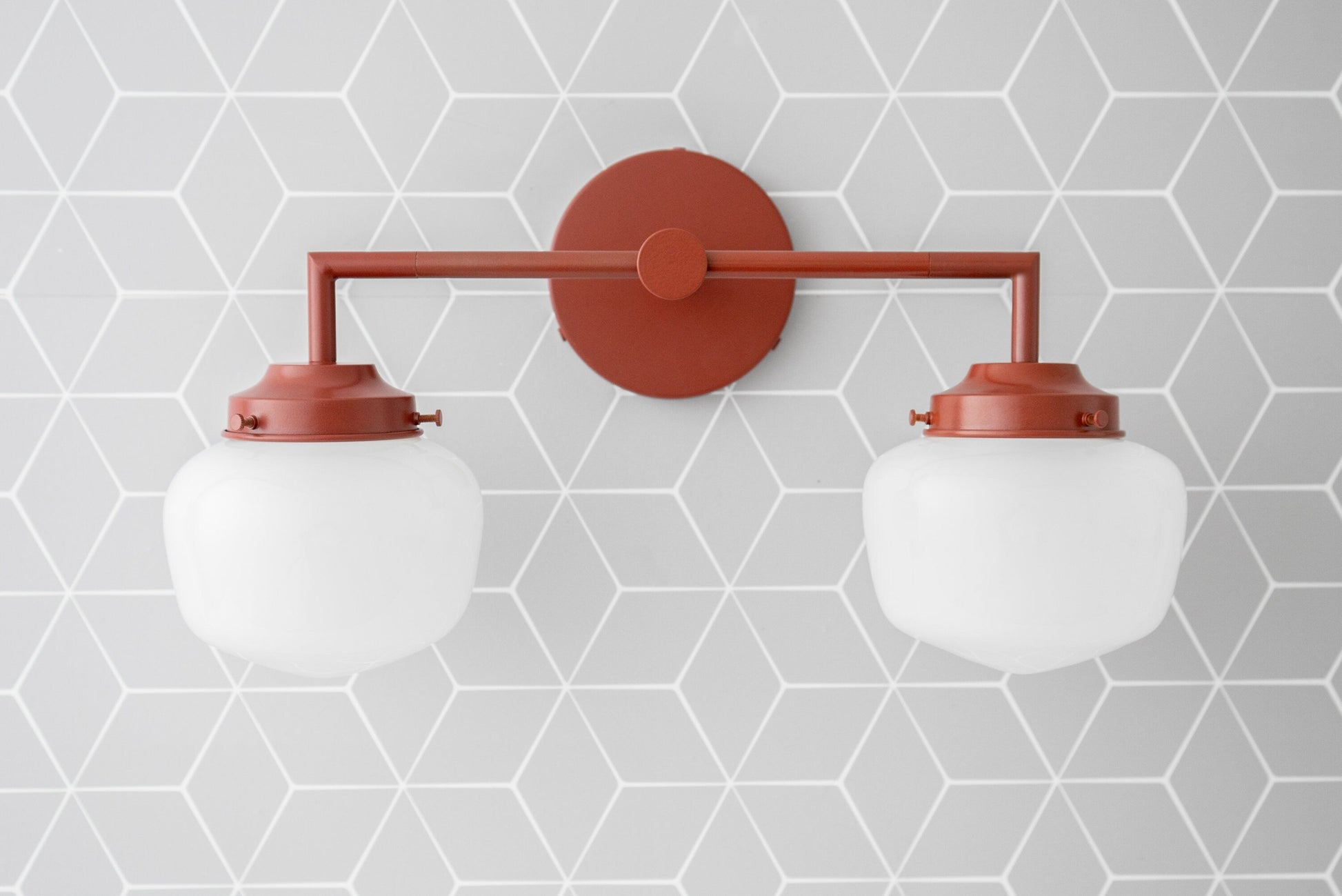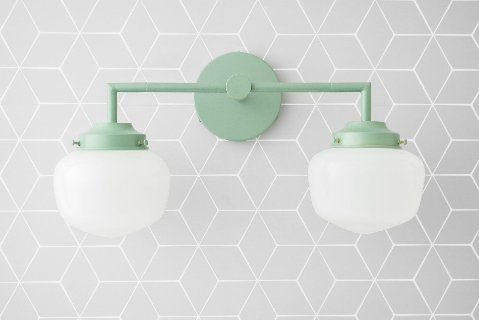 This colorful vanity light fixture features schoolhouse style glass globes.