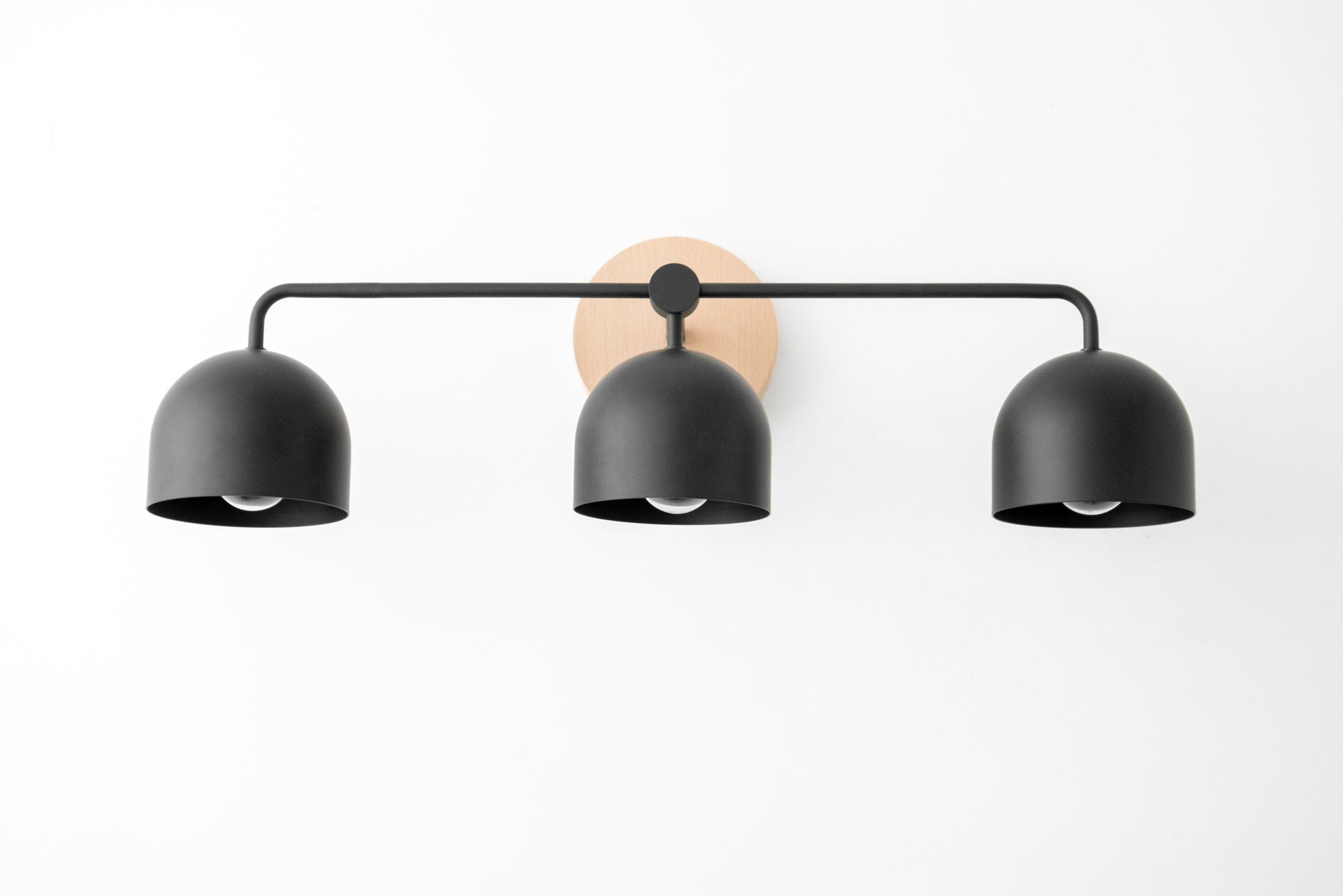This Scandinavian inspired vanity light fixture features deep dome shades and is available with an unfinished beechwood or oak stained beechwood canopy backplate. The fixture is also available in solid all black metal finish.