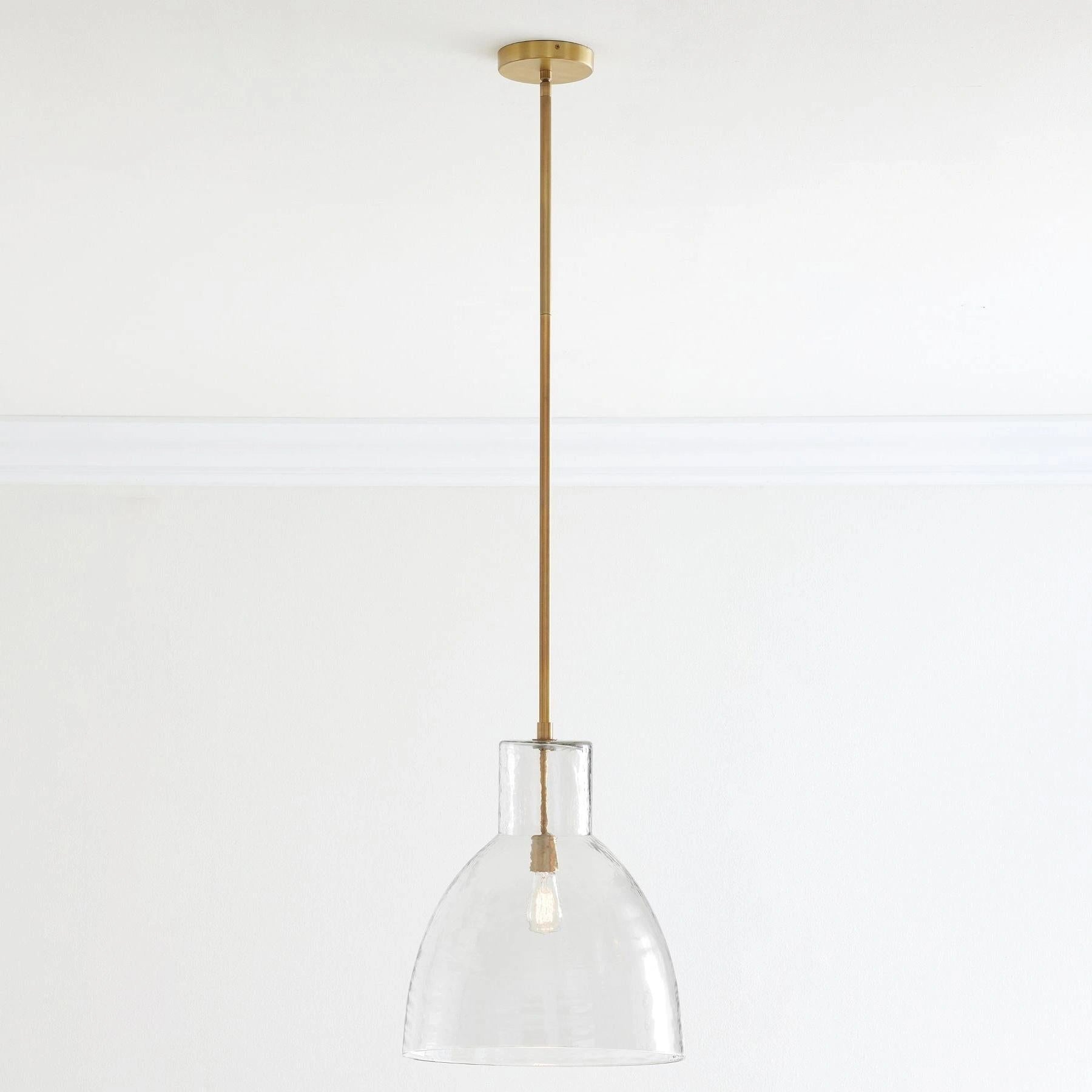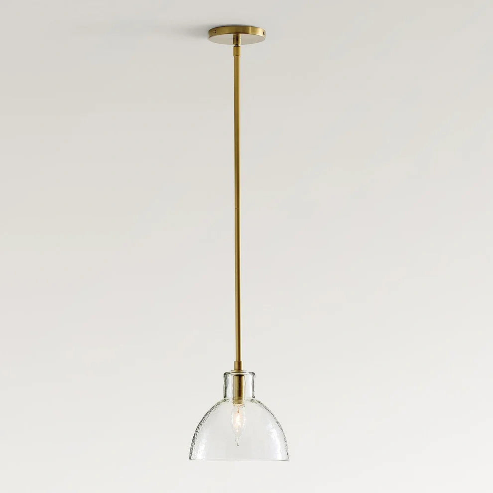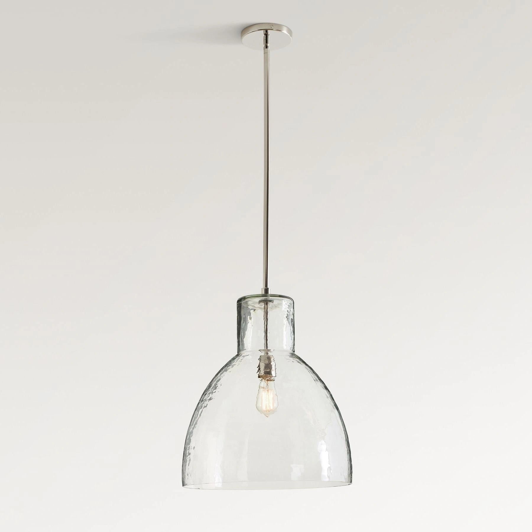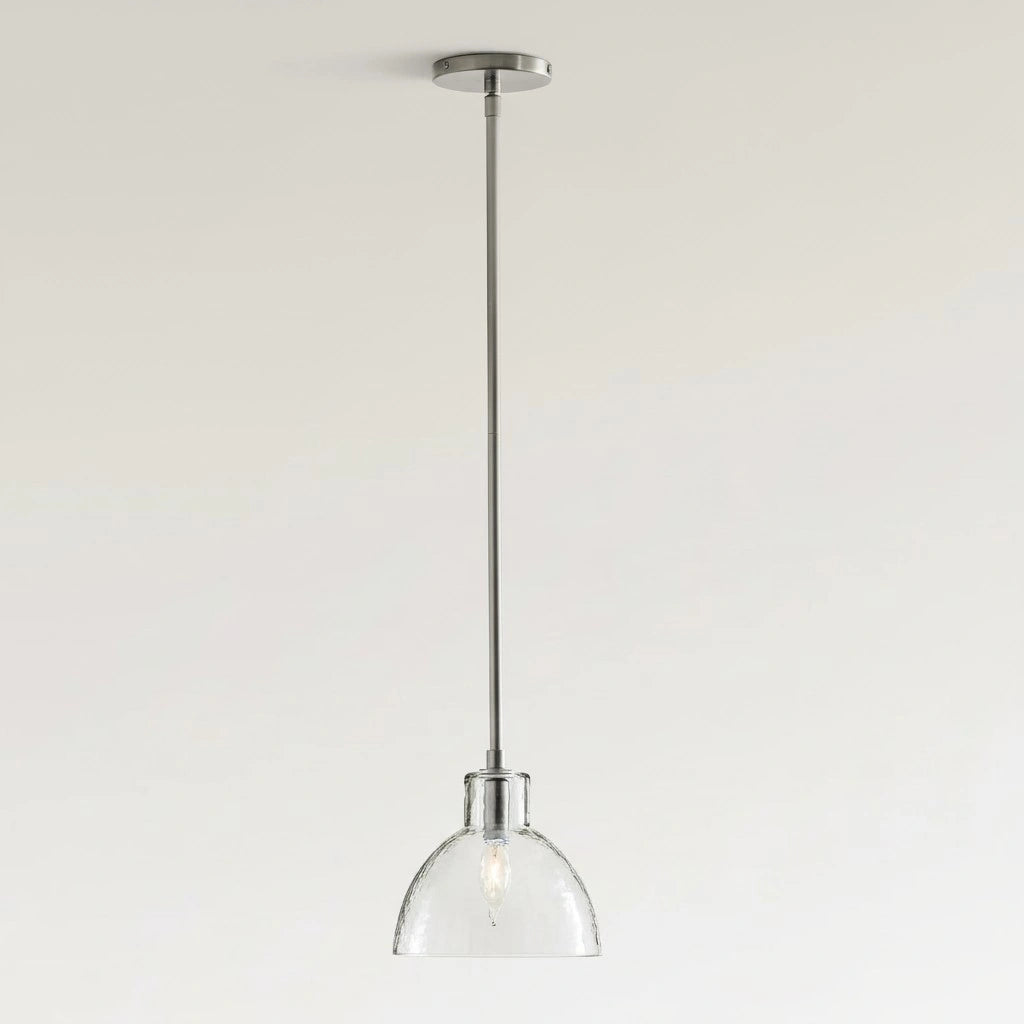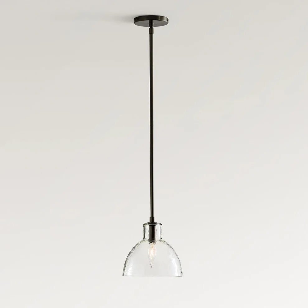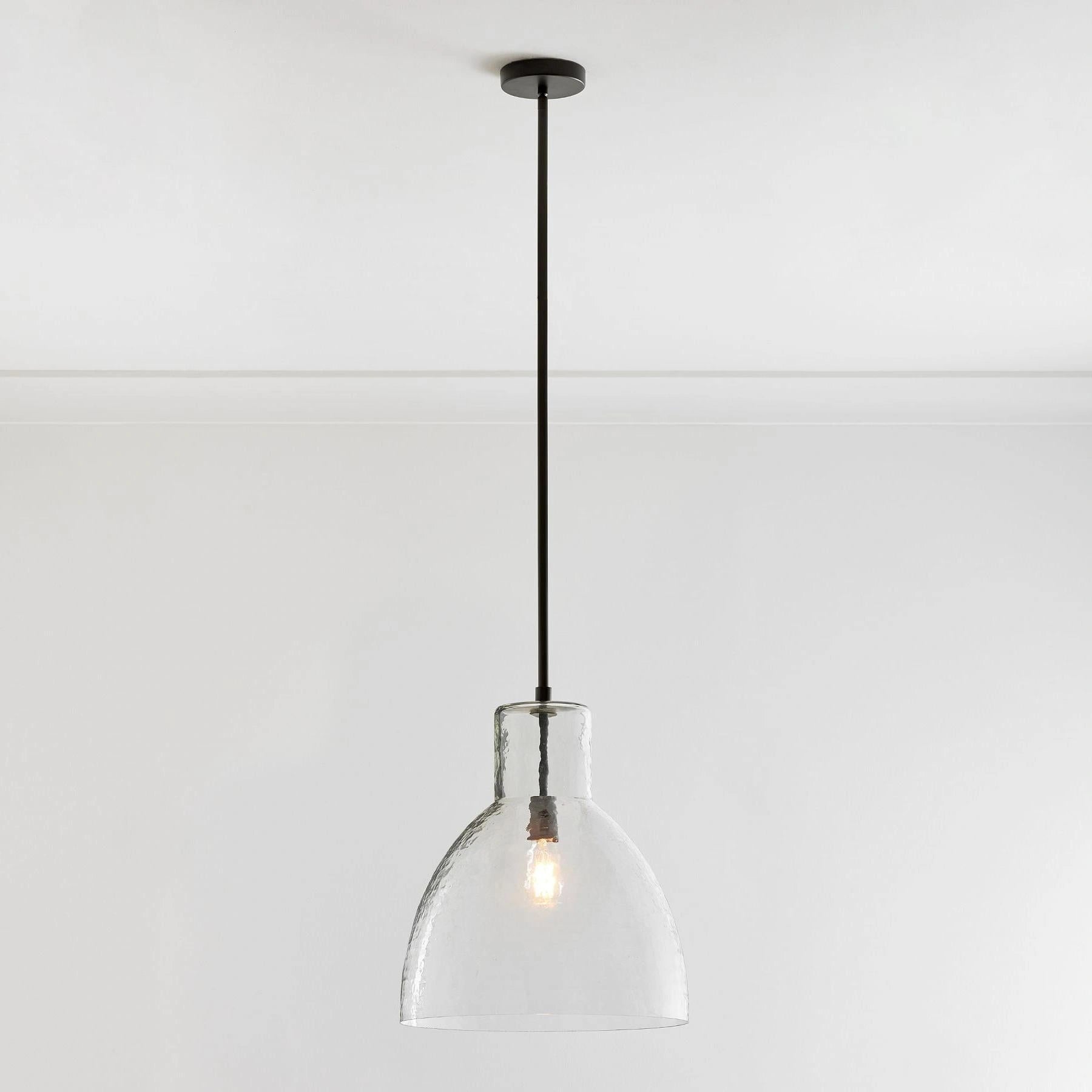 Farmhouse pendant with hammered glass shade. Casts soft, textured light for kitchen islands, dining, or entryways.