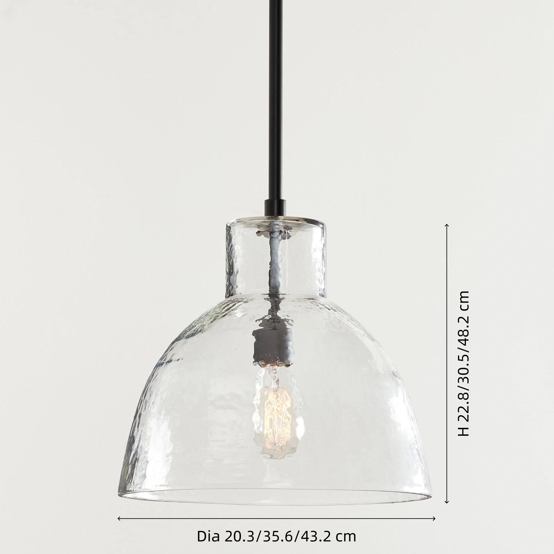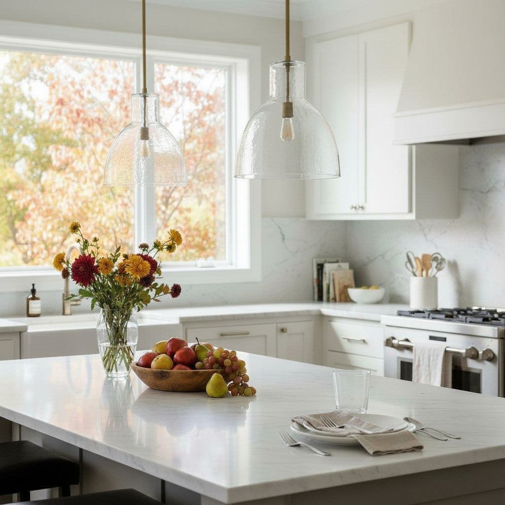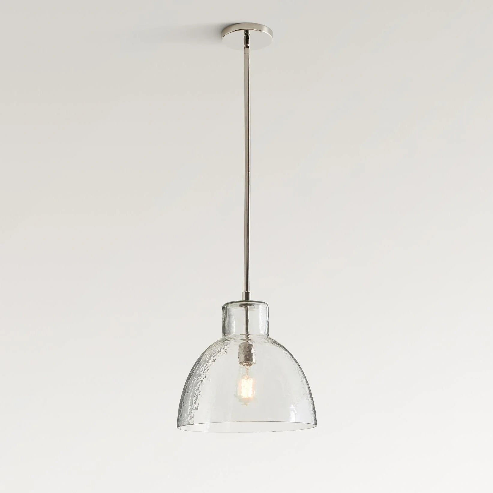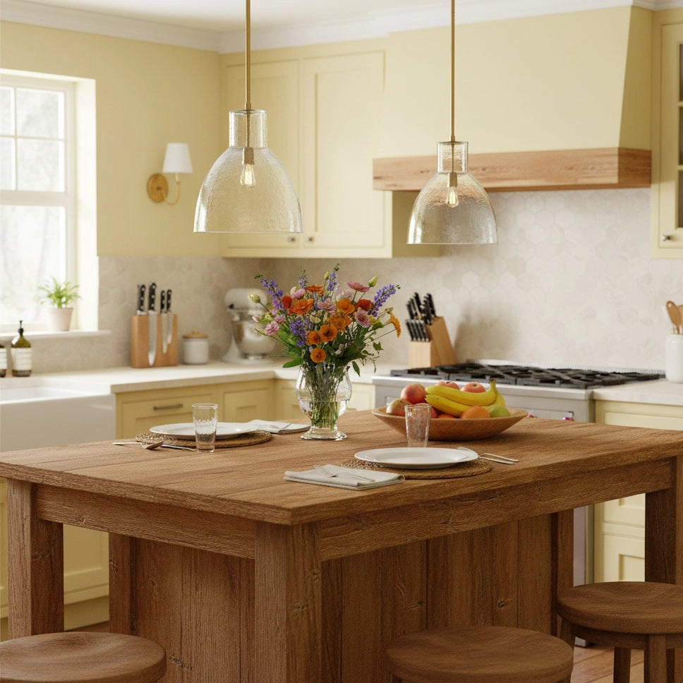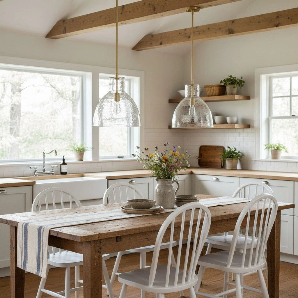 Farmhouse pendant with hammered glass shade. Casts soft, textured light for kitchen islands, dining, or entryways.