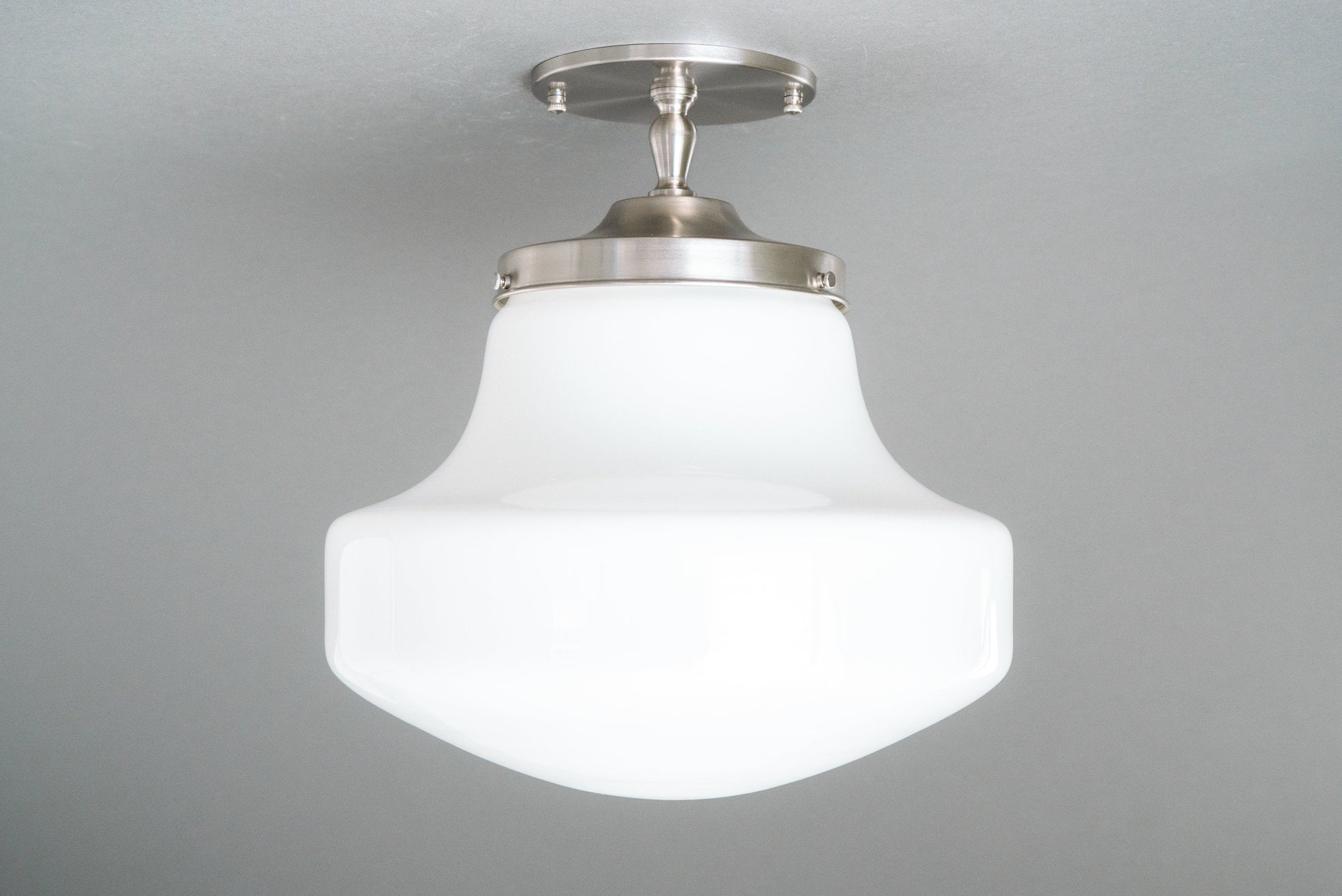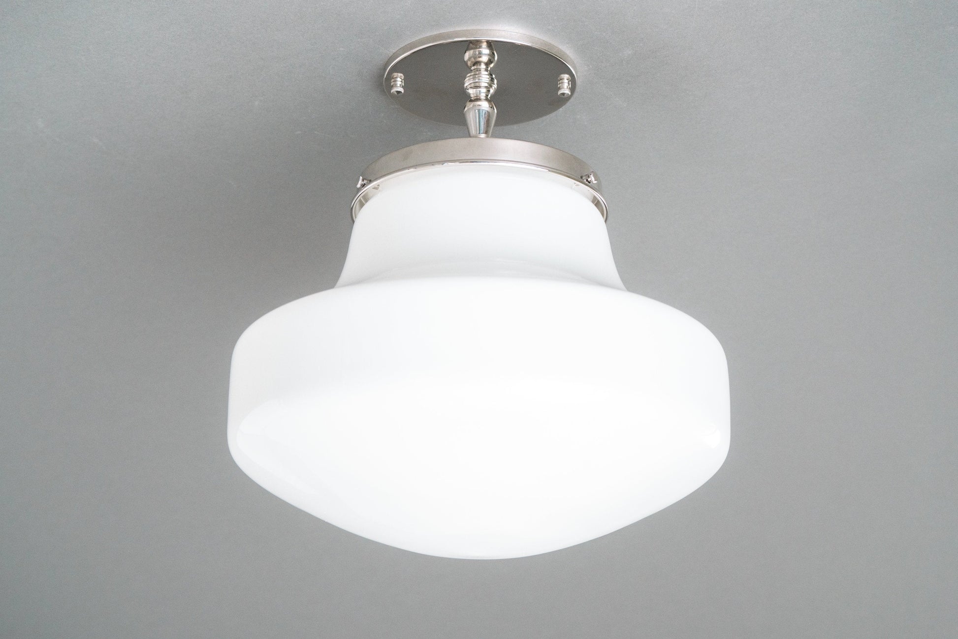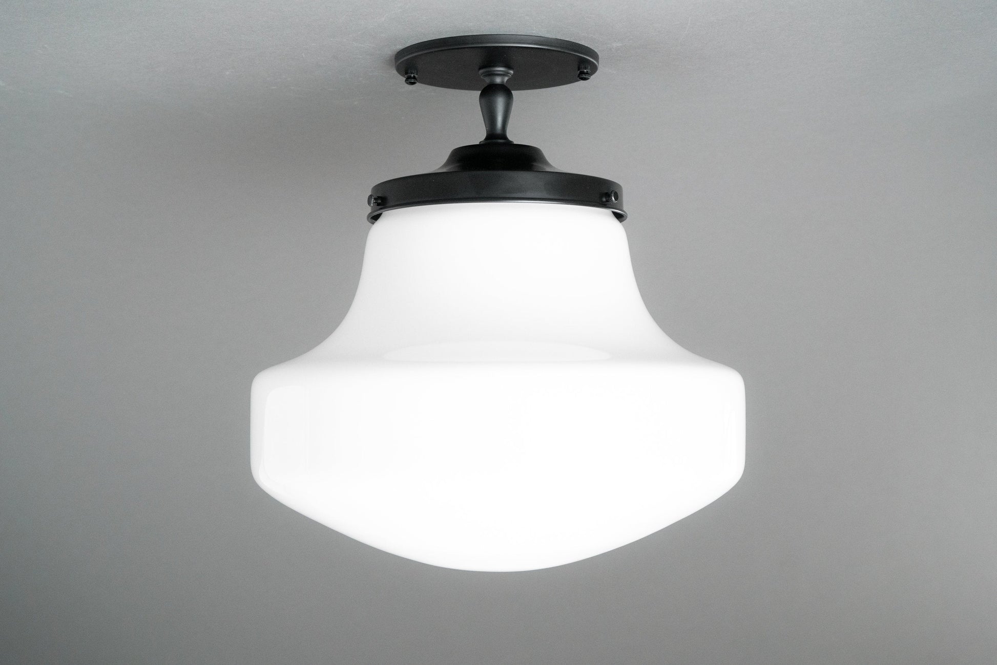 This Art Deco inspired semi-flush ceiling light features a thick white opal milk glass modern drop style globe. This globe was handblown in an American glass foundry.