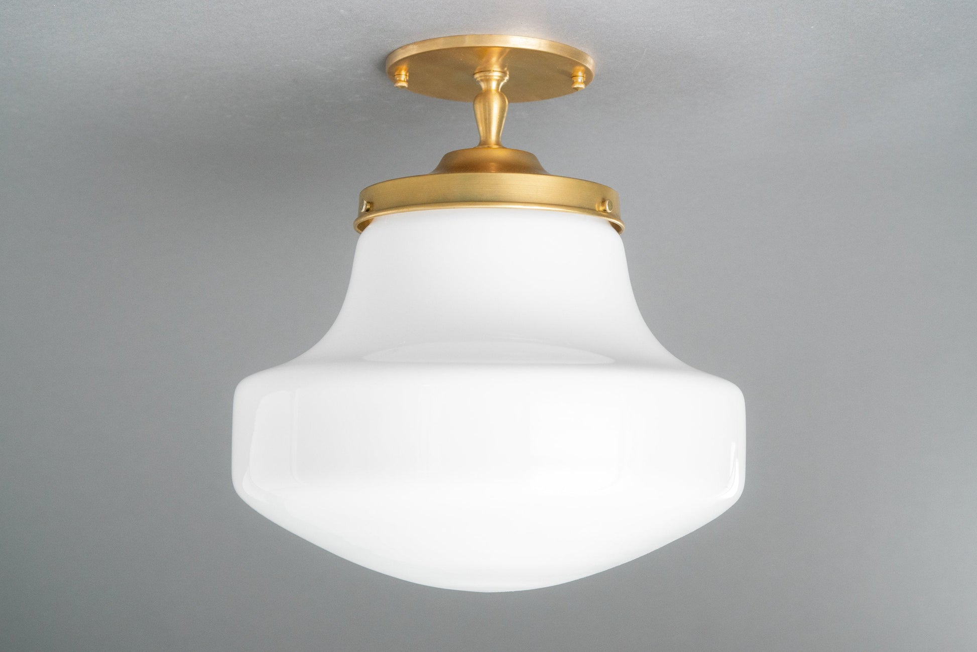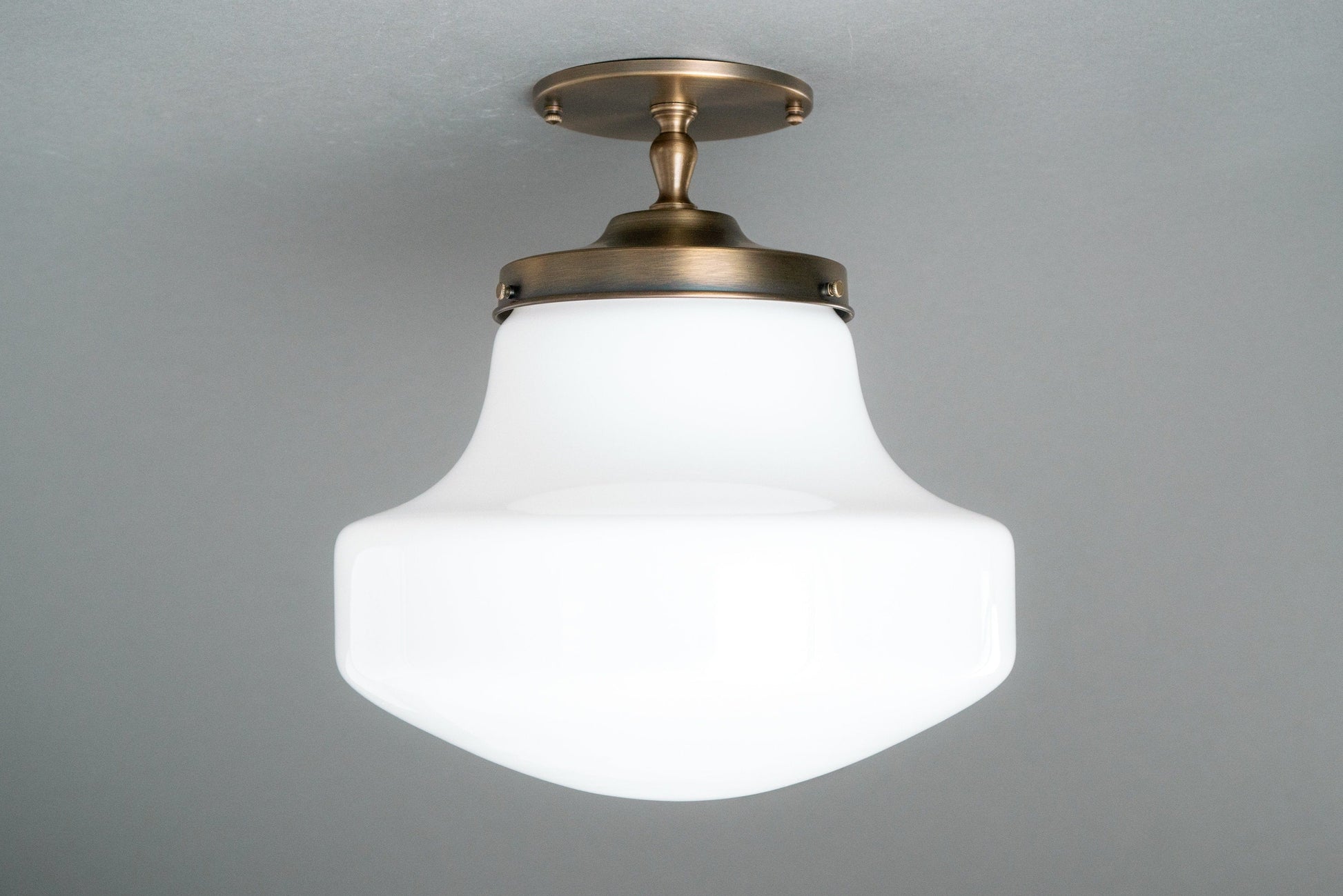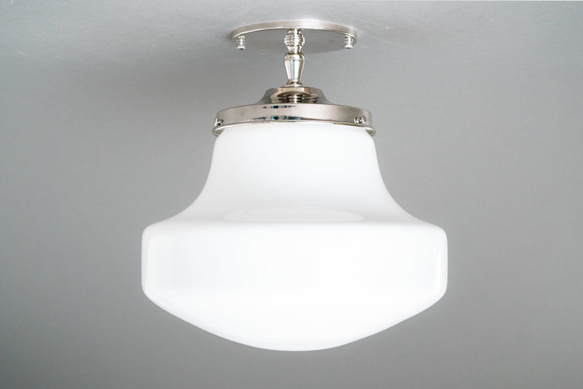 This Art Deco inspired semi-flush ceiling light features a thick white opal milk glass modern drop style globe. This globe was handblown in an American glass foundry.