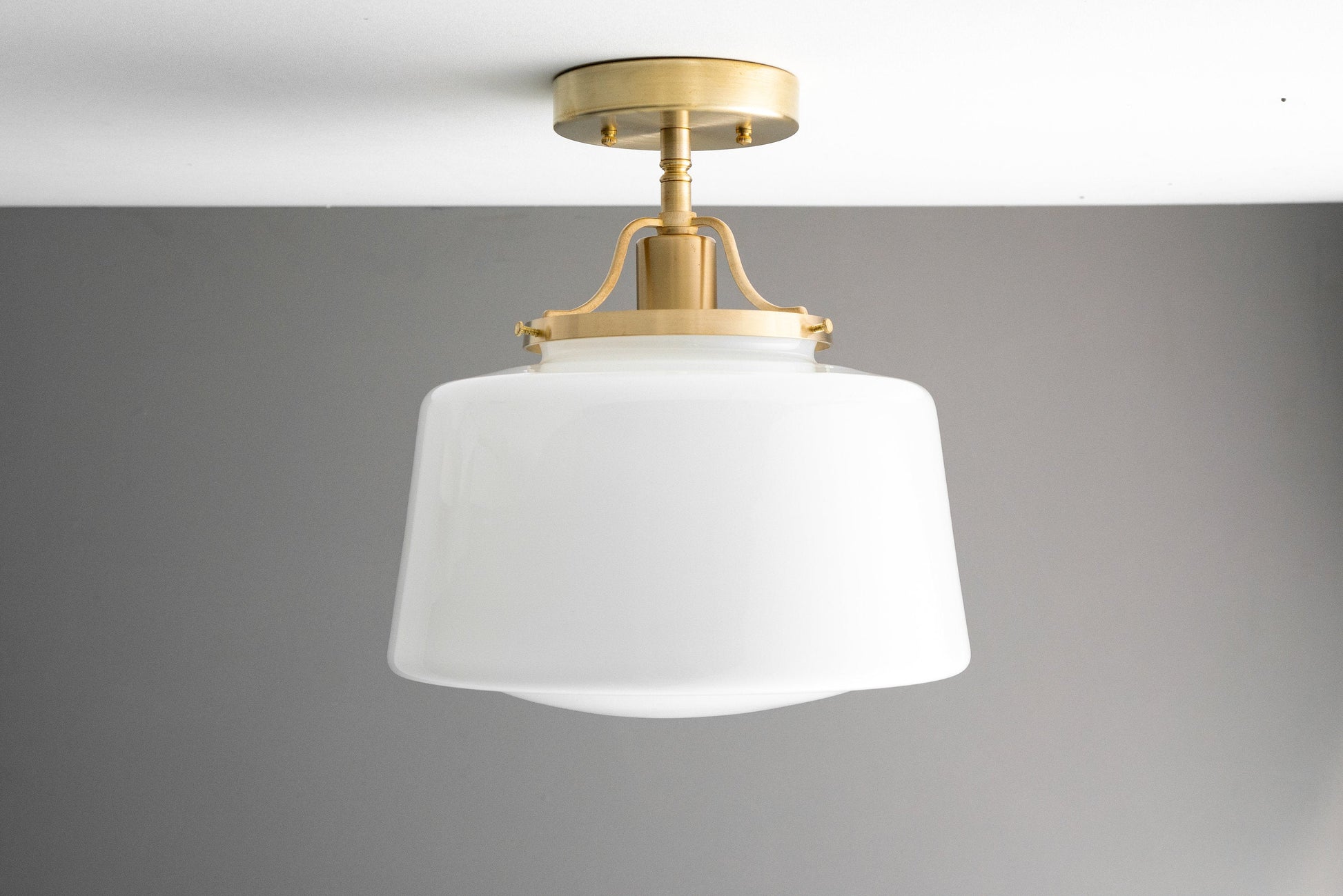 This semi-flush ceiling light features a 12" hand-blown milk glass schoolhouse drum.