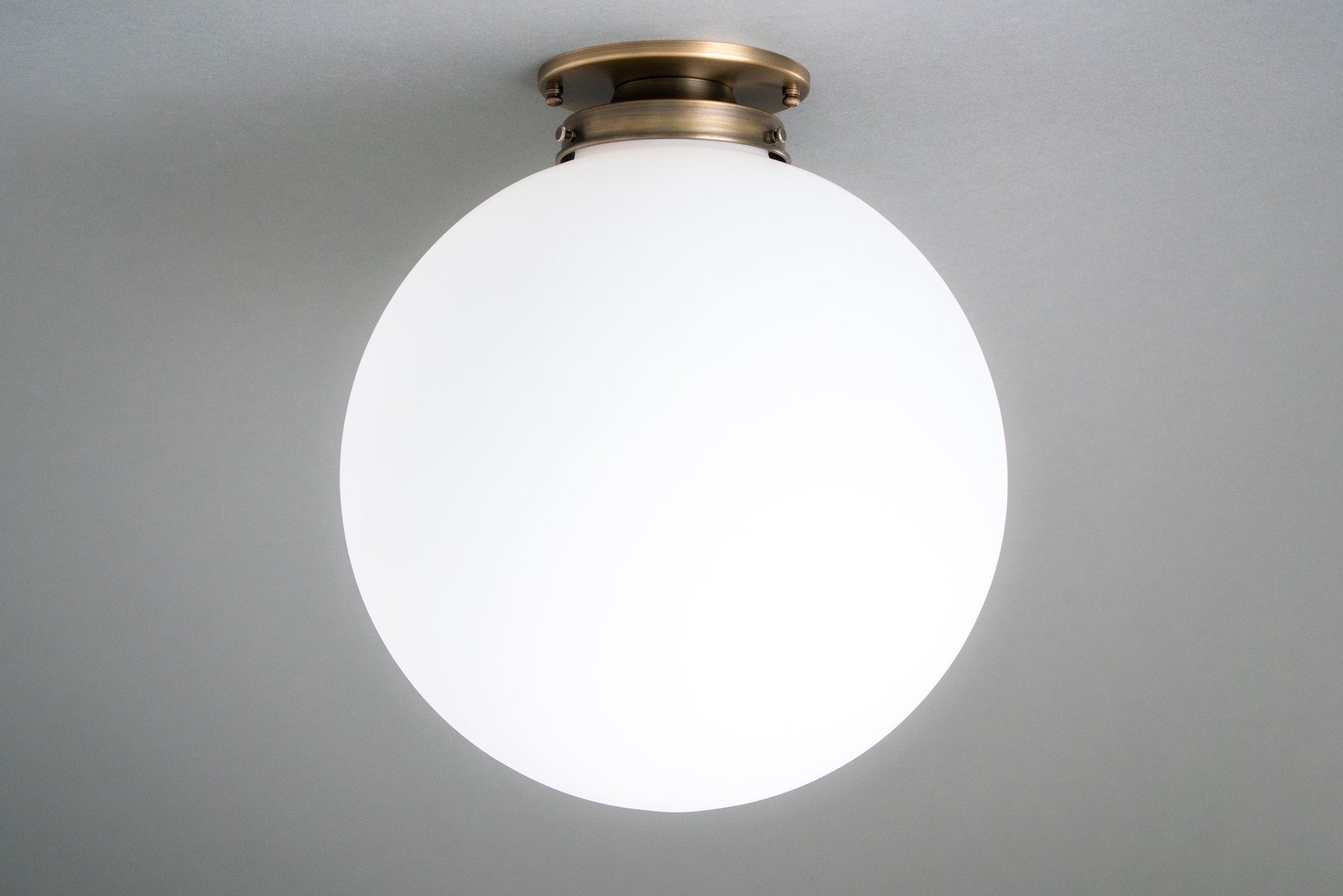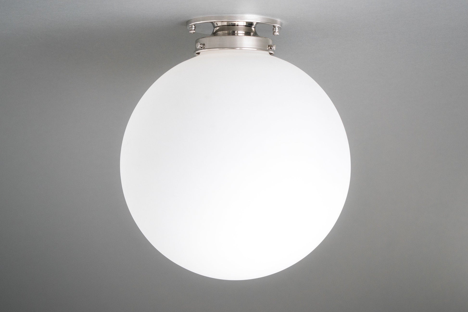 This flush Art Deco ceiling light features a 12inch satin glass globe. This globe is constructed of thin delicate glass that is lightly textured giving the globe a soft satin finish.