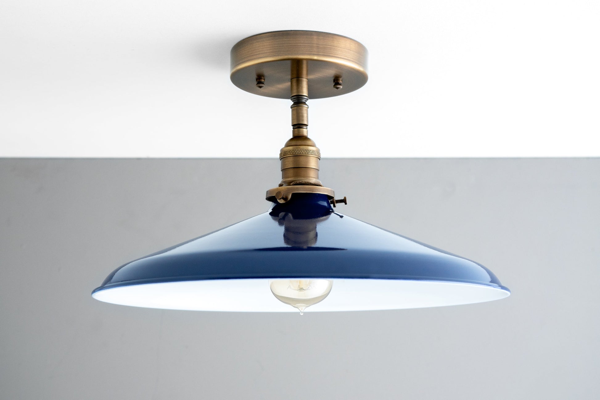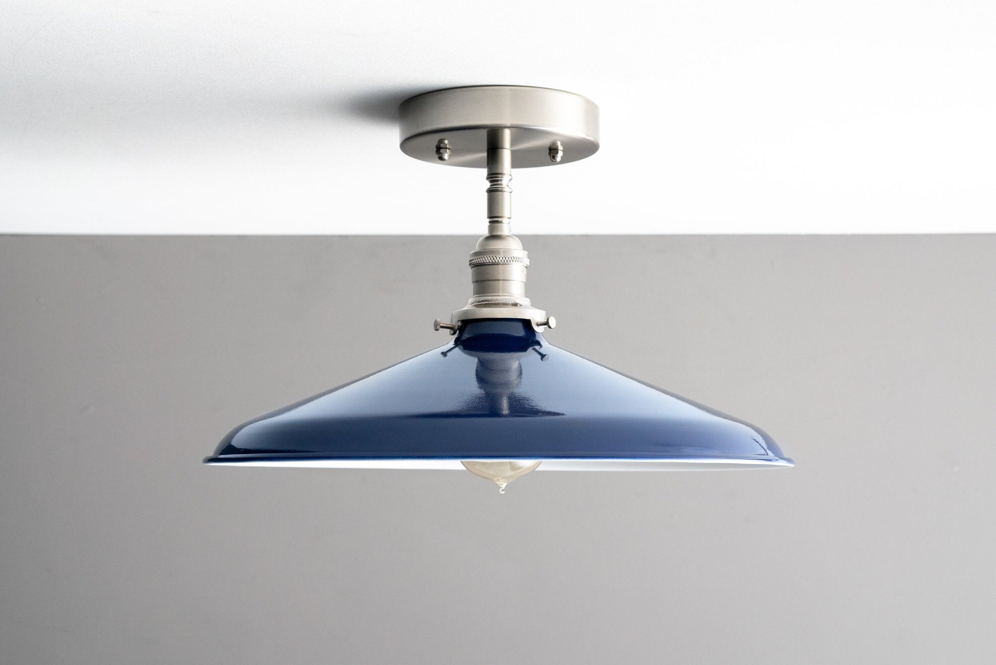 This industrial semi-flush ceiling light features a 14" blue metal shade.