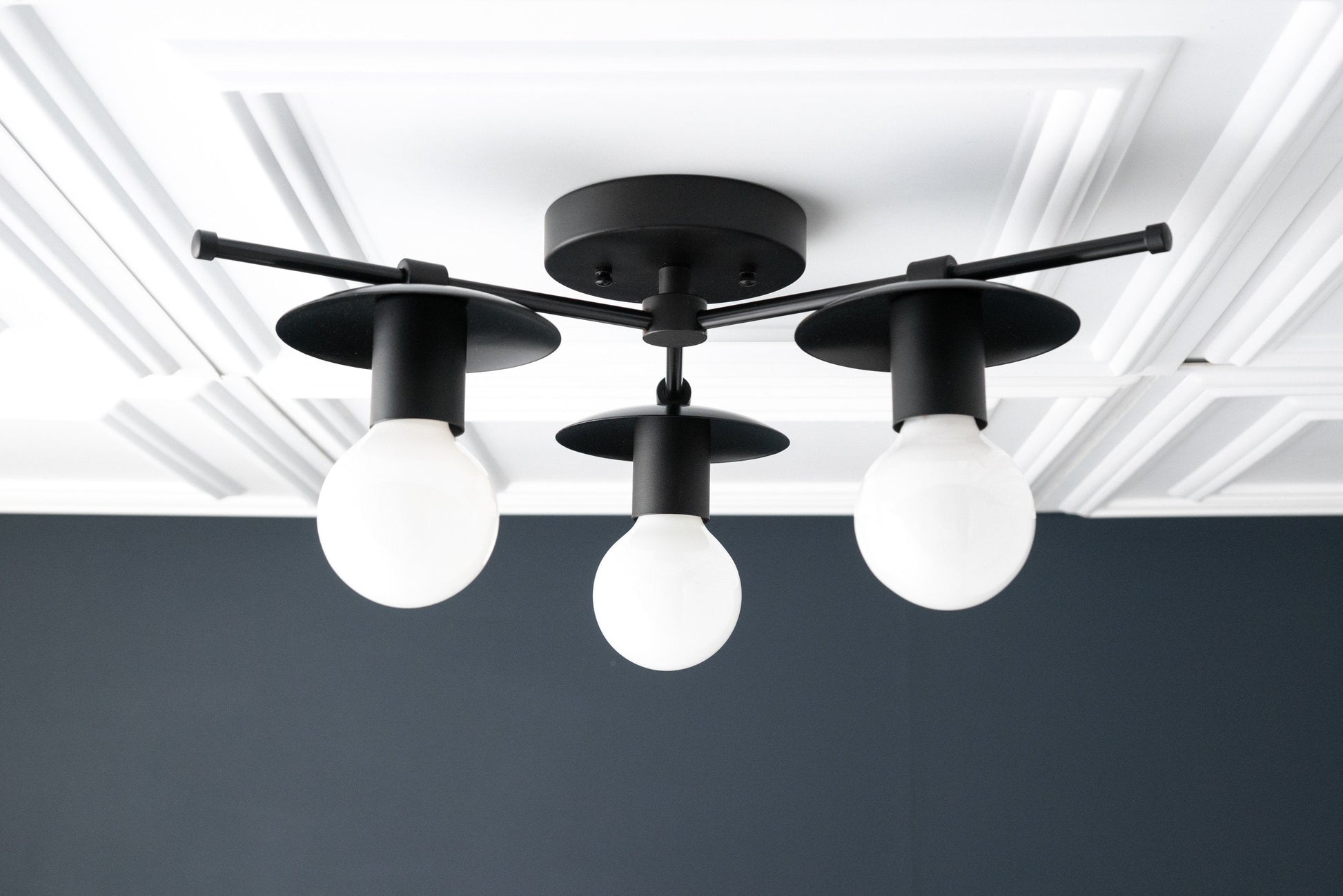 This unique Art Deco inspired 3 bulb ceiling light fixture feature 5inch decorative backsplashes behind each bulb. The light fixture can be mounted on the ceiling or on the wall as a wall sconce or vanity light fixture.