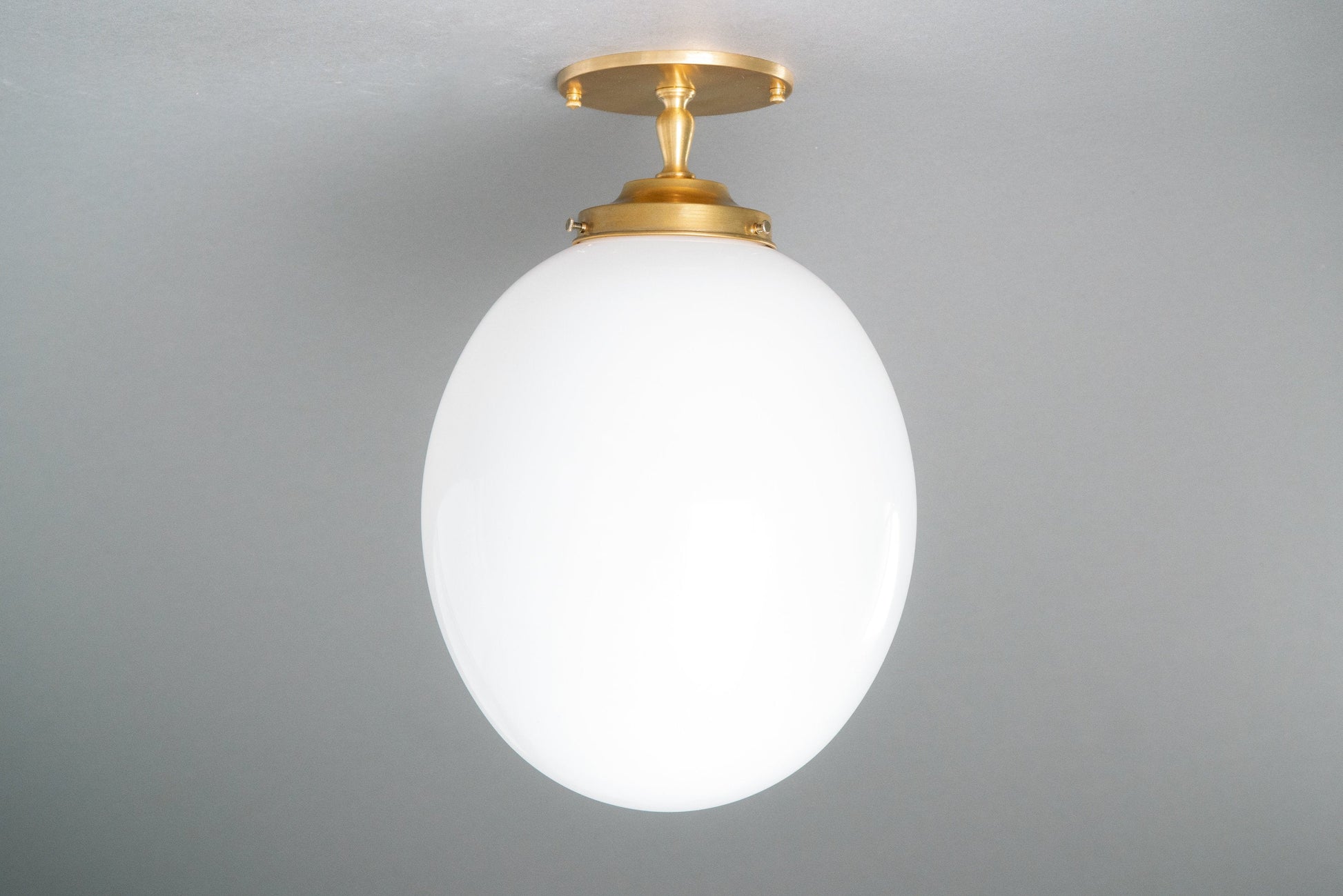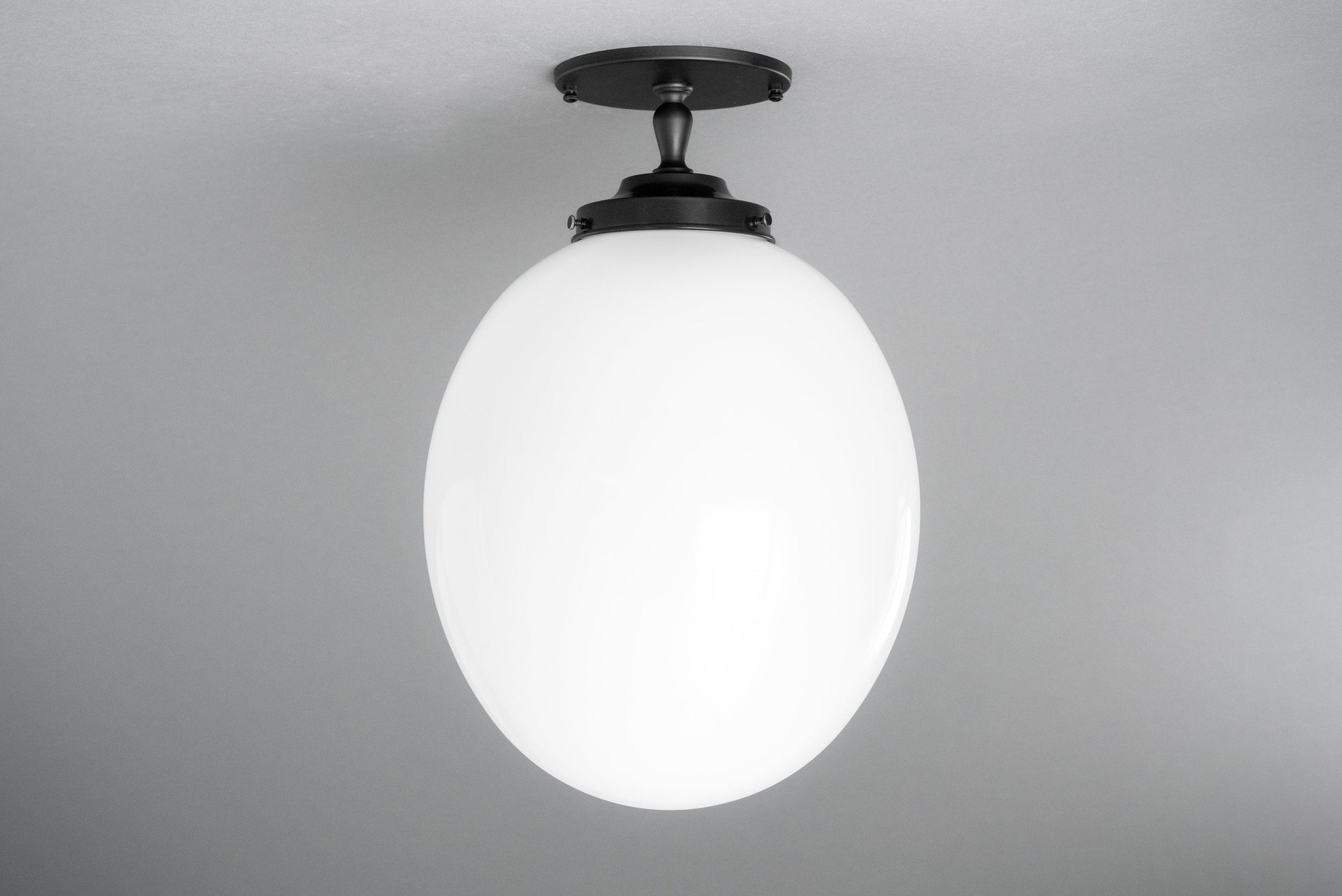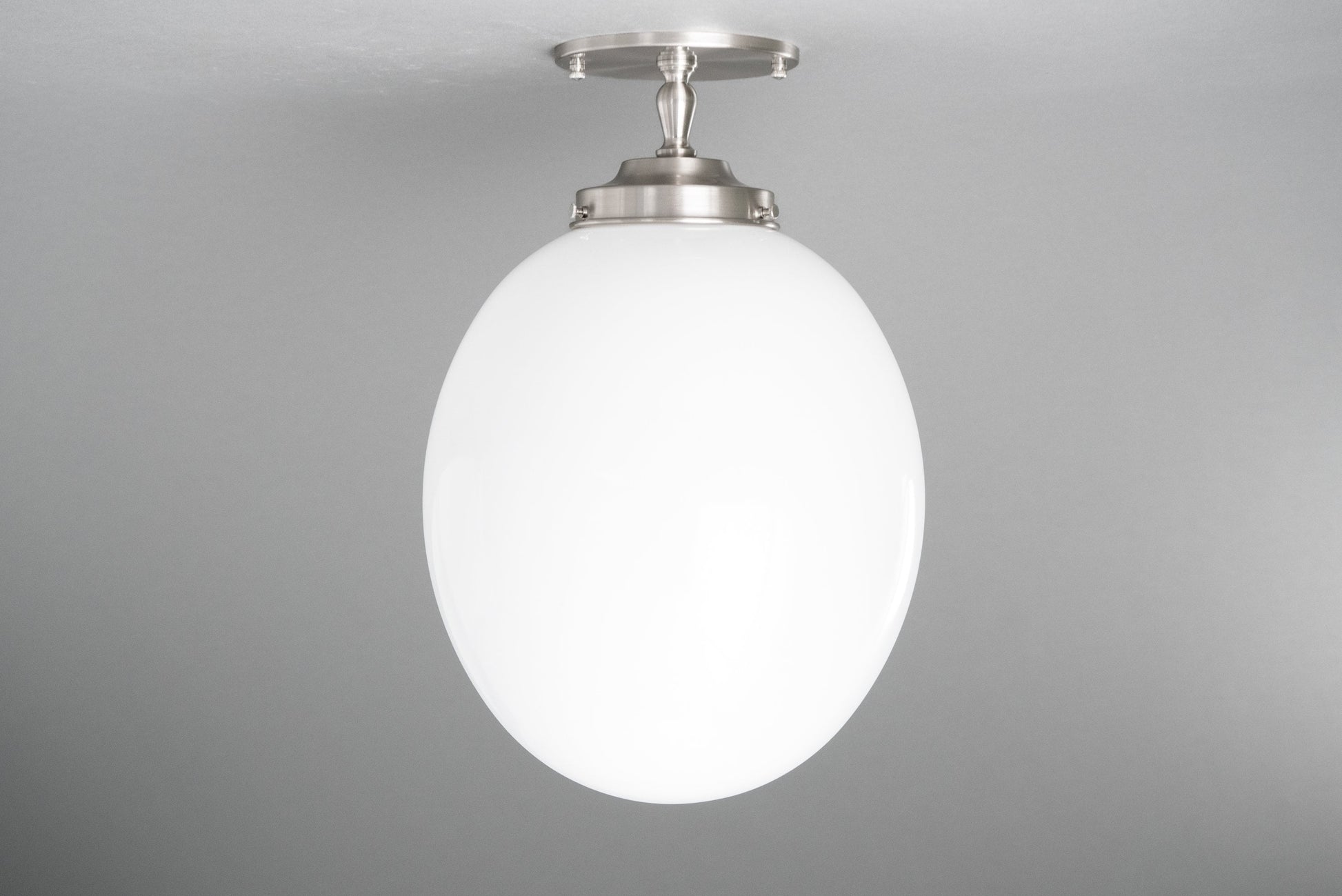 This Art Deco semi-flush ceiling light features a 12inch tall egg shaped white Acrylic oval globe.