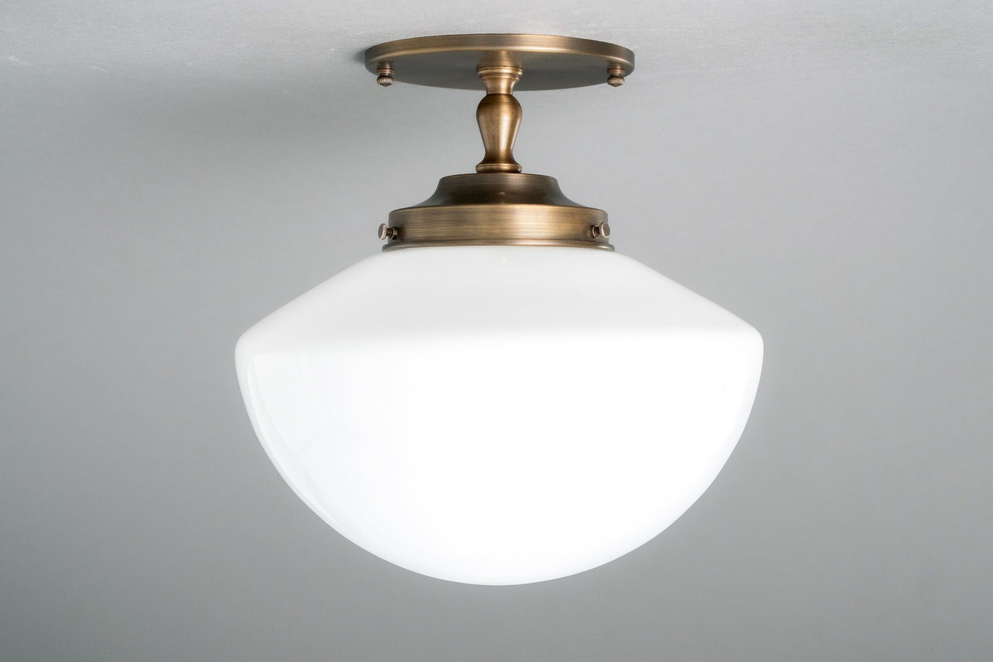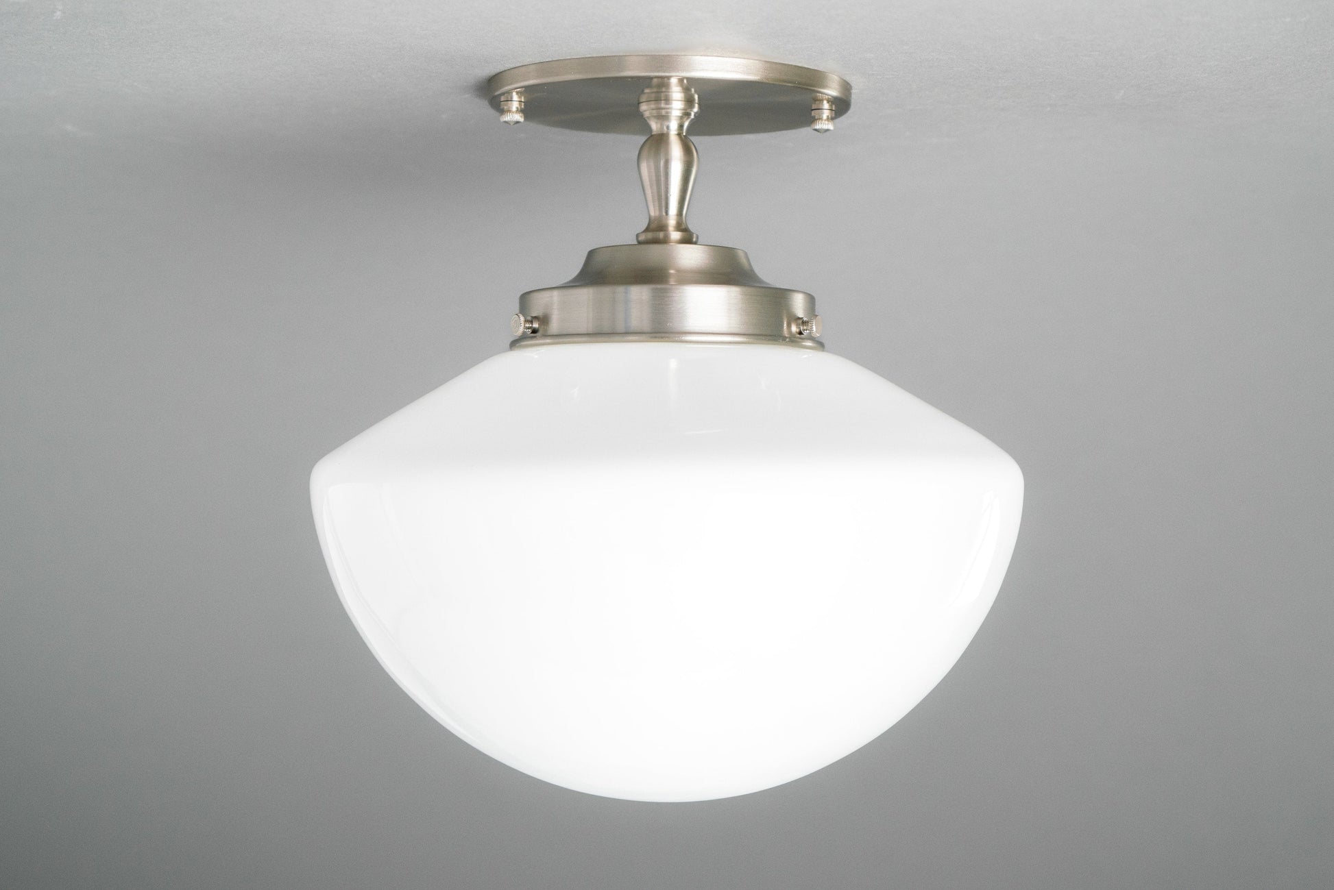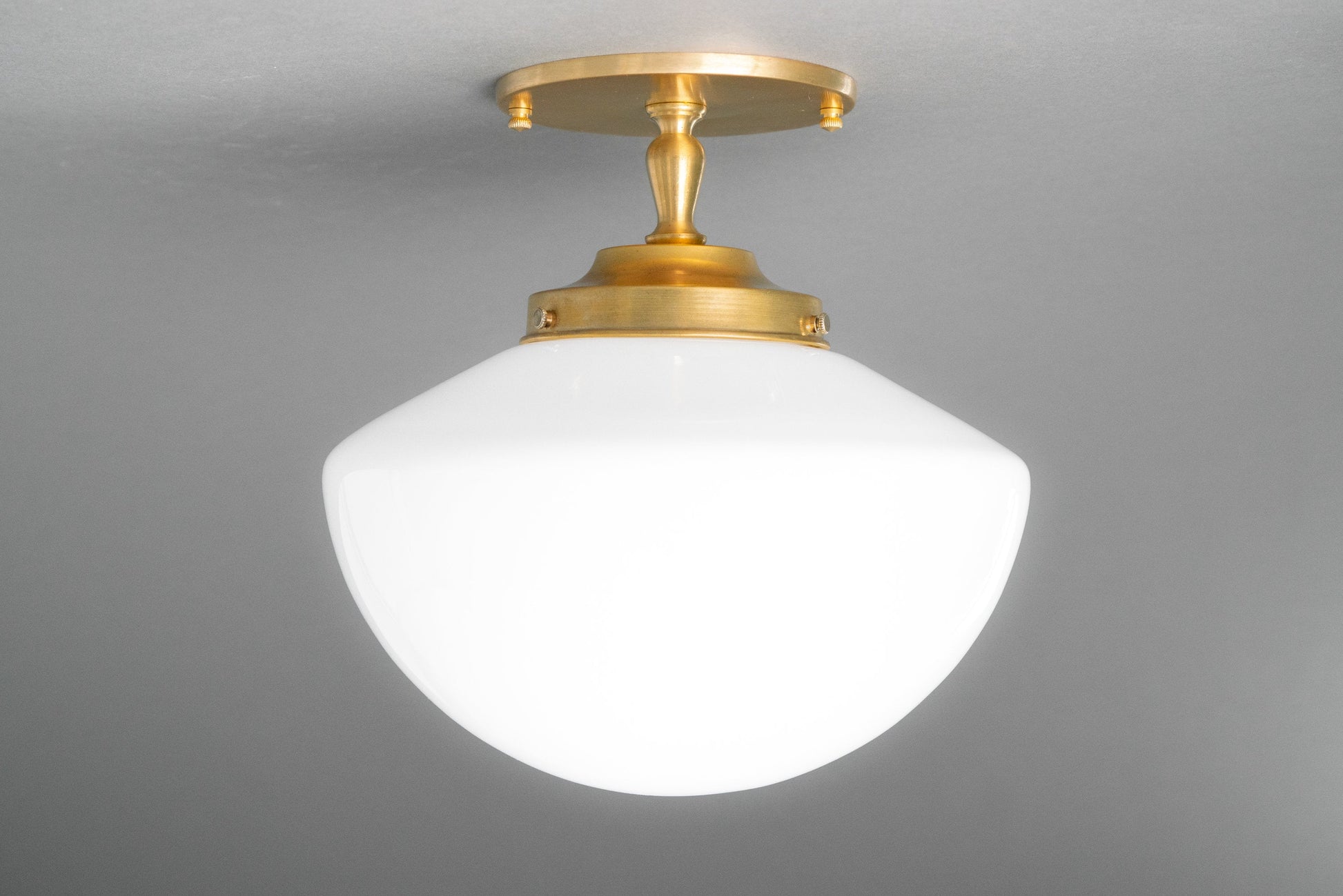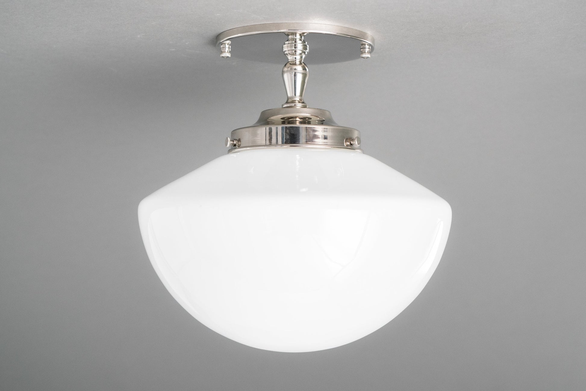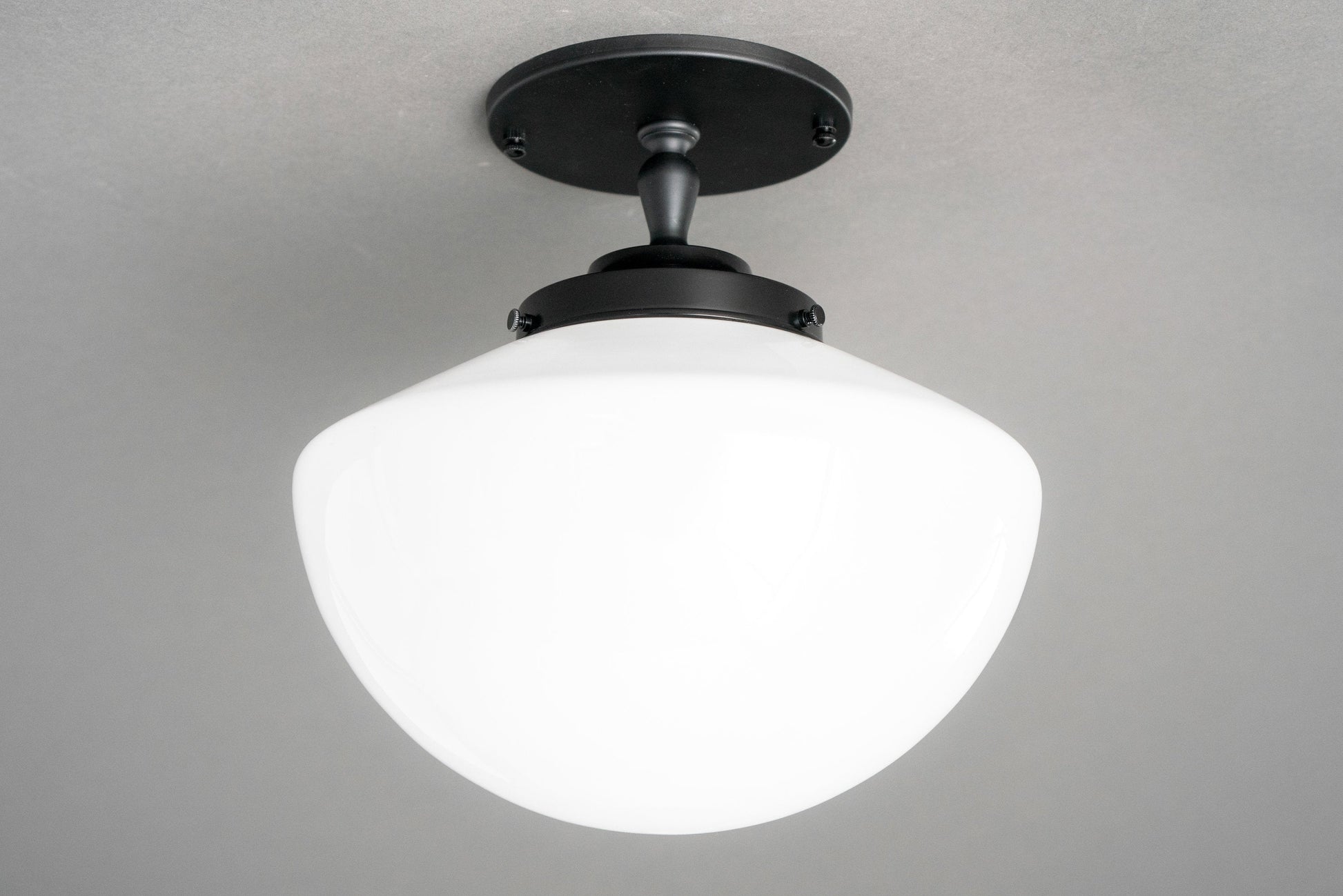 This Art Deco style semi-flush ceiling light features an opal white milk glass half ball globe. This unique 10inch thick glass globe was hand blown in an American glass foundry.