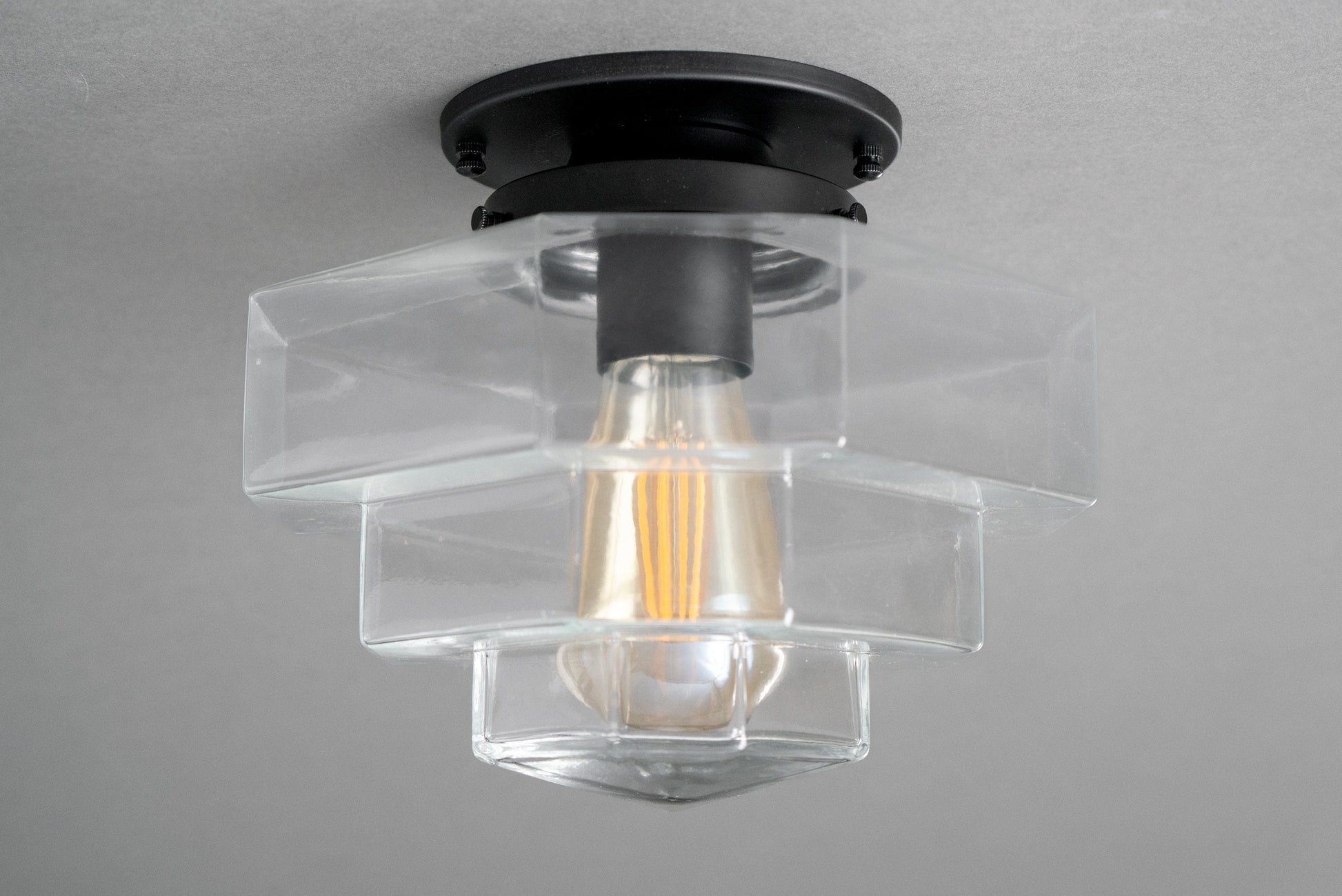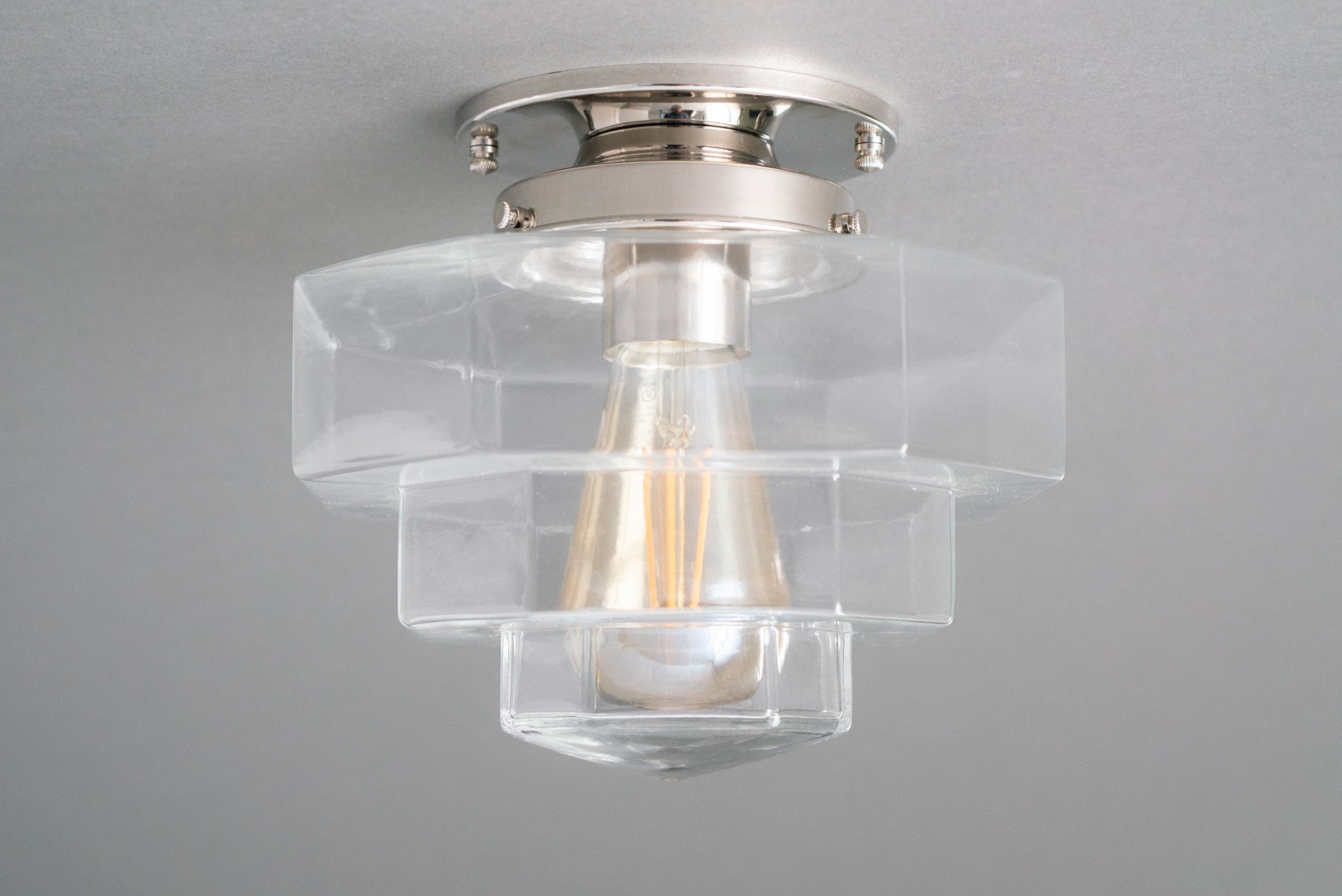 This Art Deco ceiling light features a delicate clear glass geometric stepped globe.