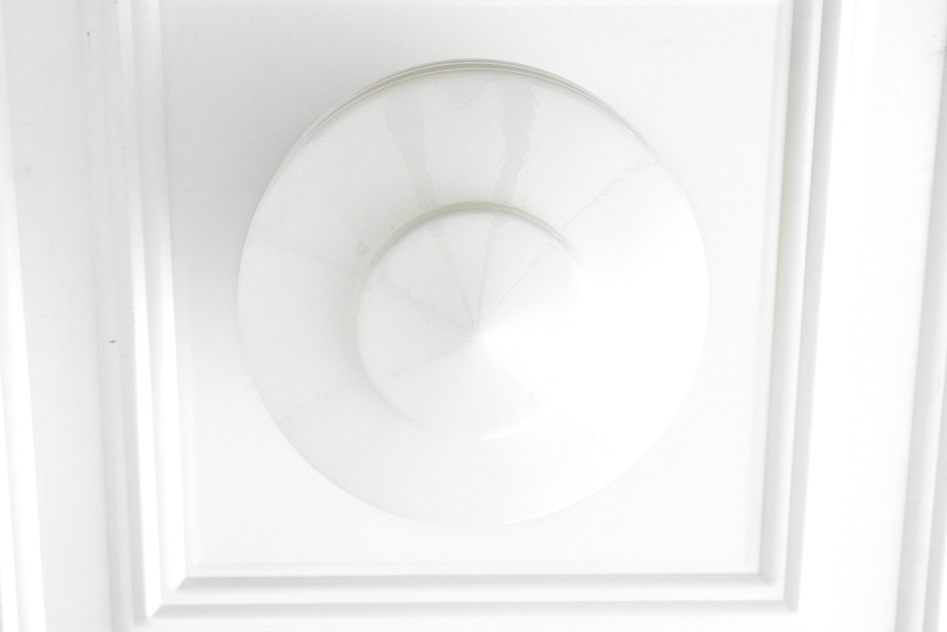 This colorful modern ceiling light features a ribbed white opal milk glass globe that has been handblown in an American glass foundry.