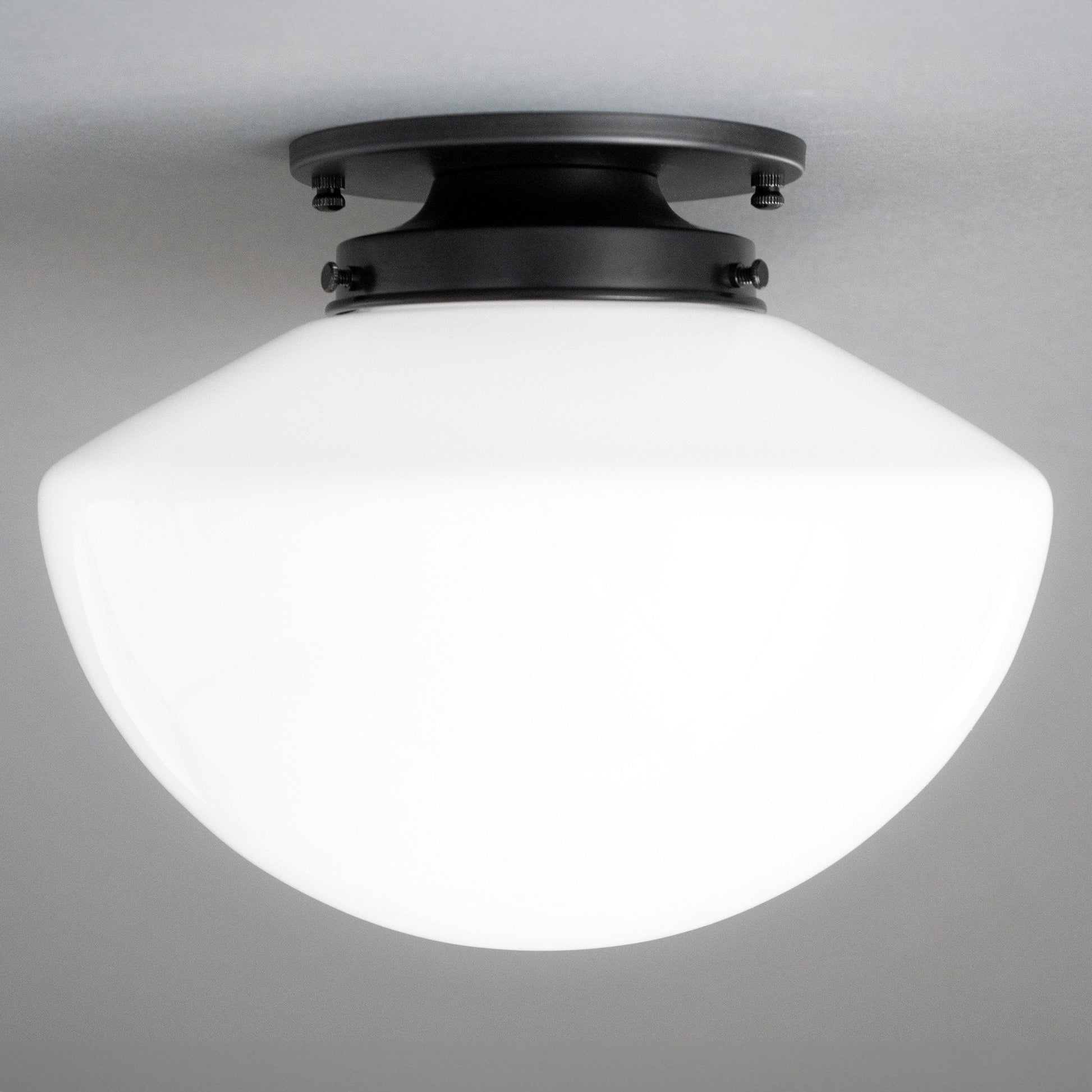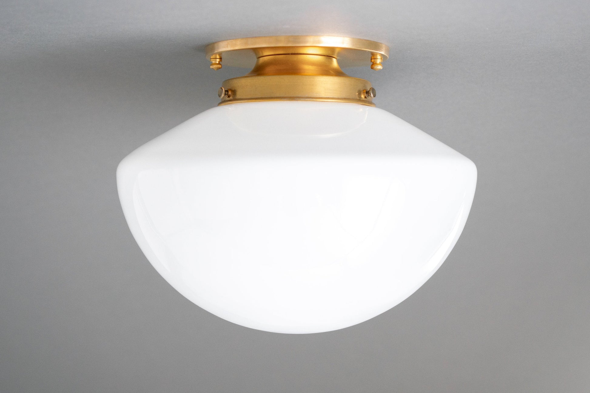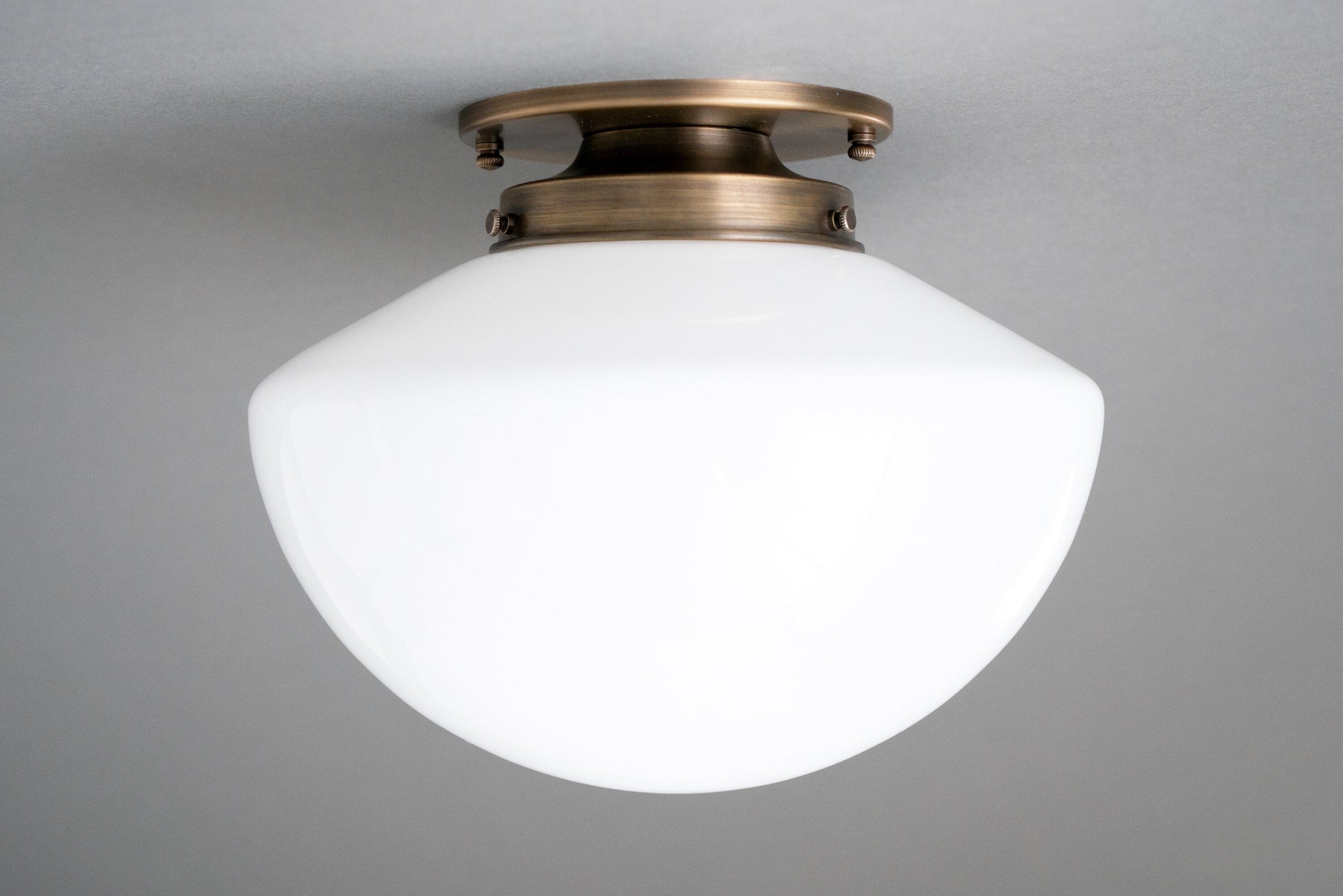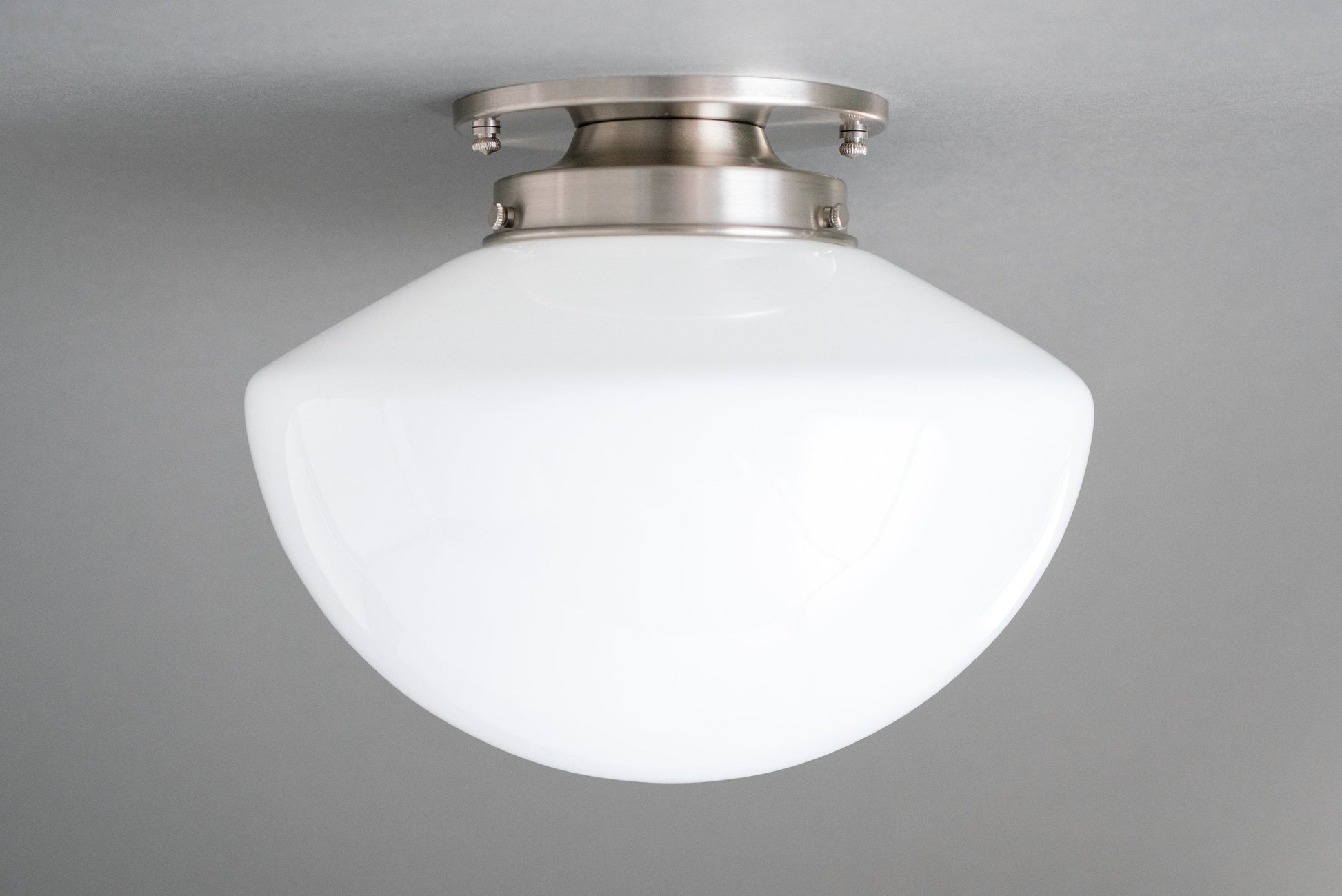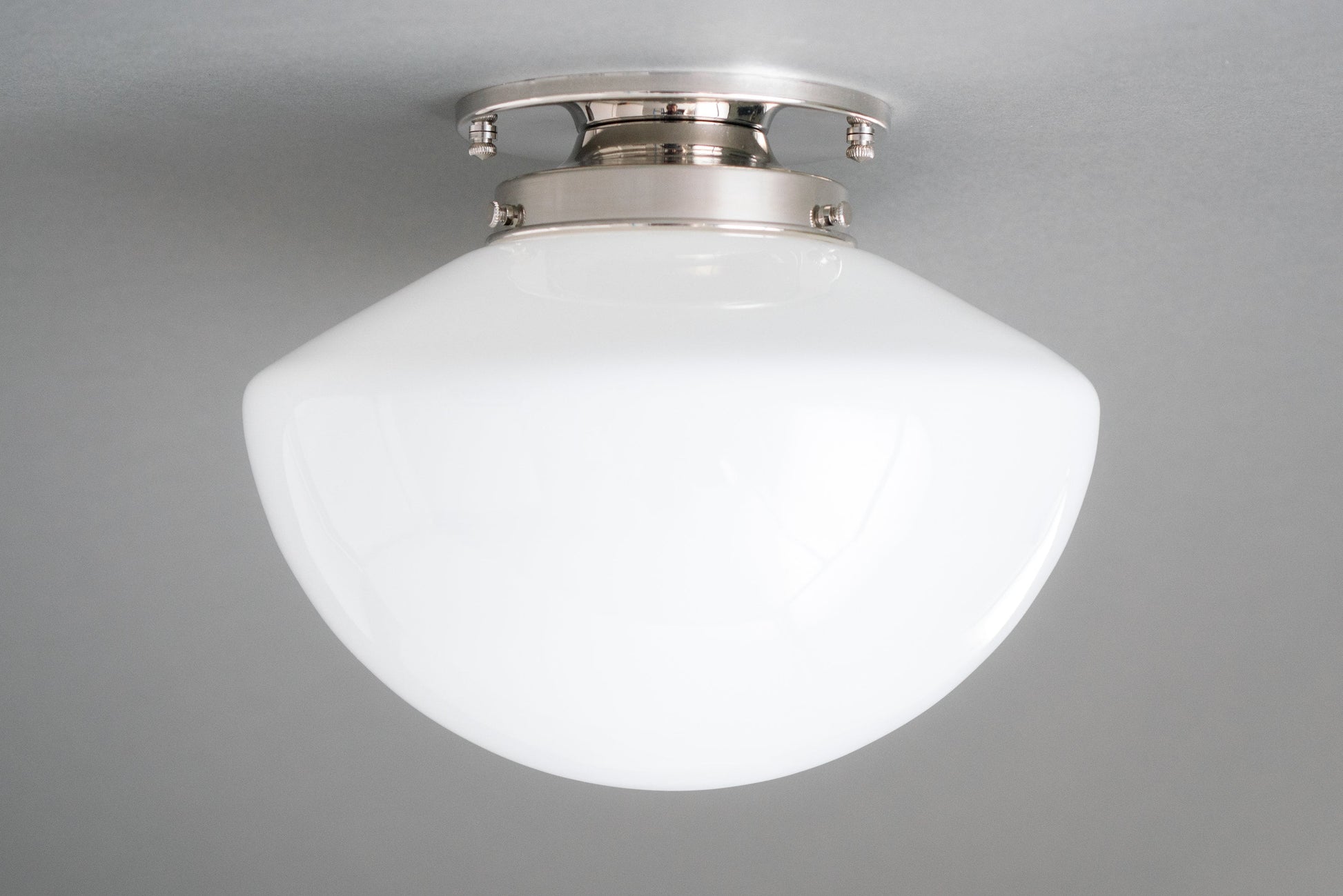 This Art Deco inspired flush ceiling light features a 10inch white opal glass half ball globe. This unique thick glass globe was hand blown in an American glass foundry.