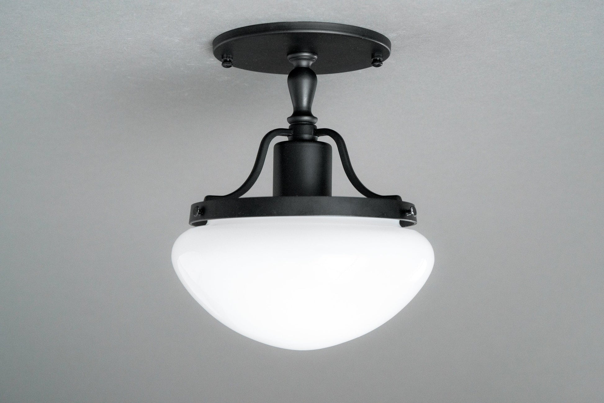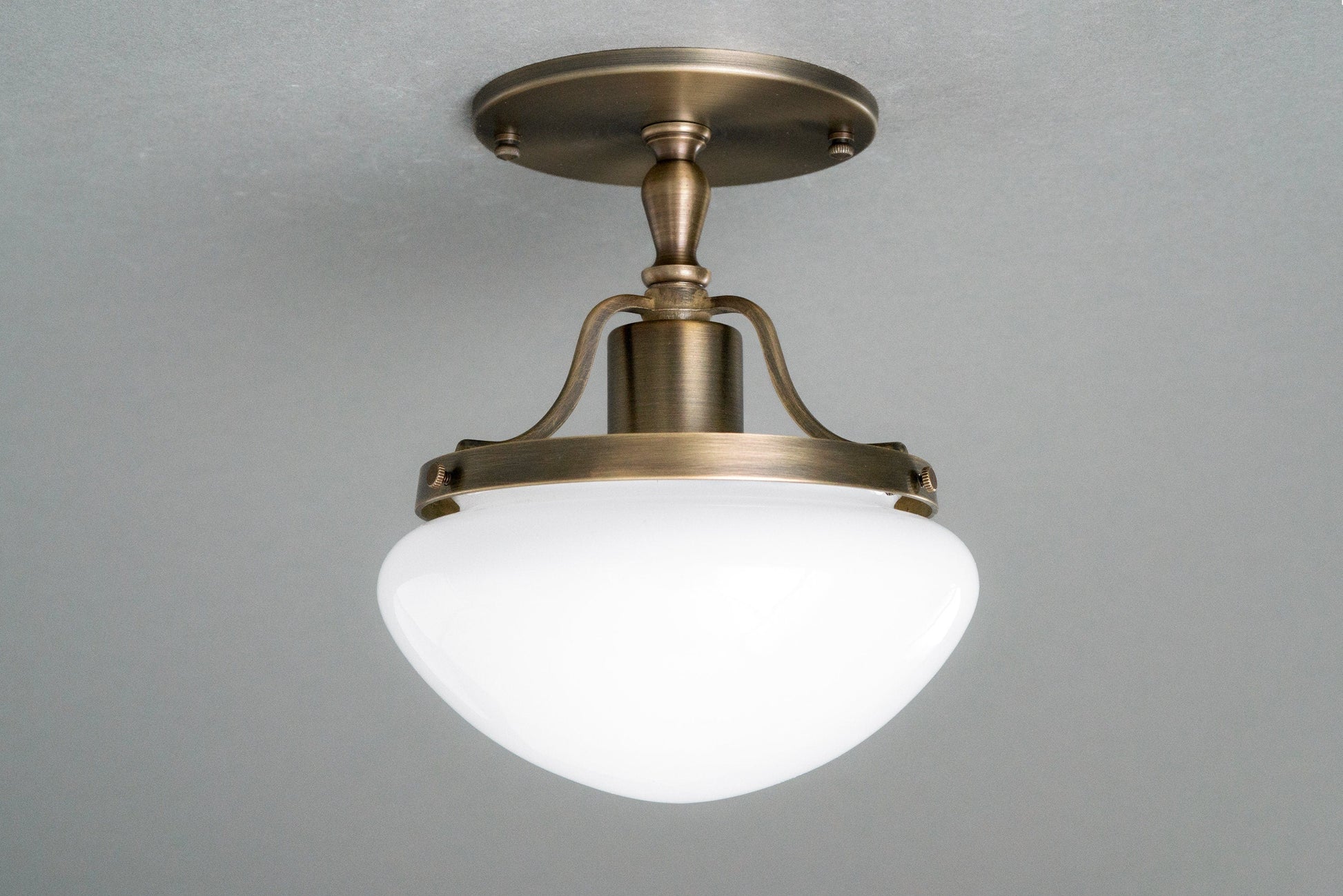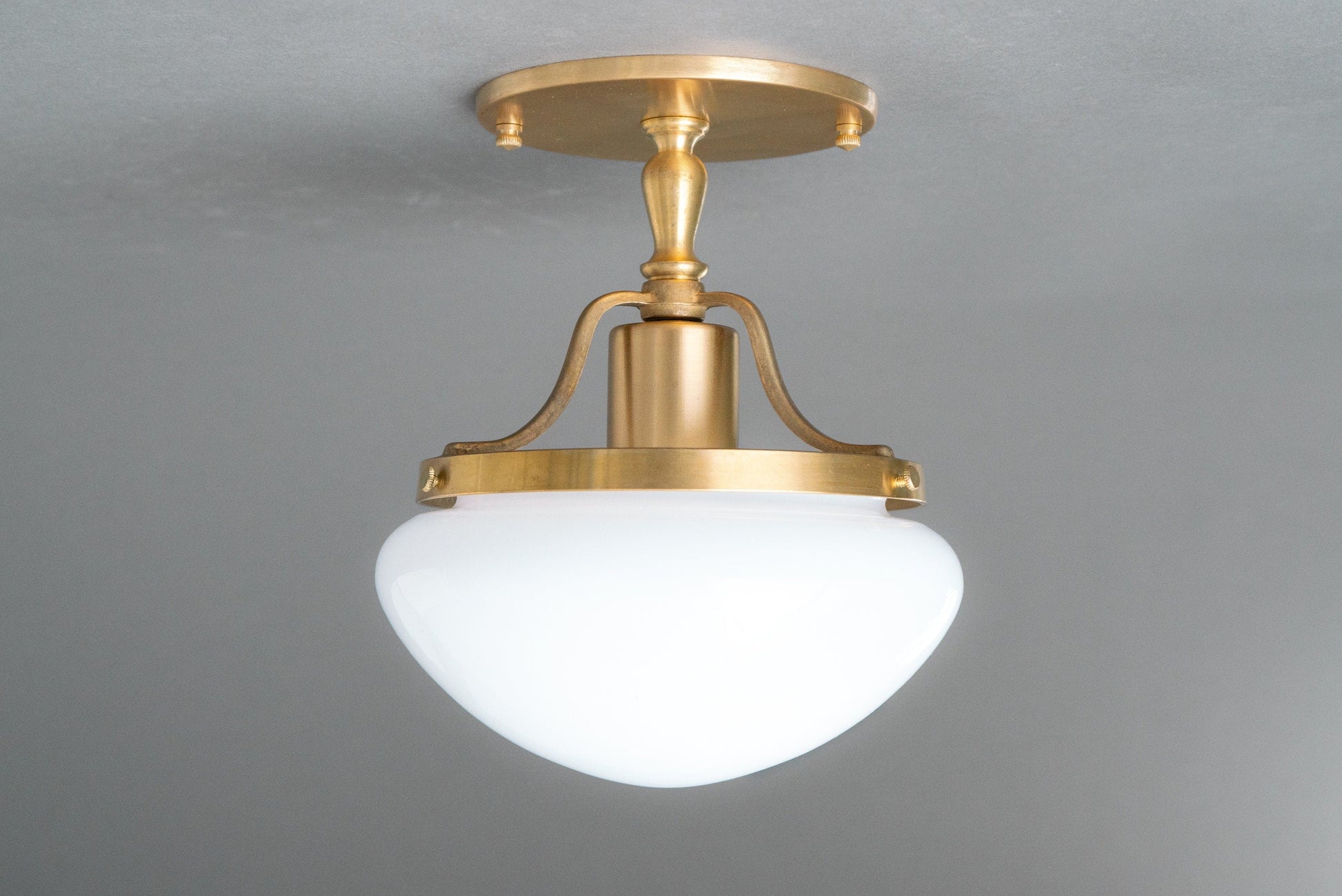 This Art Deco ceiling light is made of solid brass and features a white glass mushroom shaped dome shade.