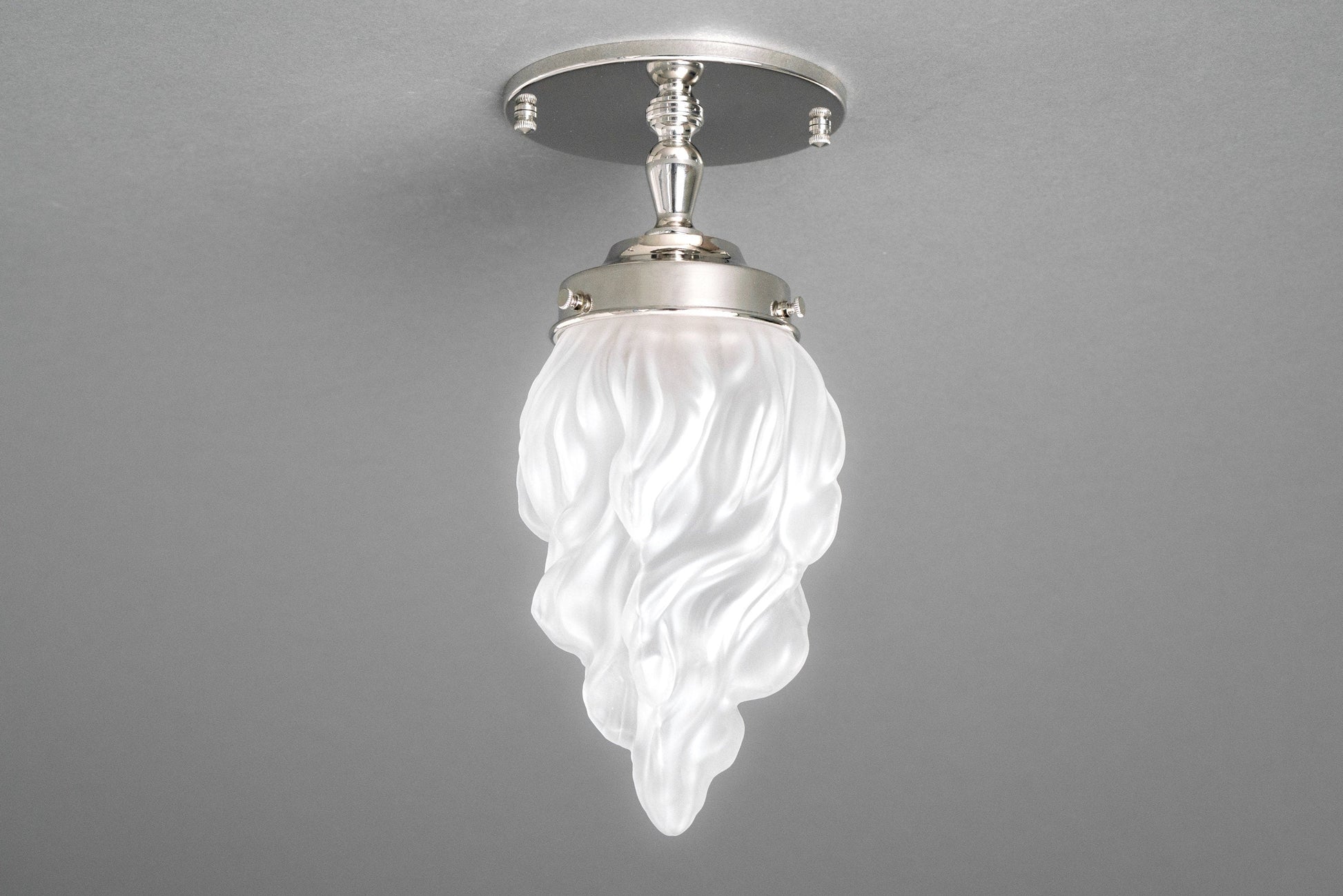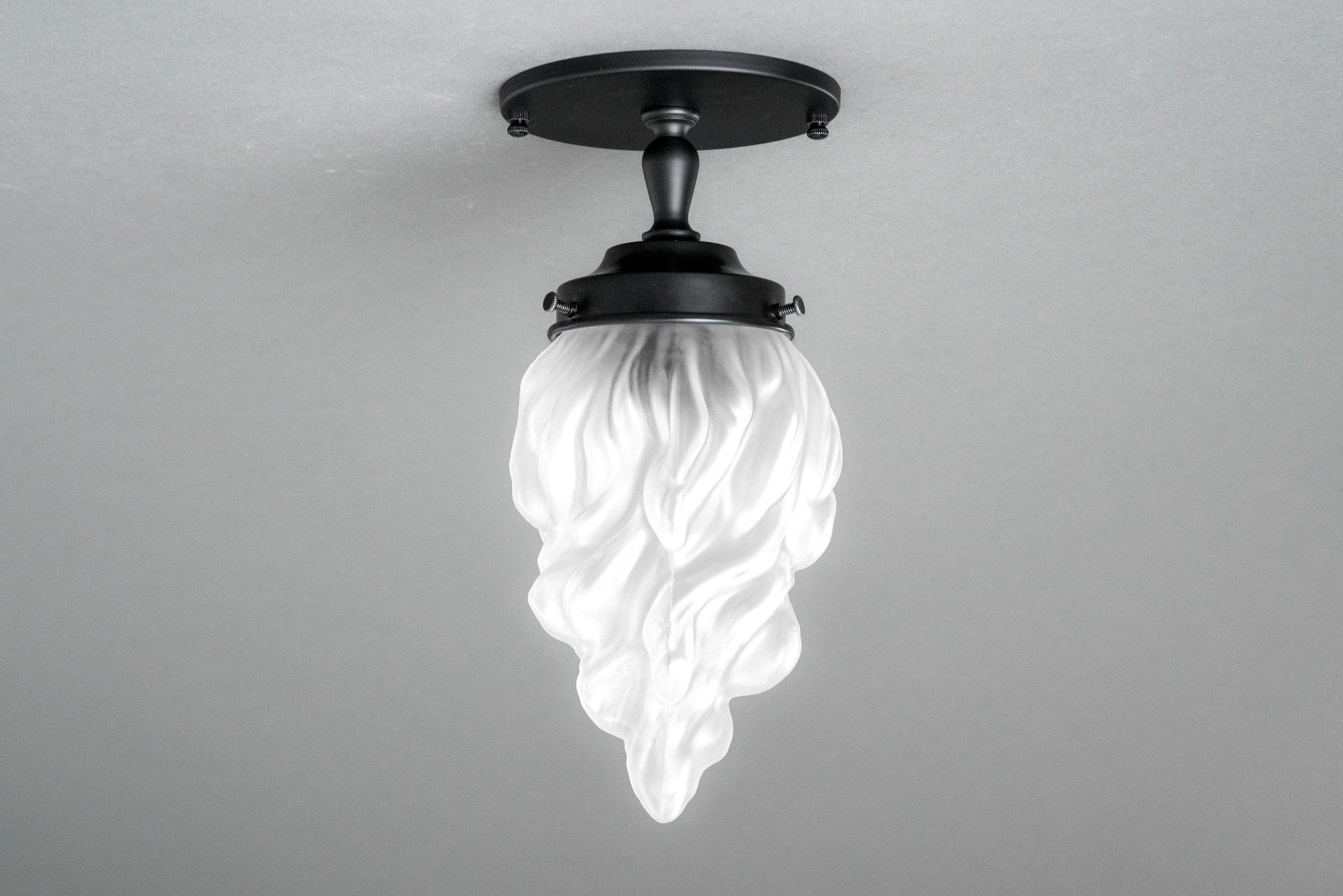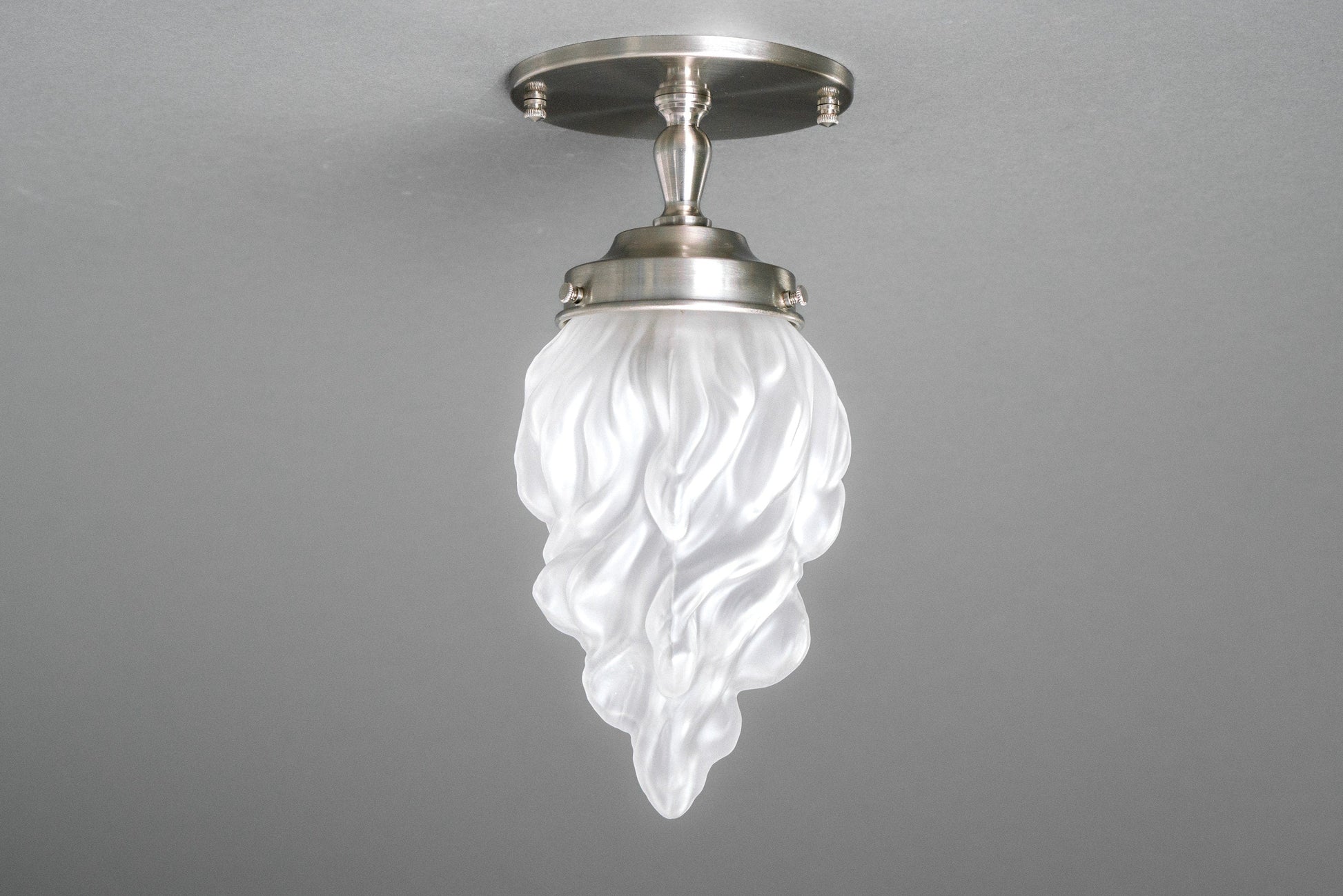 This semi-flush ceiling light fixture features a traditional Art Deco flame globe. This satin glass frosted globe was hand blown and resembles a crystal stalactite hanging from the ceiling.