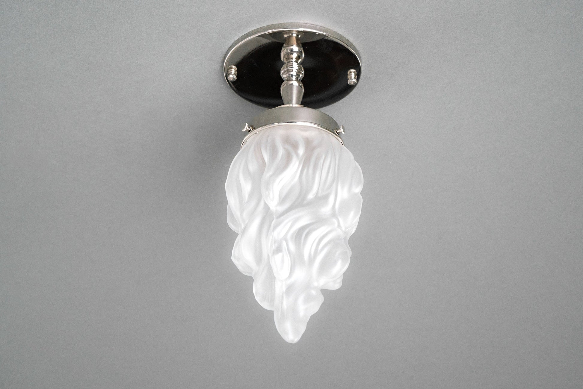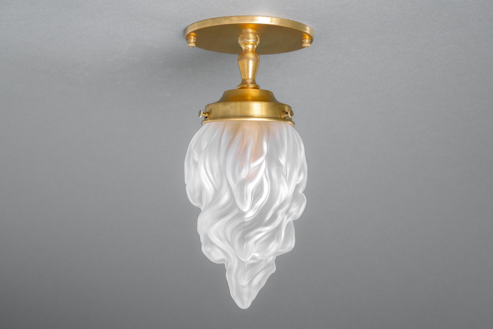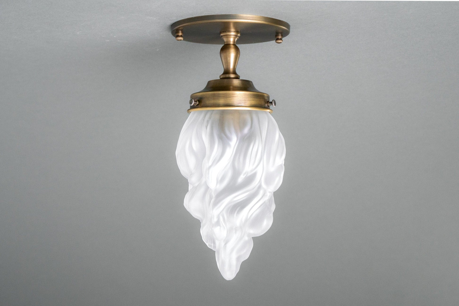 This semi-flush ceiling light fixture features a traditional Art Deco flame globe. This satin glass frosted globe was hand blown and resembles a crystal stalactite hanging from the ceiling.