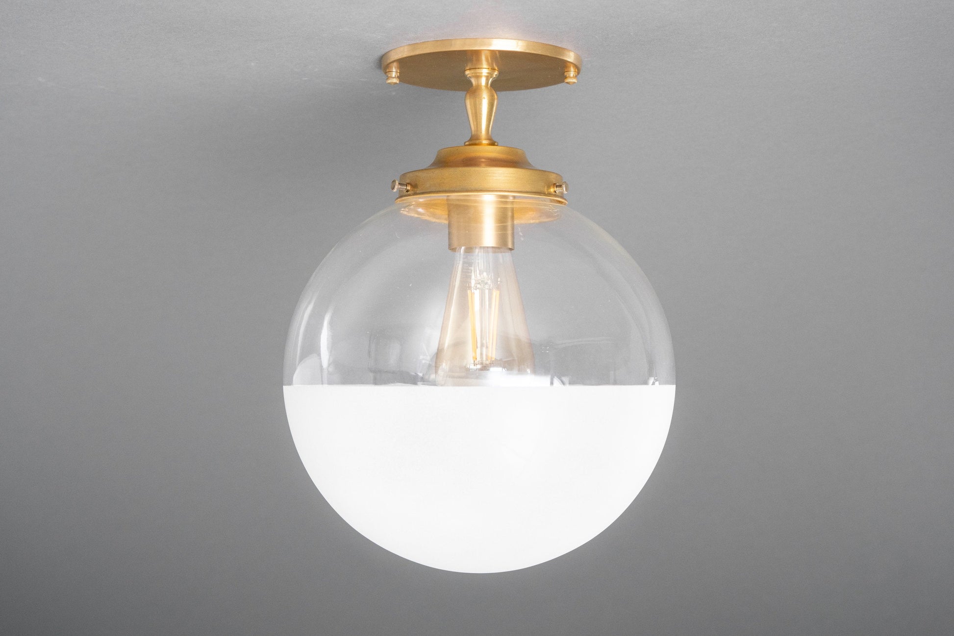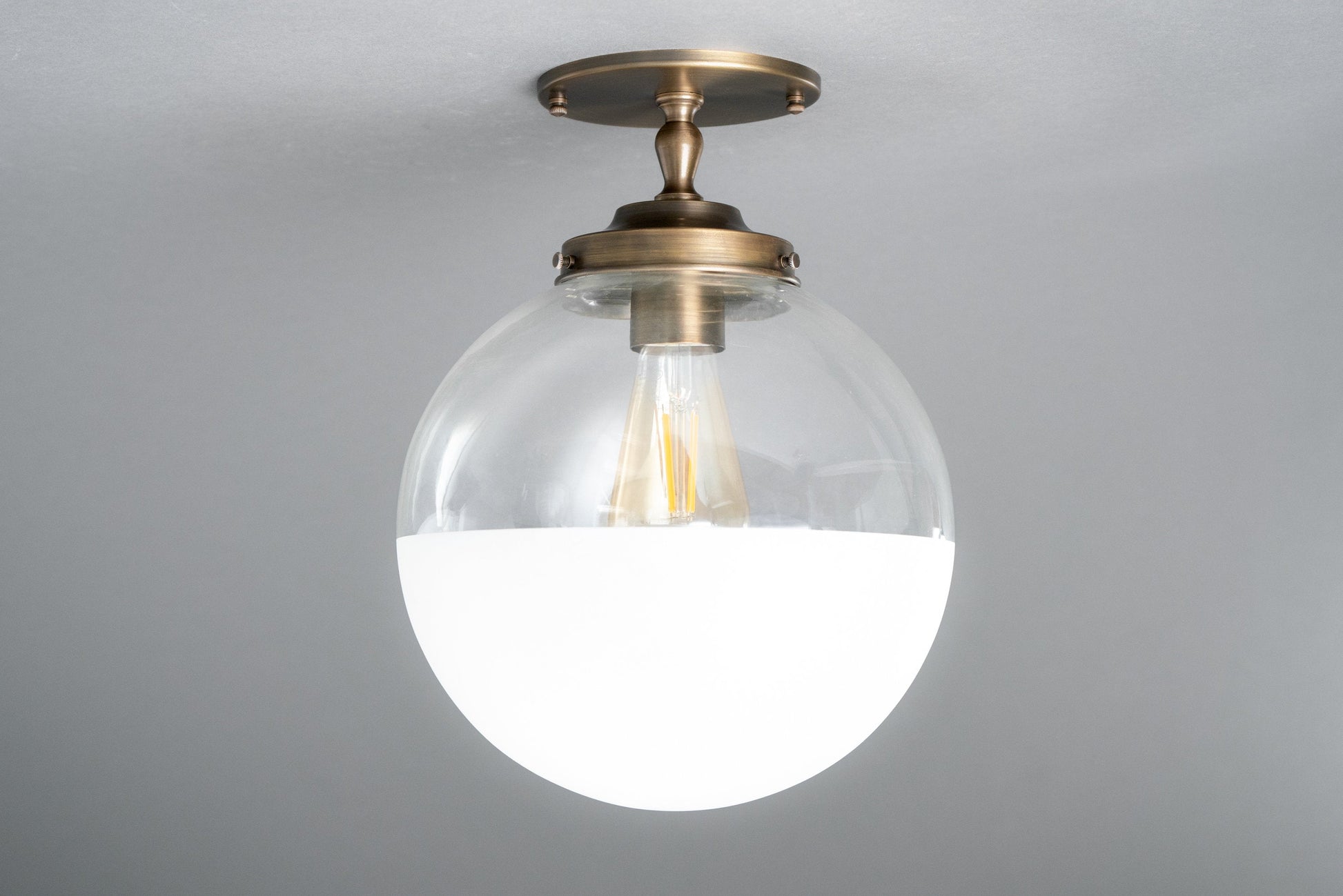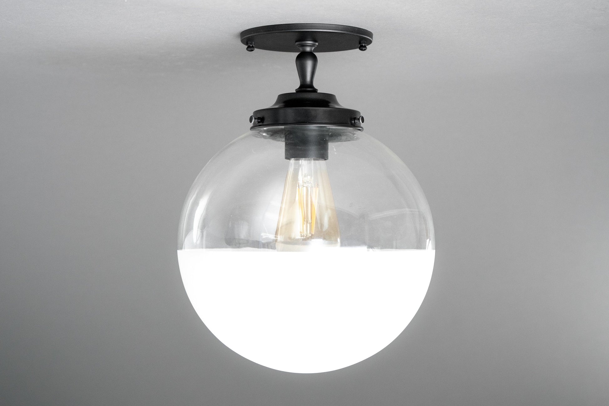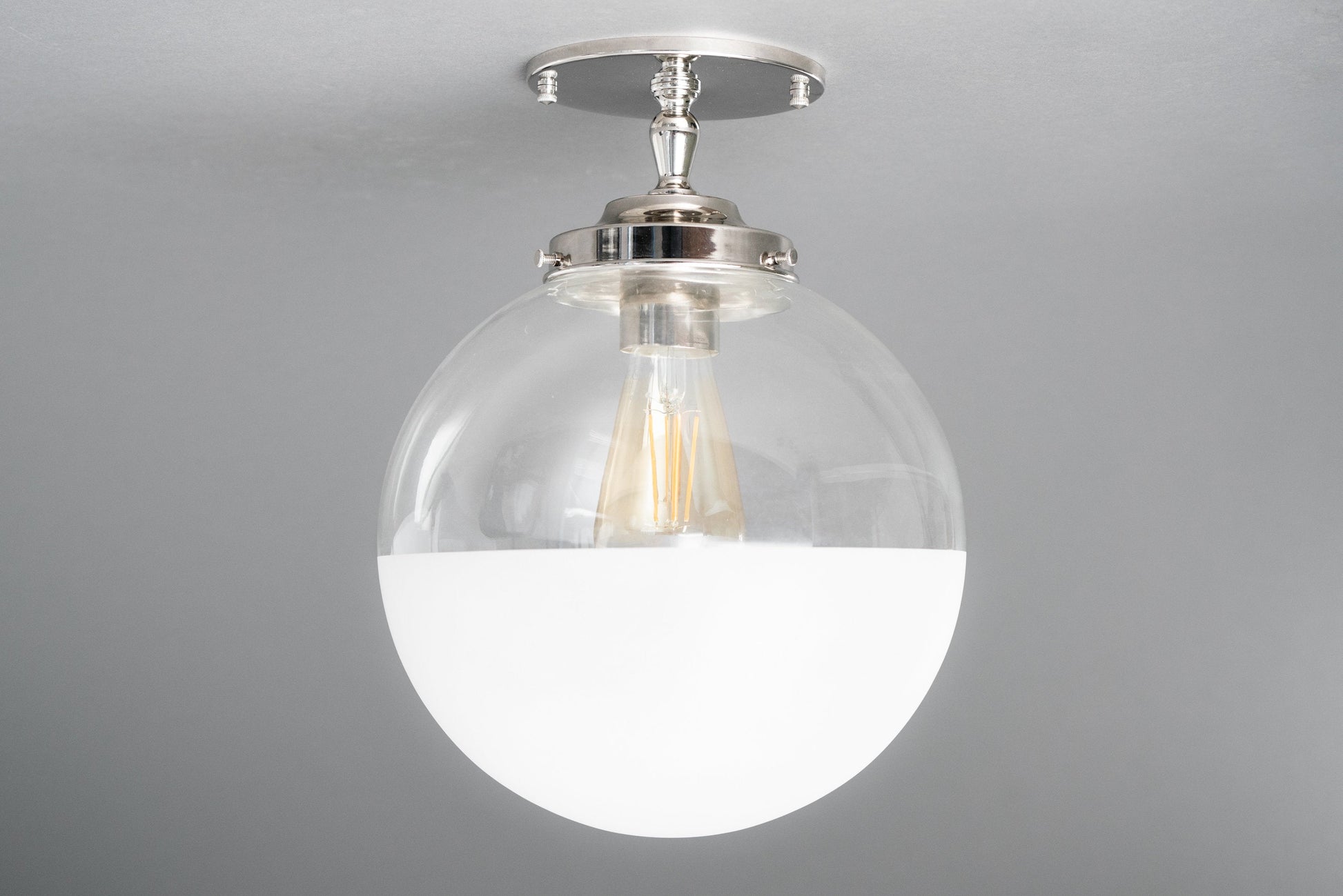 This Art Deco inspired semi-flush ceiling light features a thin canopy mounting plate and a 10inch glass globe. This unique globe is half white soft satin finish with clear gloss glass at the top.