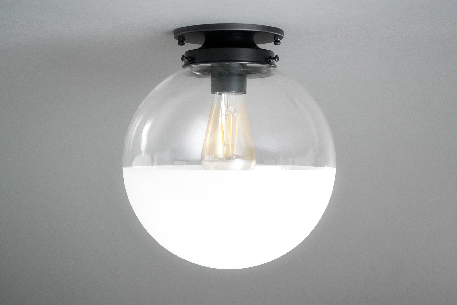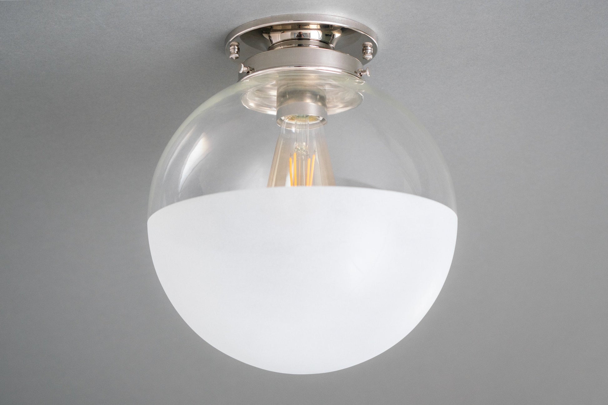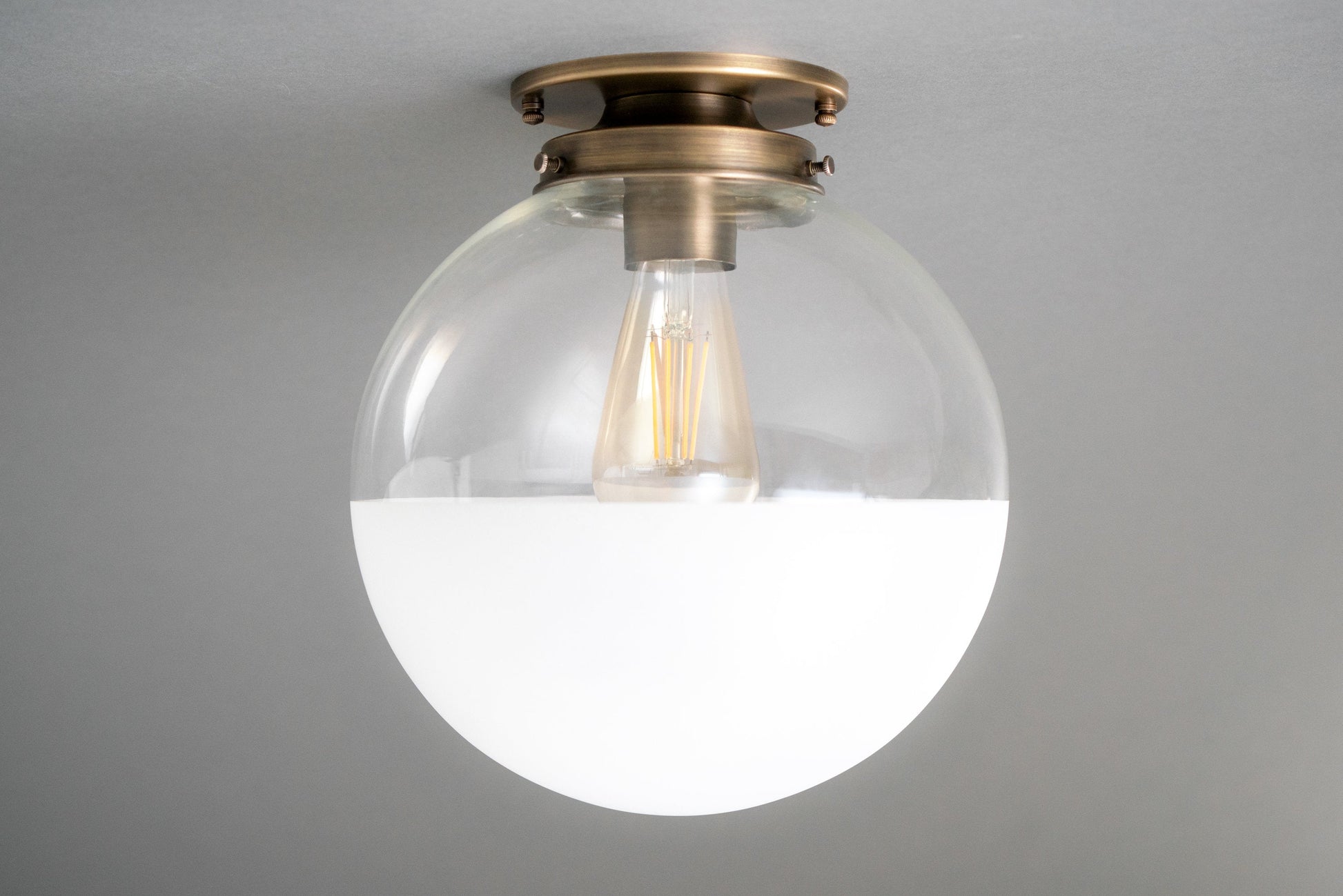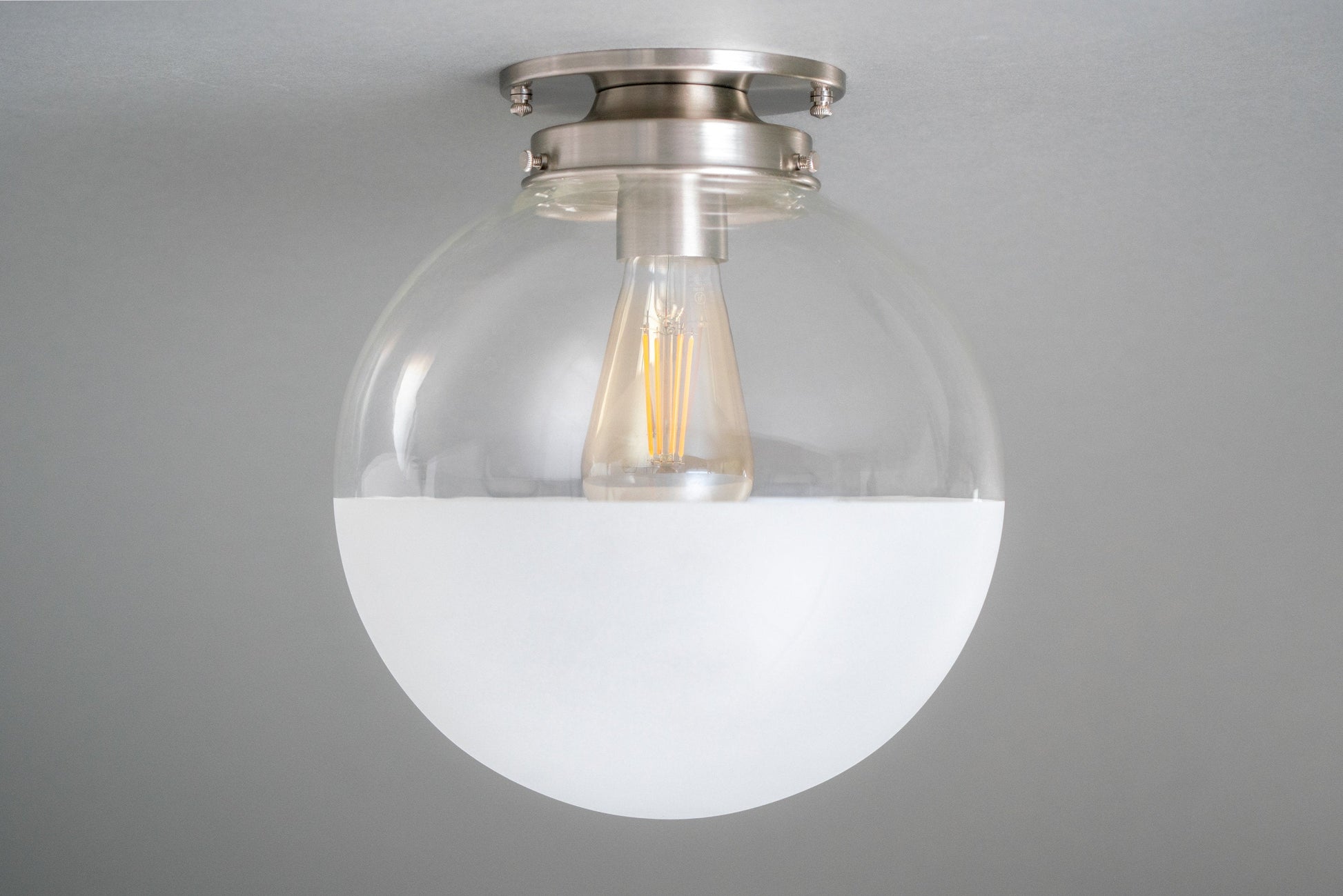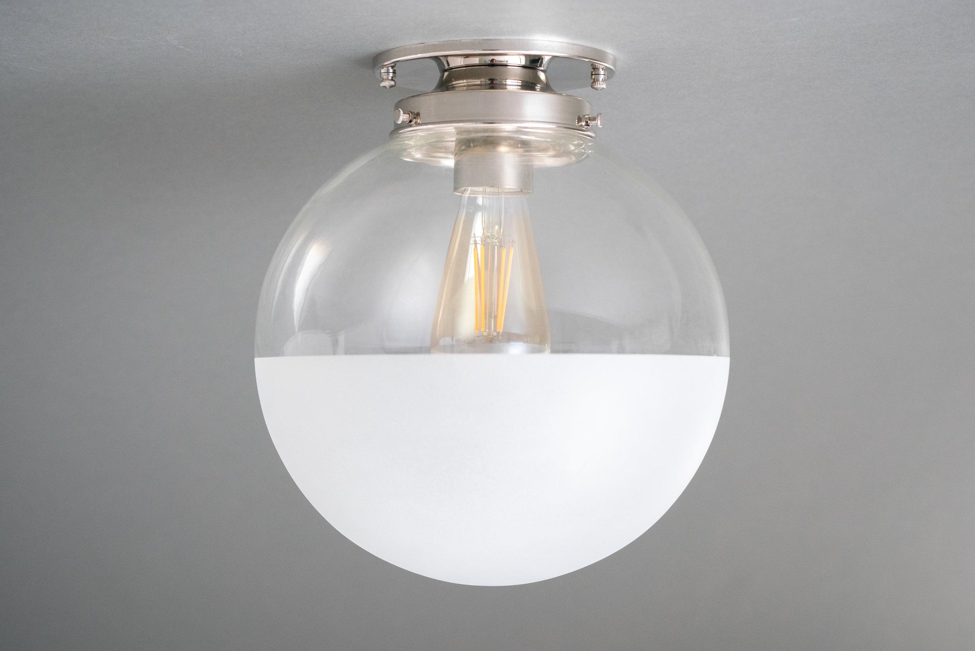 This Art Deco inspired ceiling light features a hand blown clear glass globe that has been decoratively half frosted. The light texture frosting gives the bottom of the globe a soft matte white look.