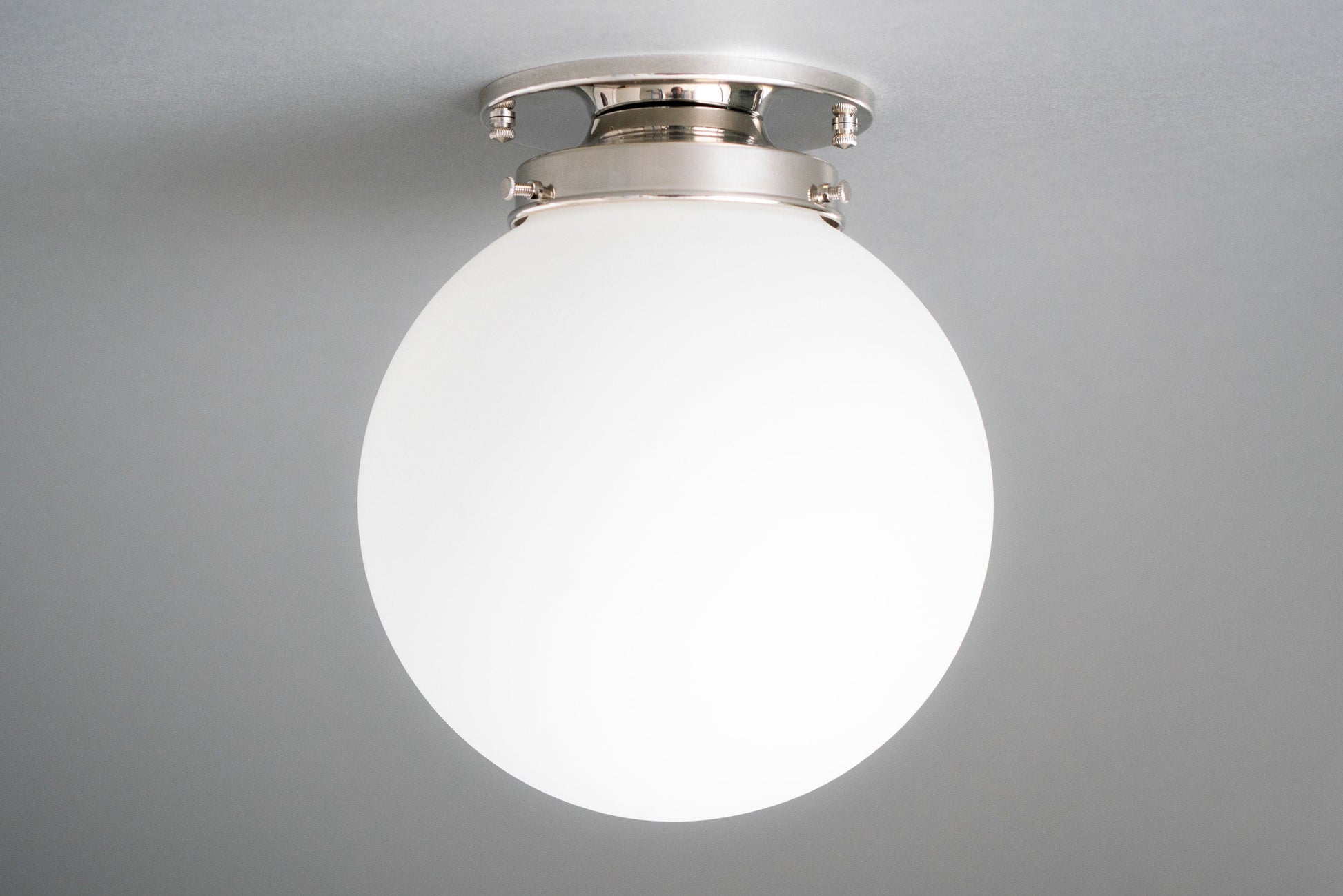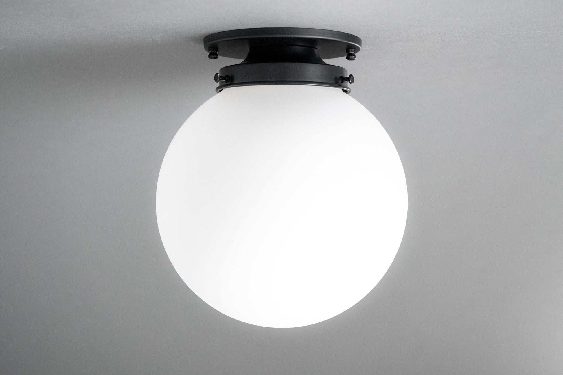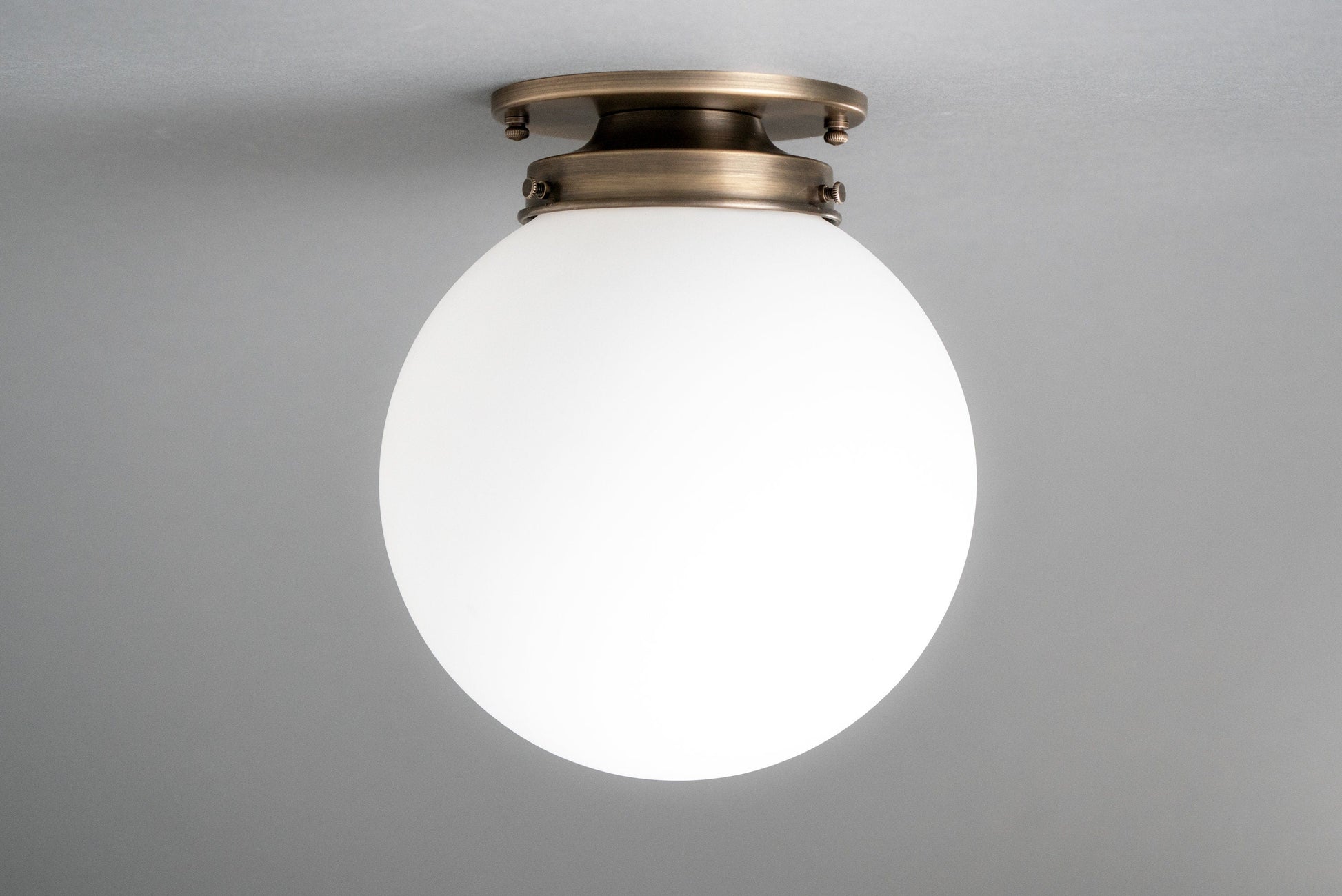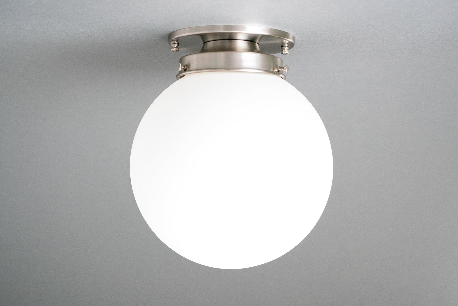 This Art Deco flush ceiling light features an 8inch satin glass globe. This delicate white globe is lightly textured giving it a soft matte look.