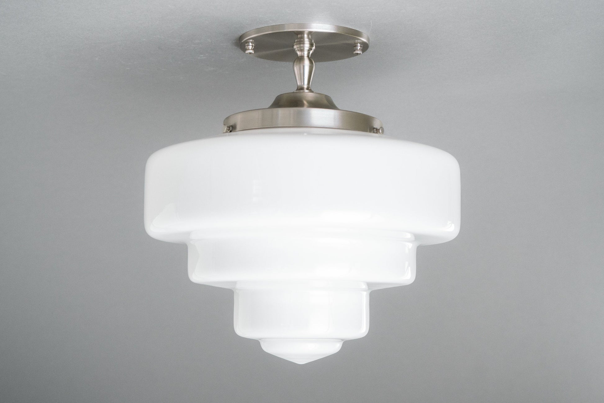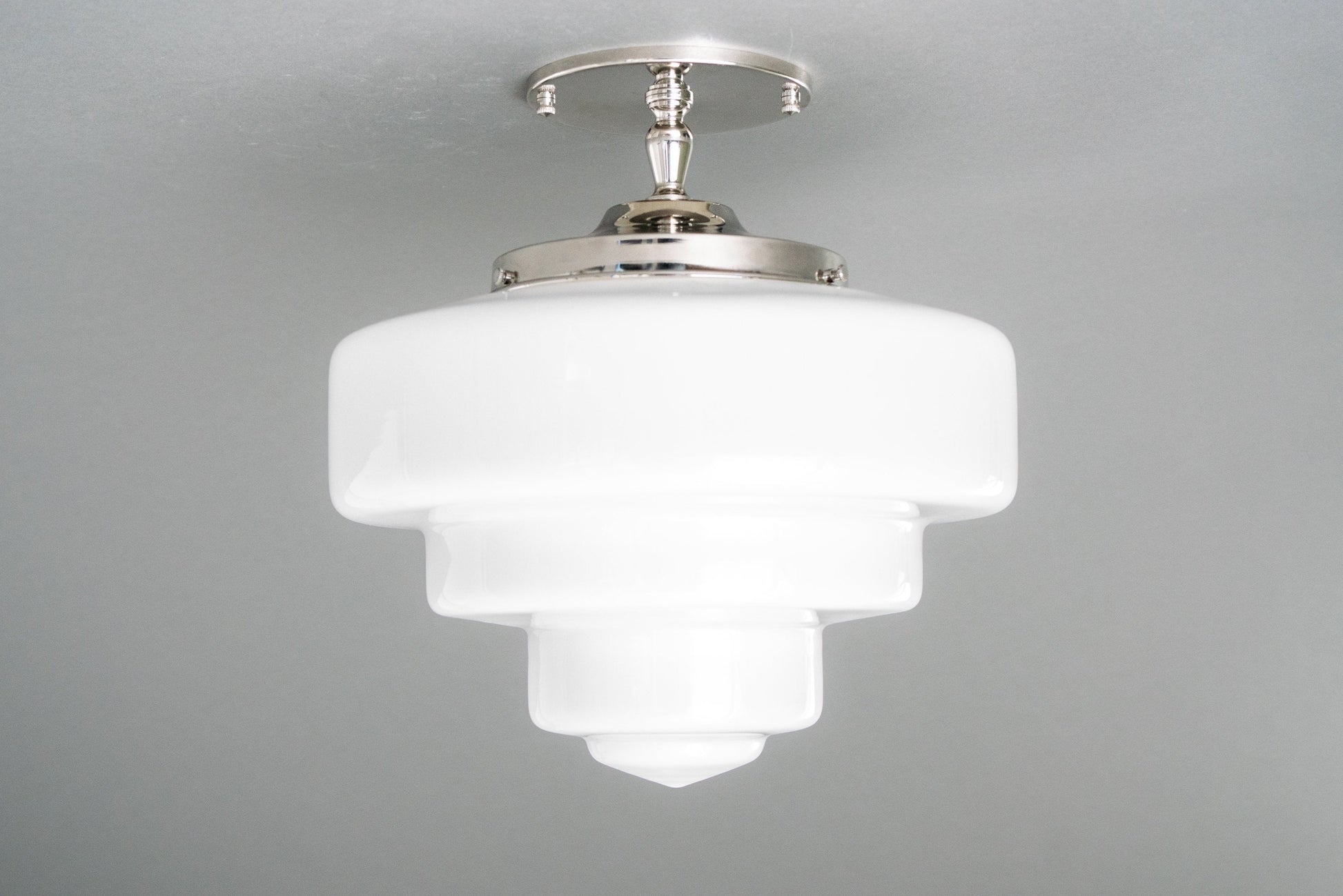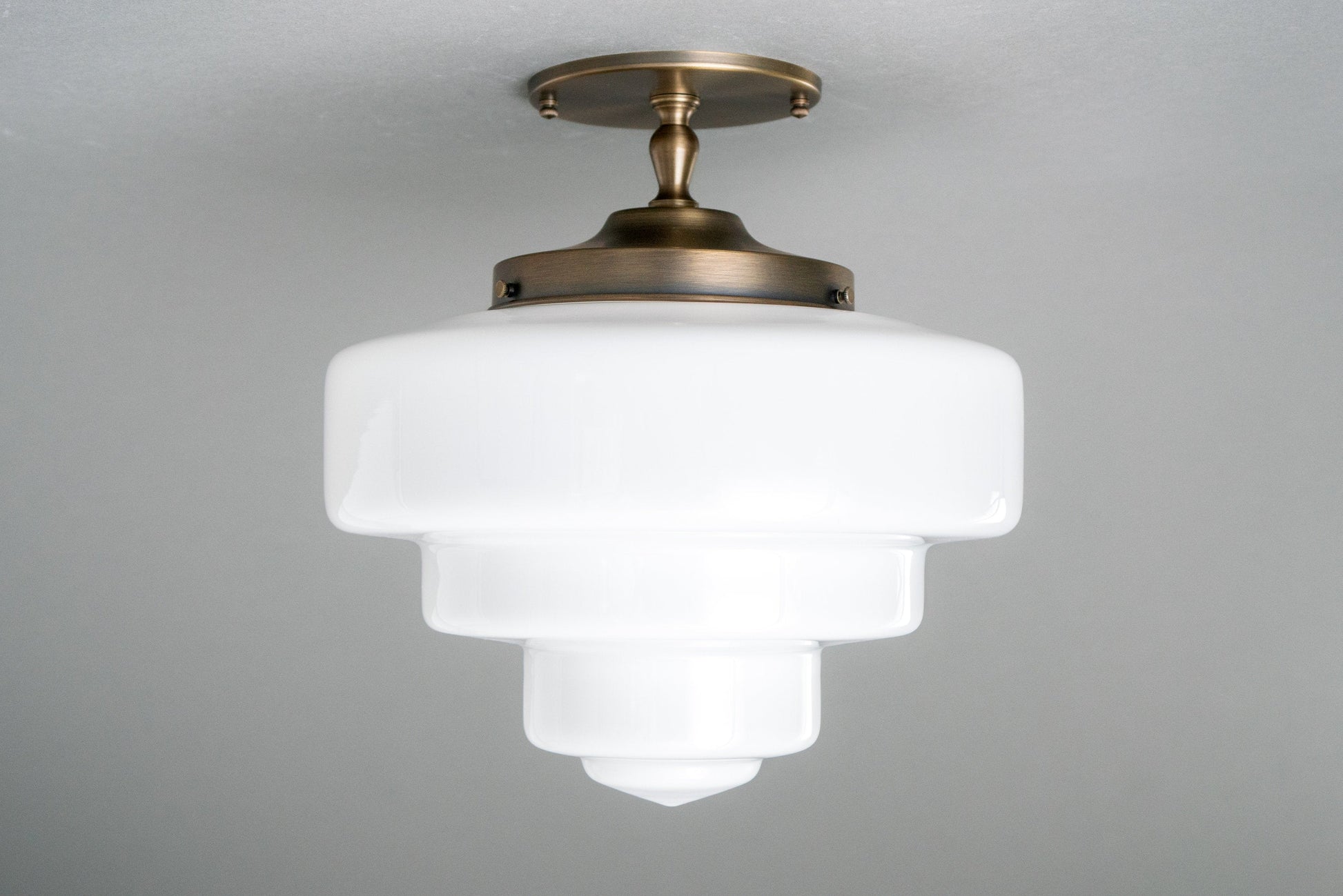 This semi-flush ceiling light features a traditional Art Deco white opal milk glass wedding cake style globe. This thick glass globe was hand blown in an American glass foundry.