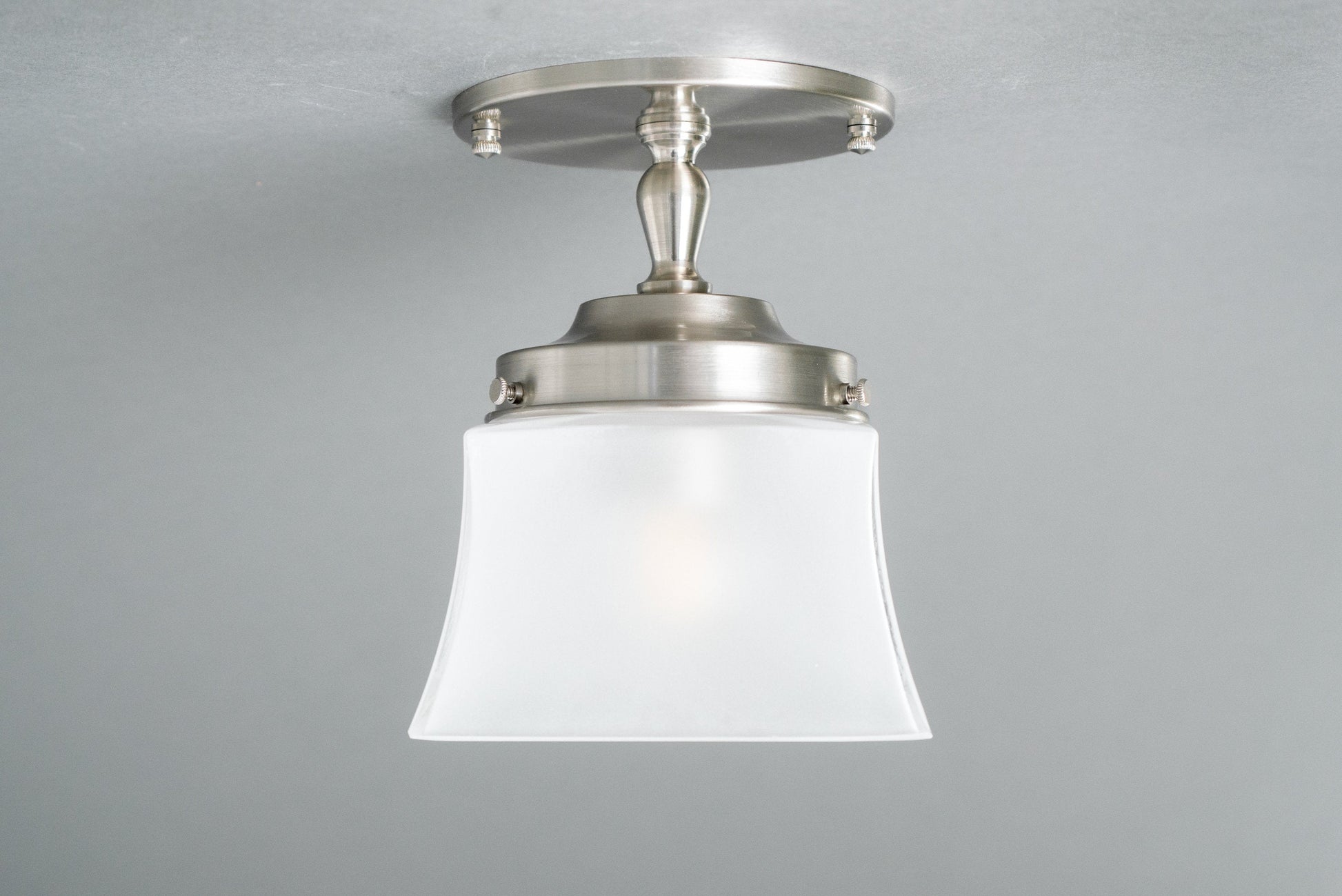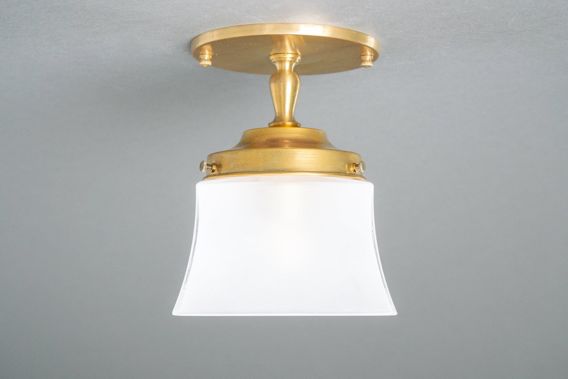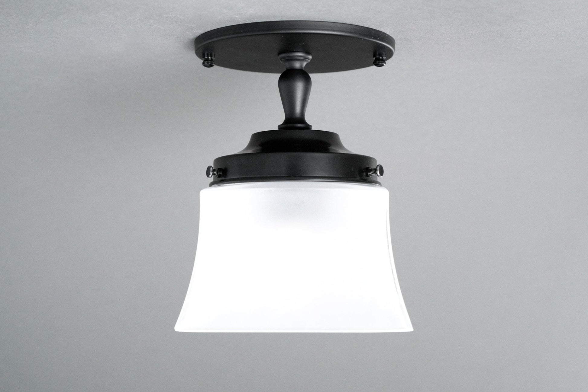 This semi-flush ceiling light features a flared mission style shade. This glass shade is satin etched on the inside and gloss finish on the outside giving the shade a soft white look.