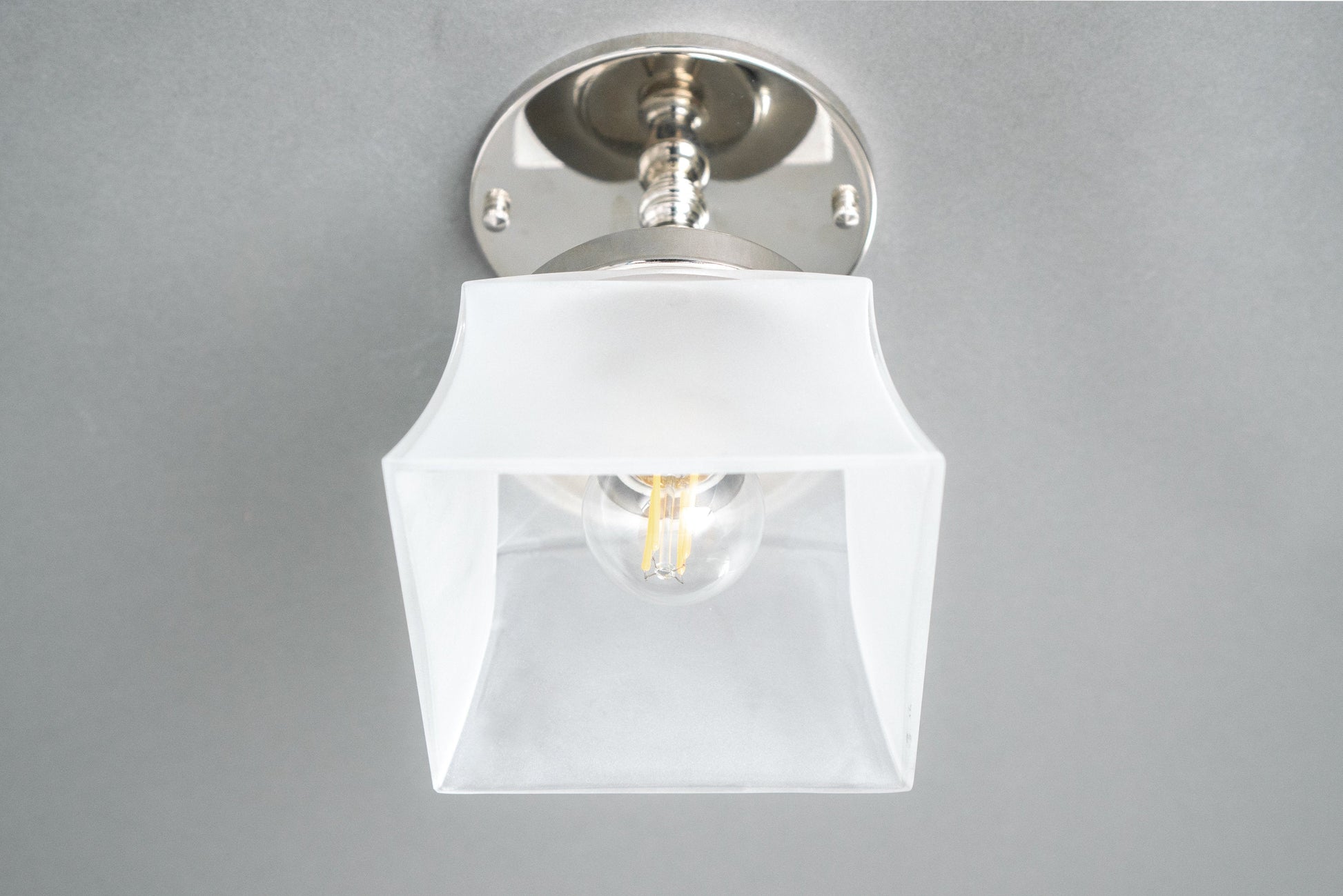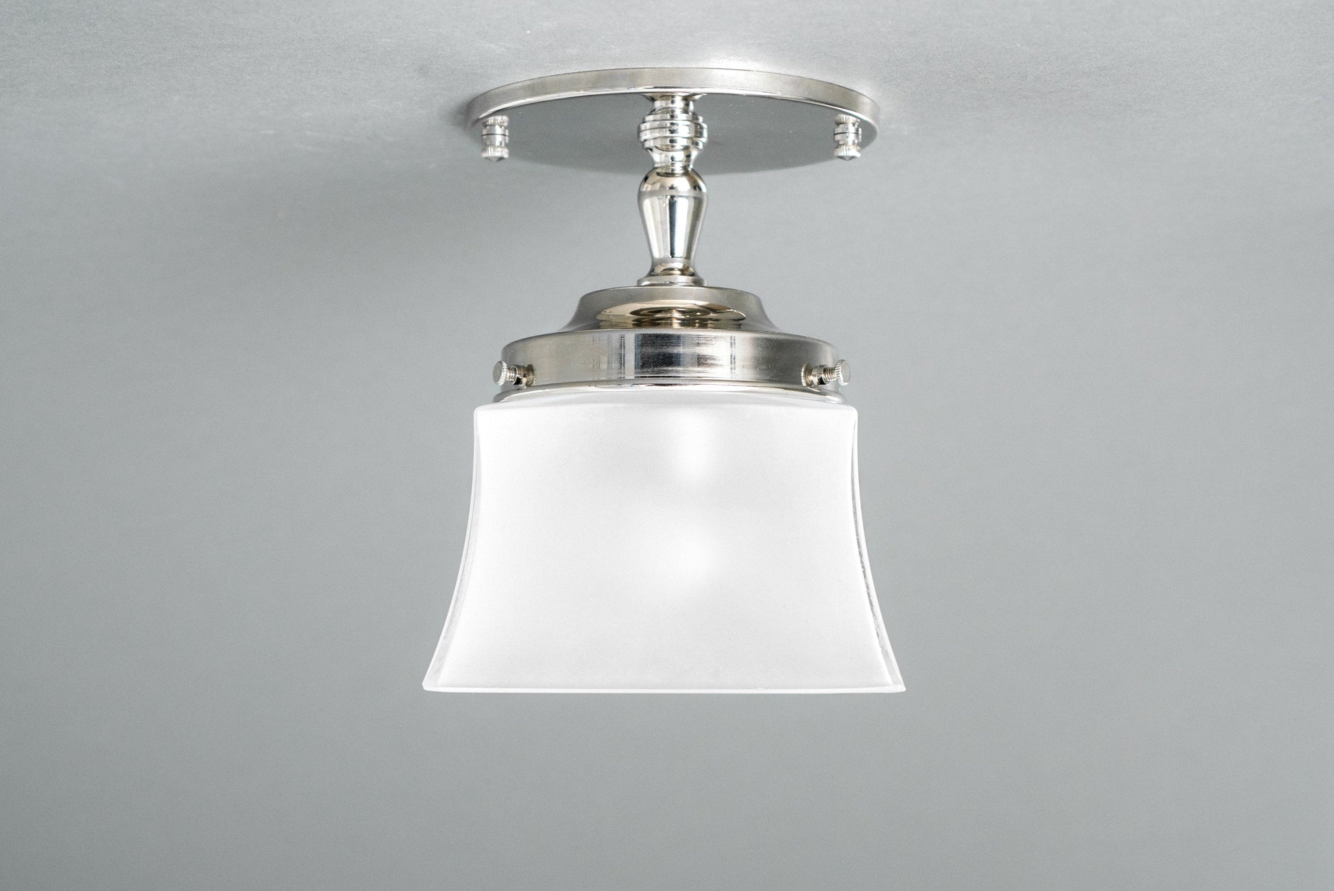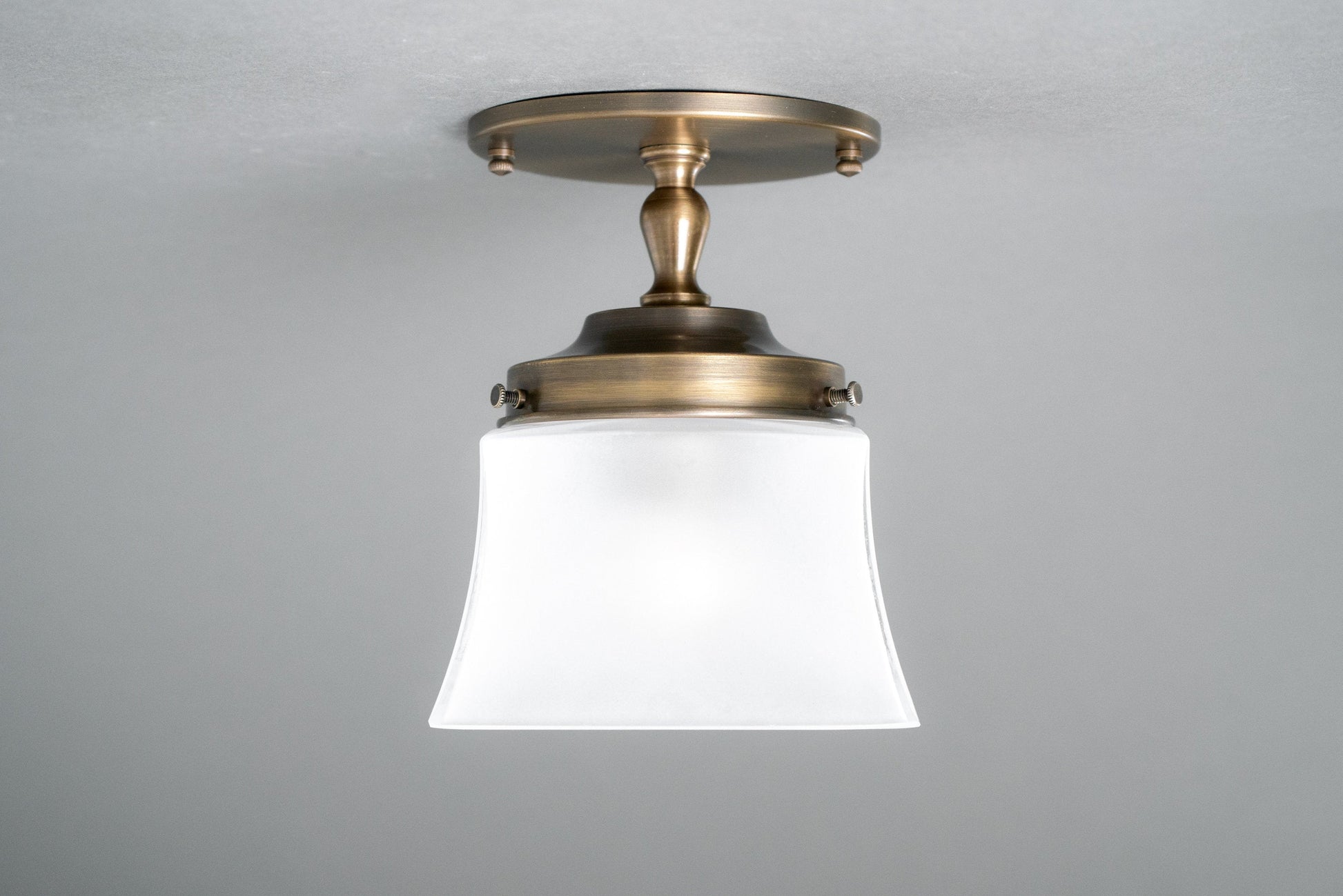 This semi-flush ceiling light features a flared mission style shade. This glass shade is satin etched on the inside and gloss finish on the outside giving the shade a soft white look.