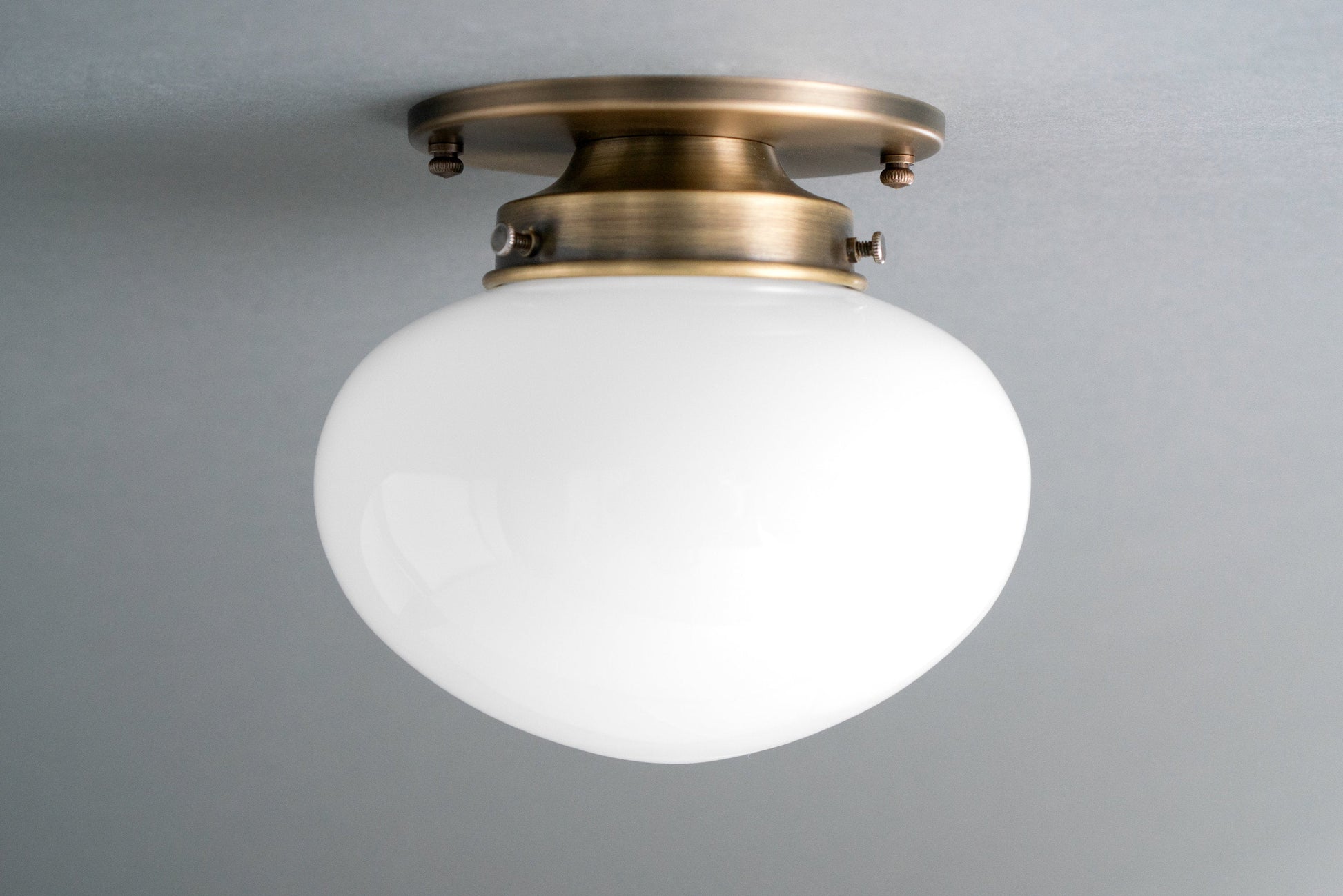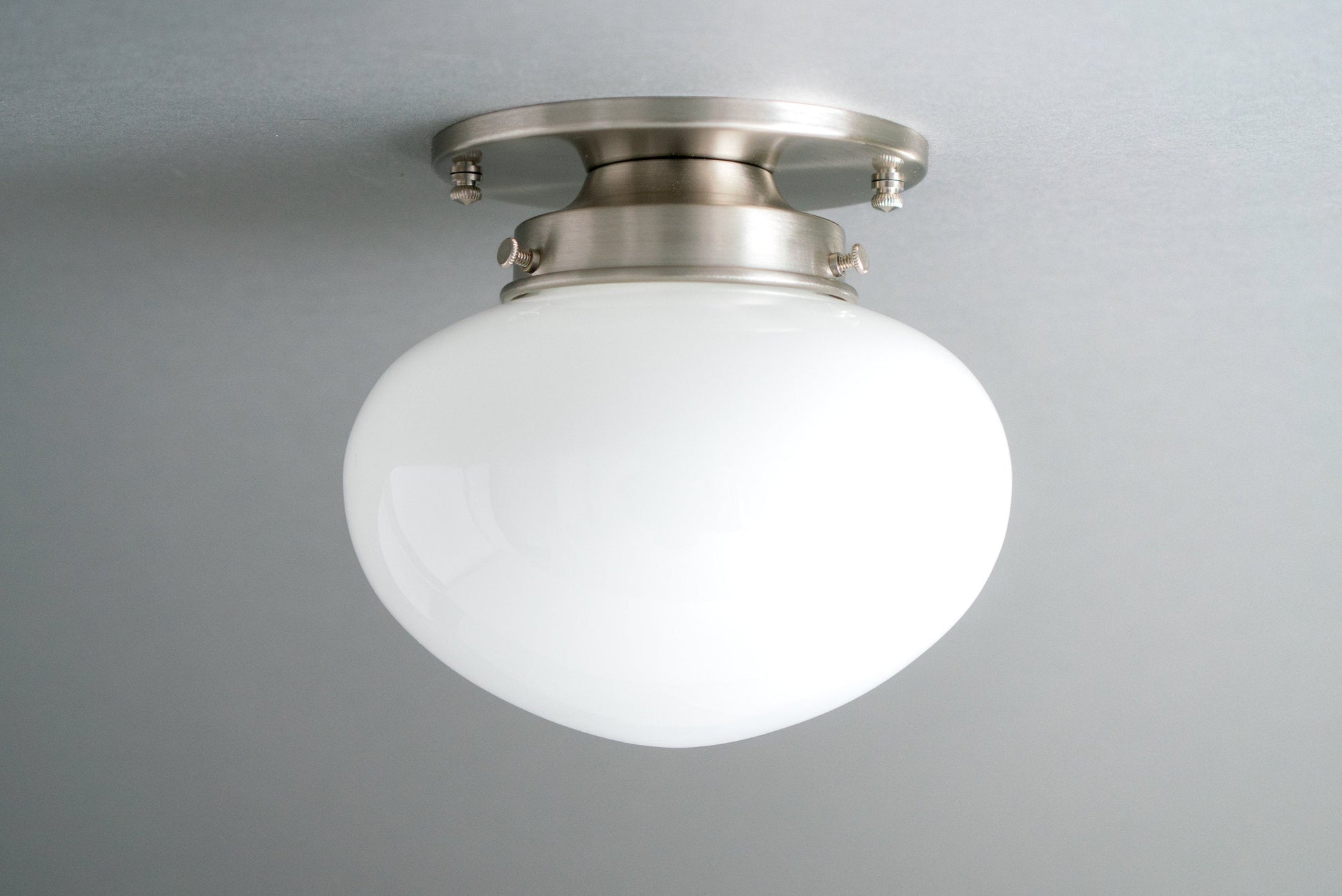 This flush Art Deco inspired ceiling light features a white opal glass mushroom shaped bubble globe. The globe was hand blown in an American glass foundry.