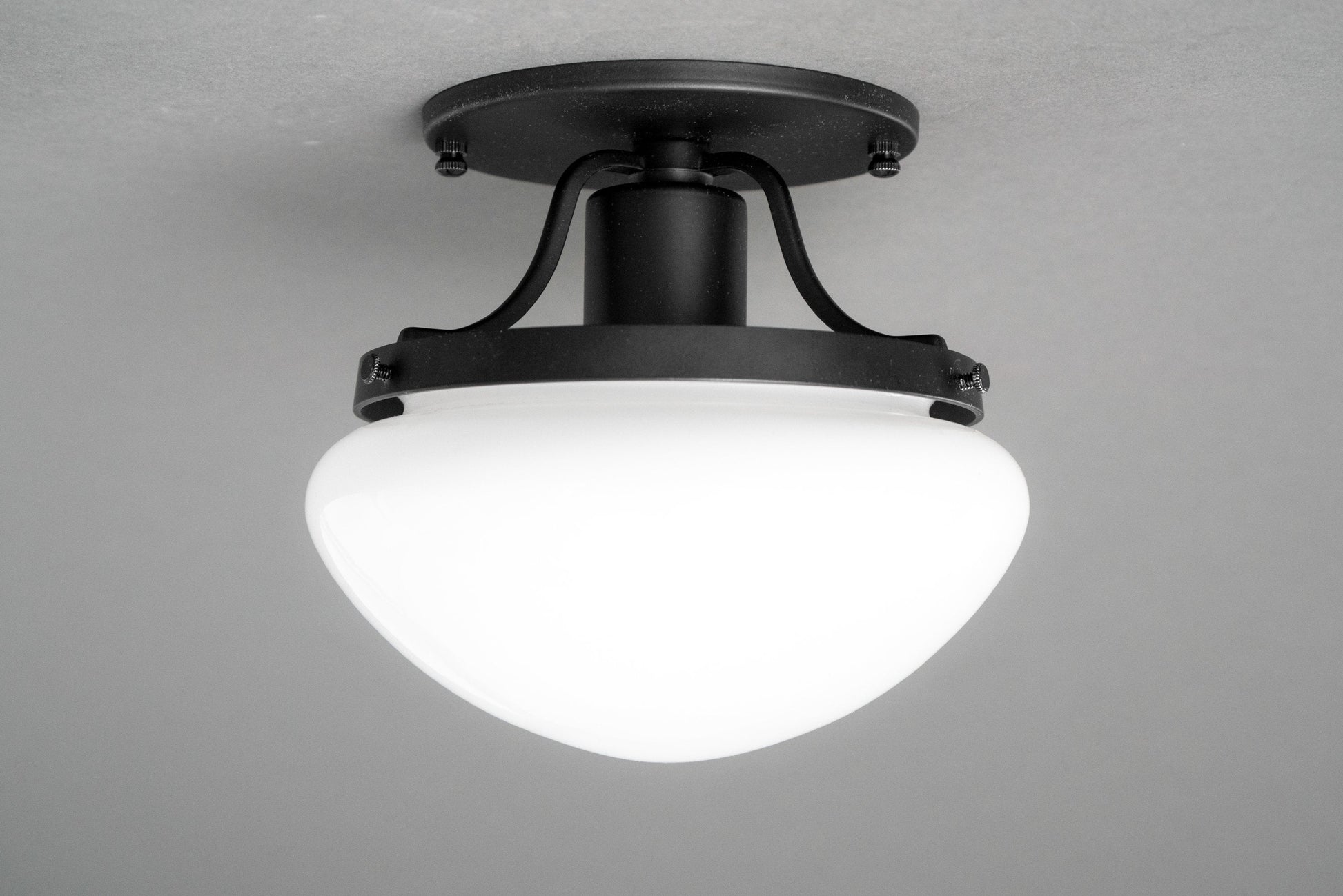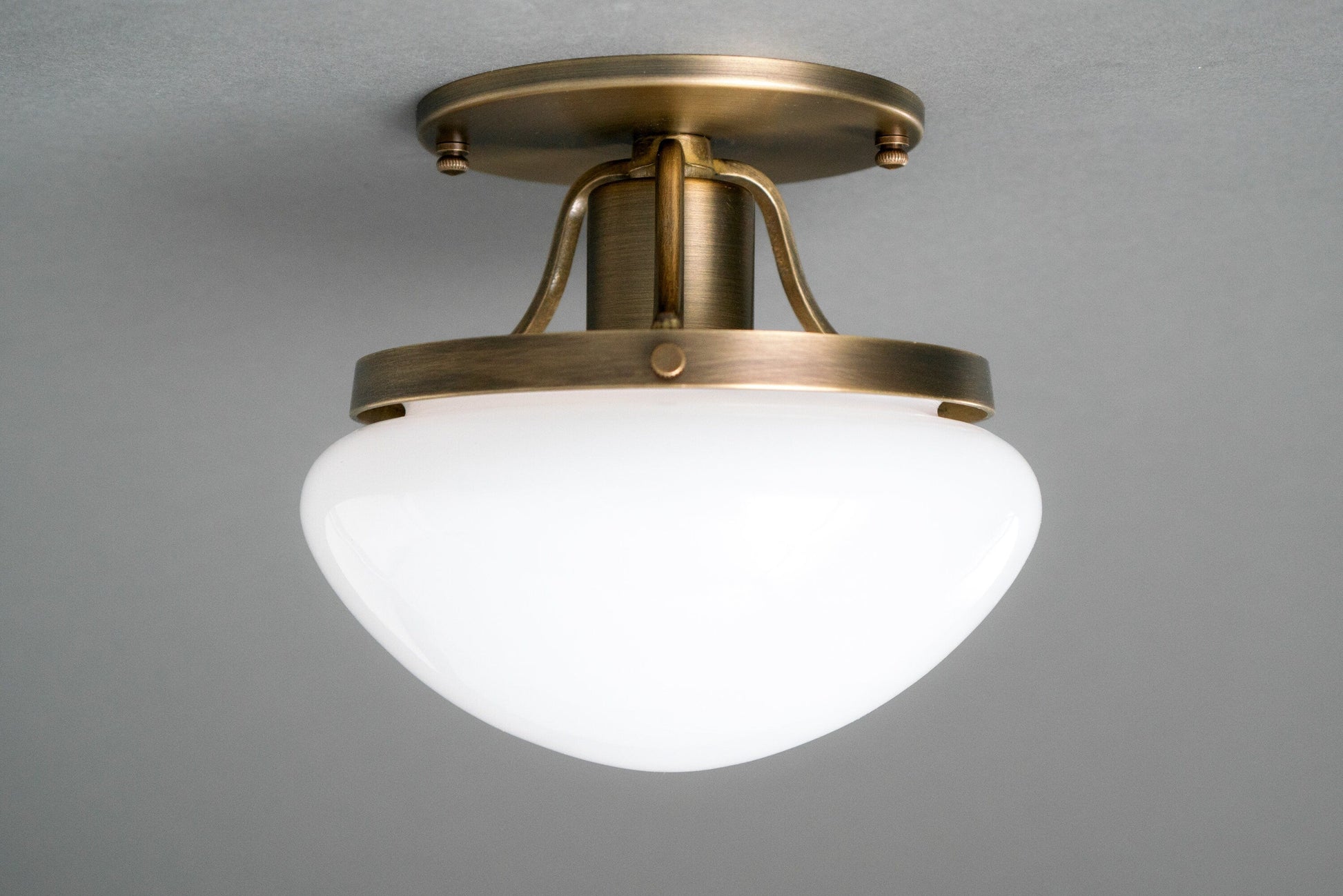 This flush Art Deco ceiling light features a cast brass decorative holder and a white glass mushroom shaped dome shade.